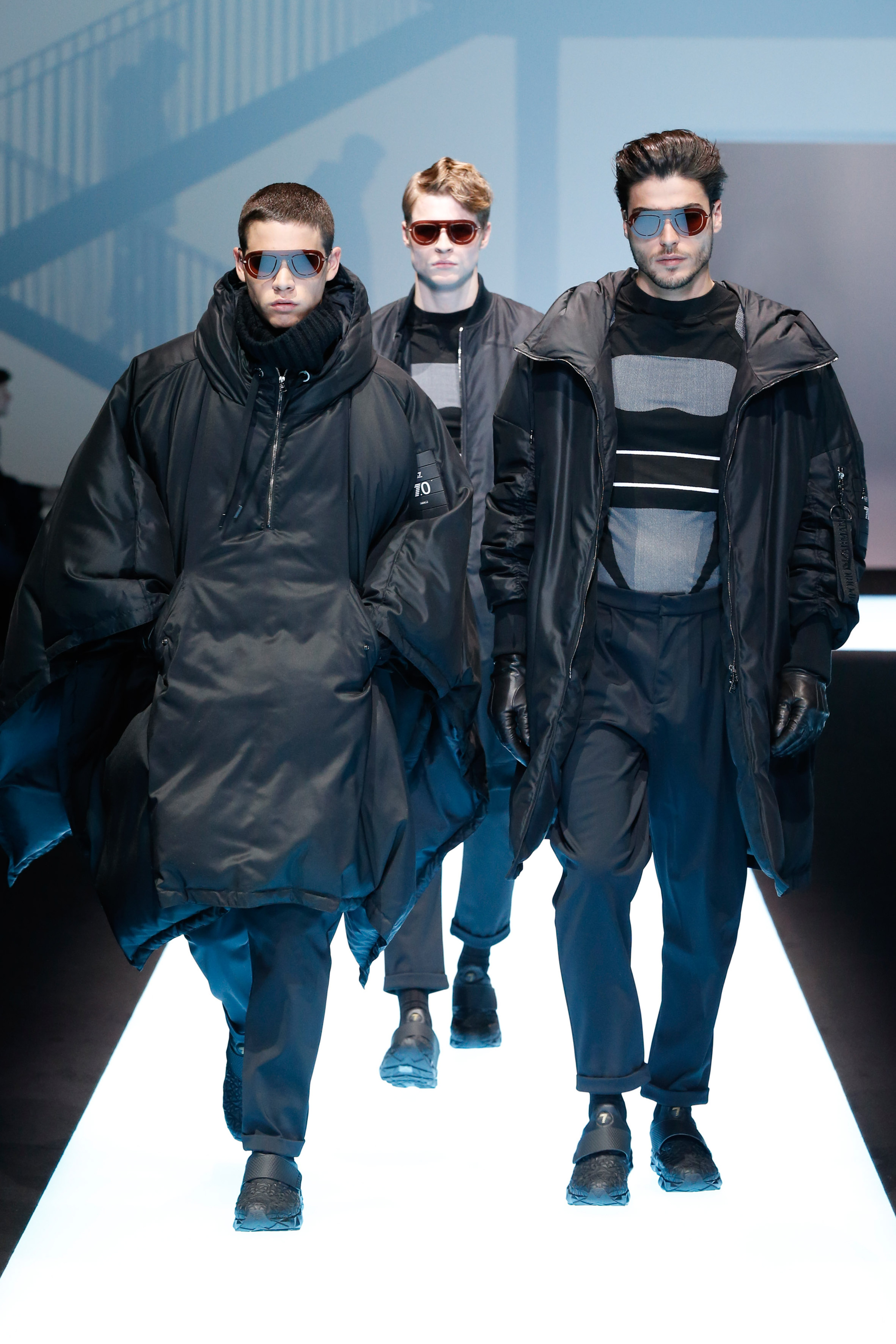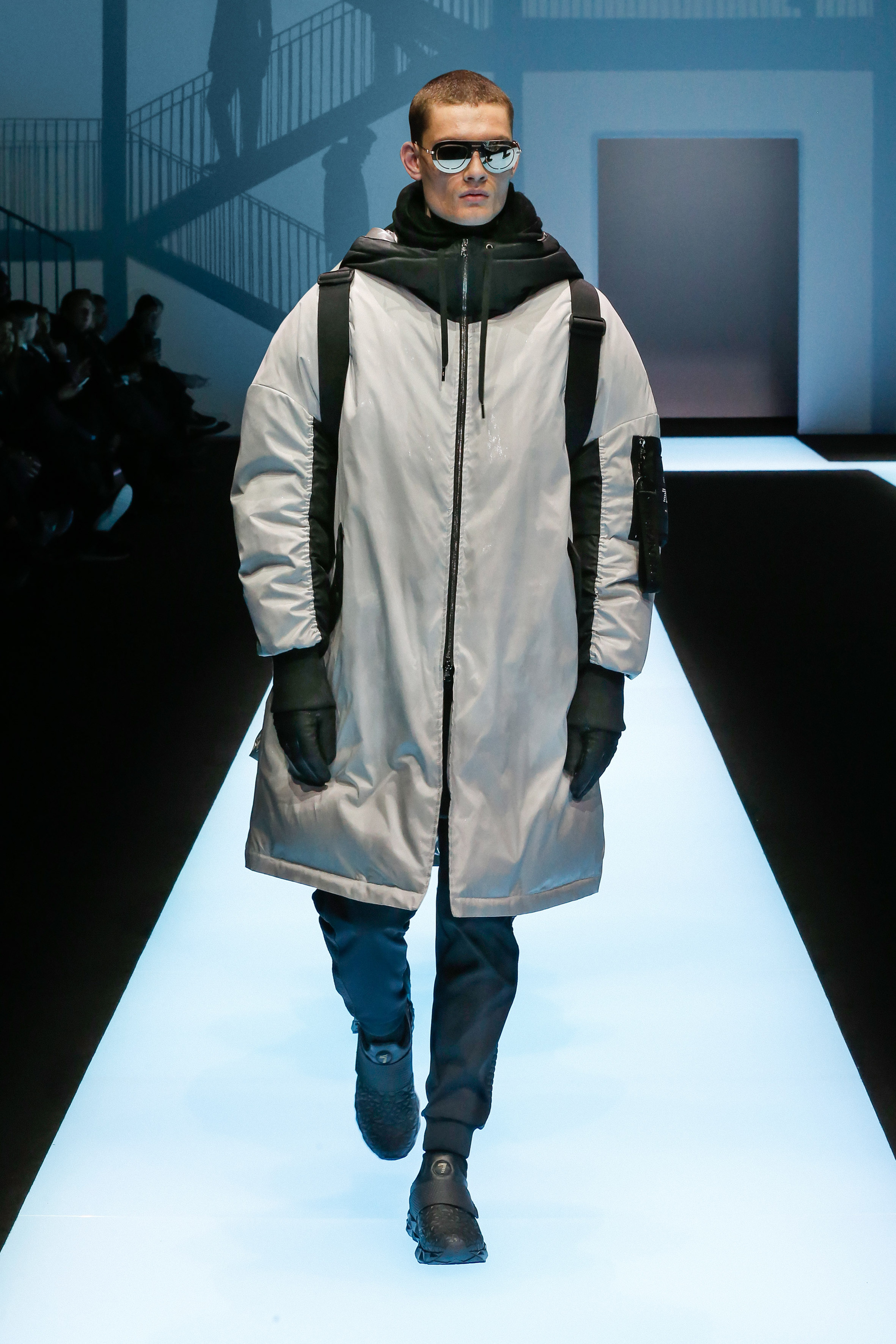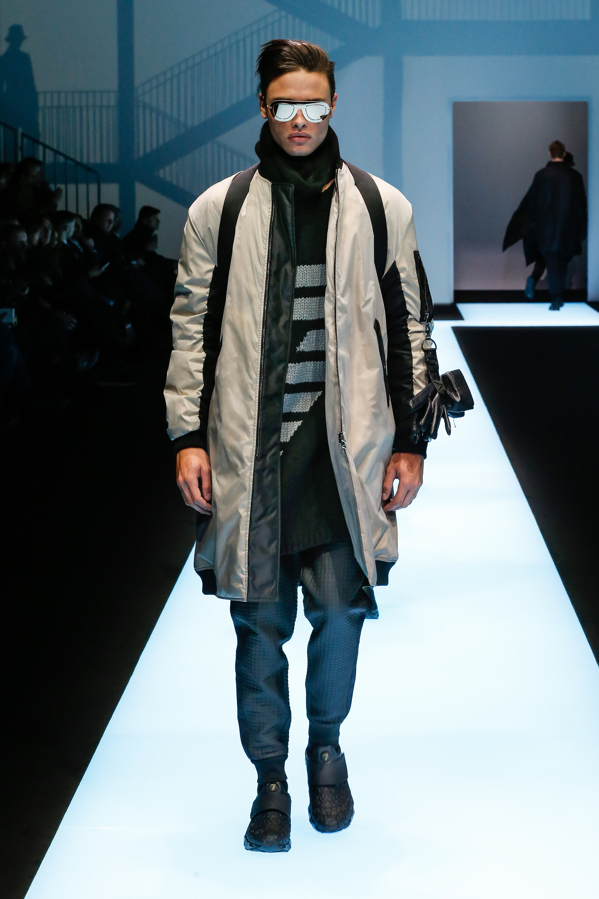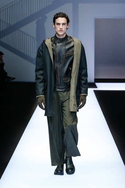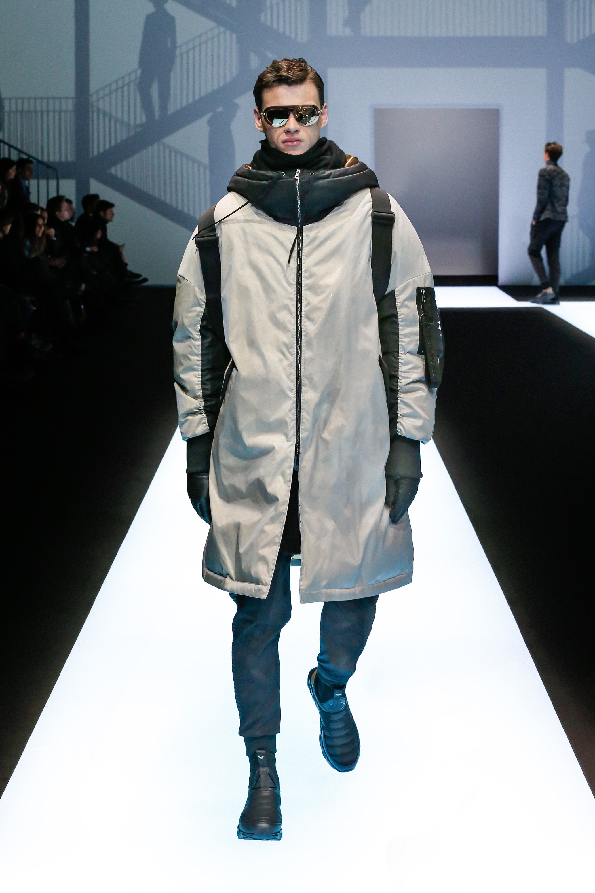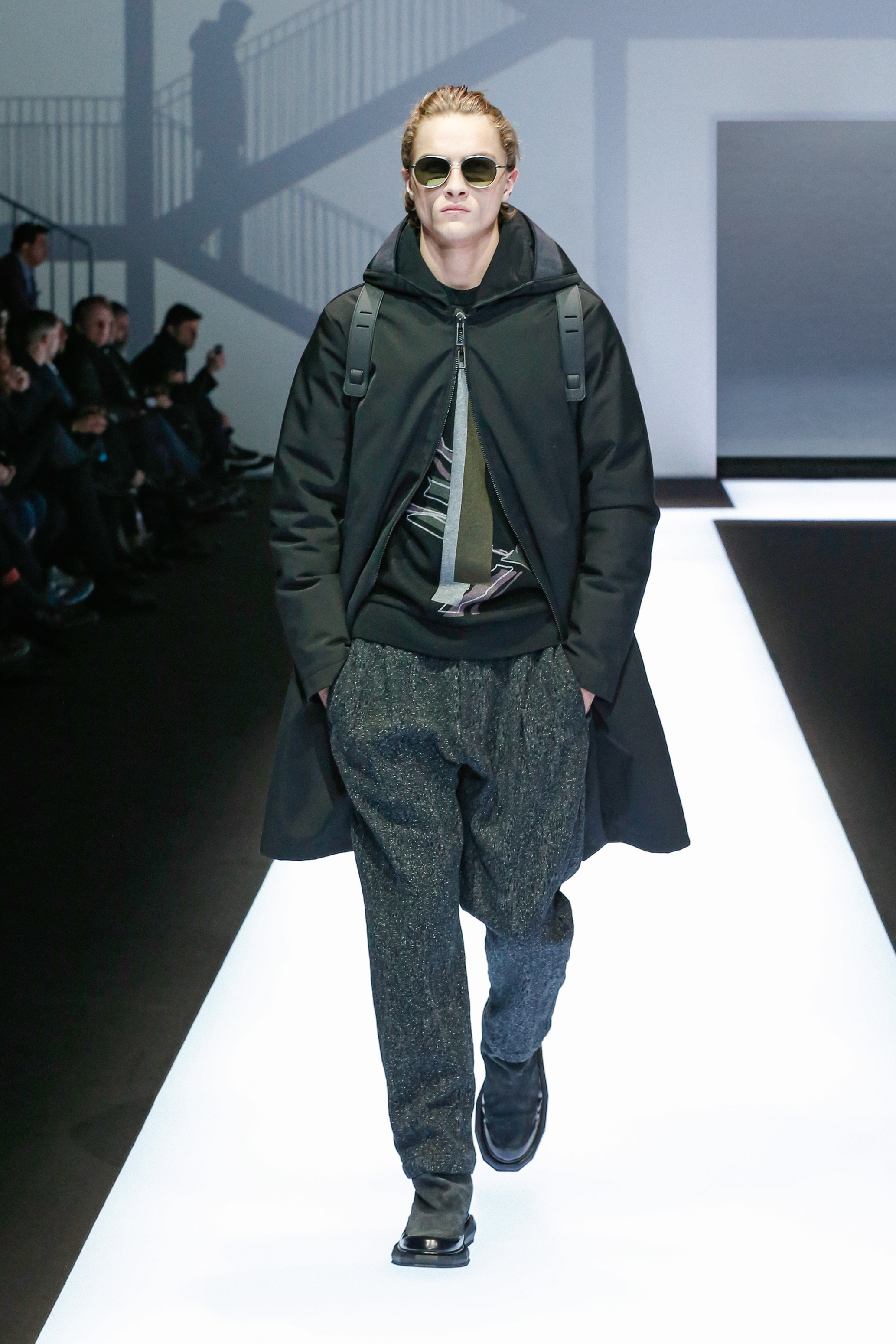 La palette de couleur oscille du noir intense au gris clair, à laquelle s’ajoutent des tons plus naturels comme le kaki et le bleu. Les chapeaux et lunettes de soleil sont nombreux en tant qu’accessoires. Les parkas restent elles dans les tons clairs et apportent de la fraîcheur aux tenues.