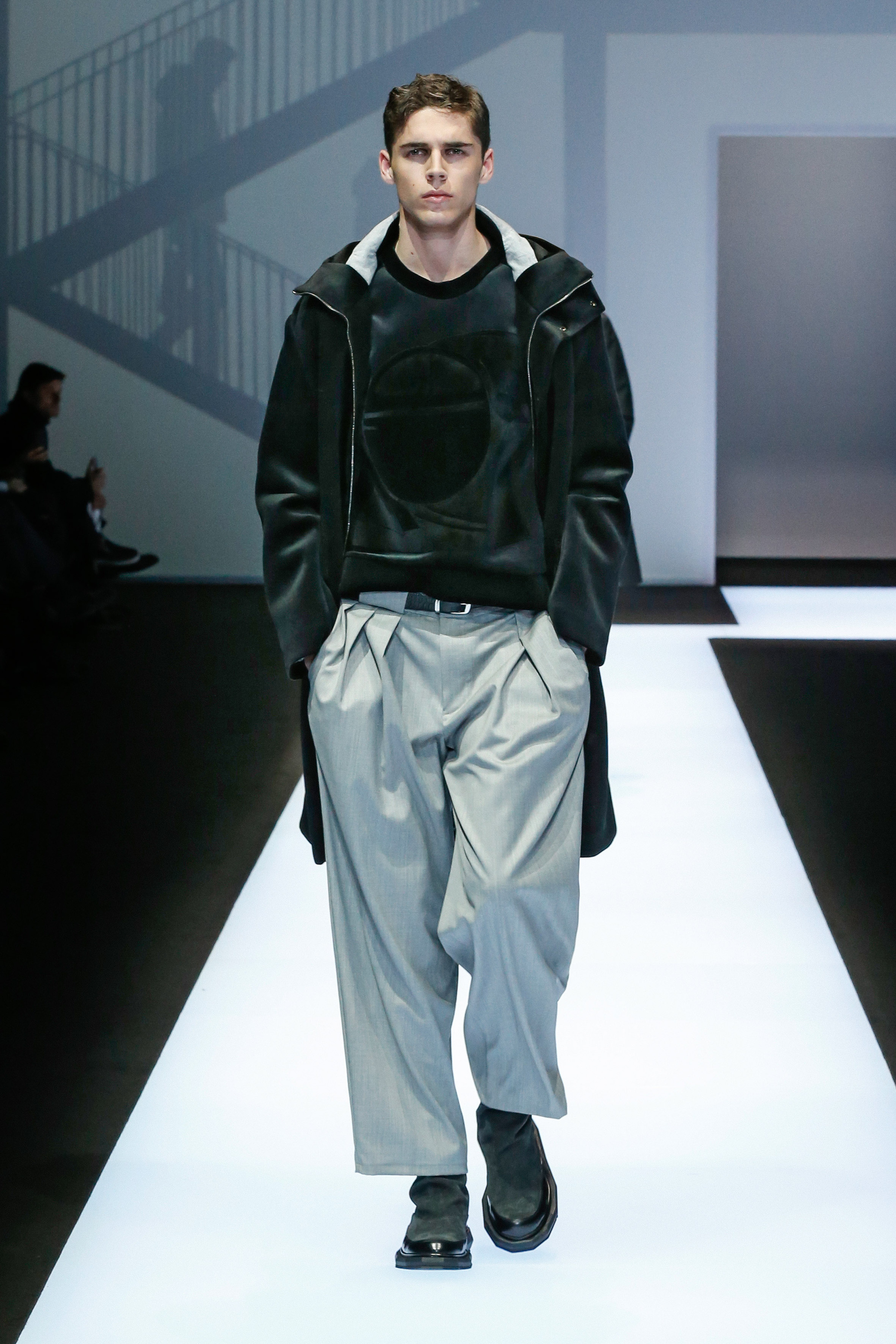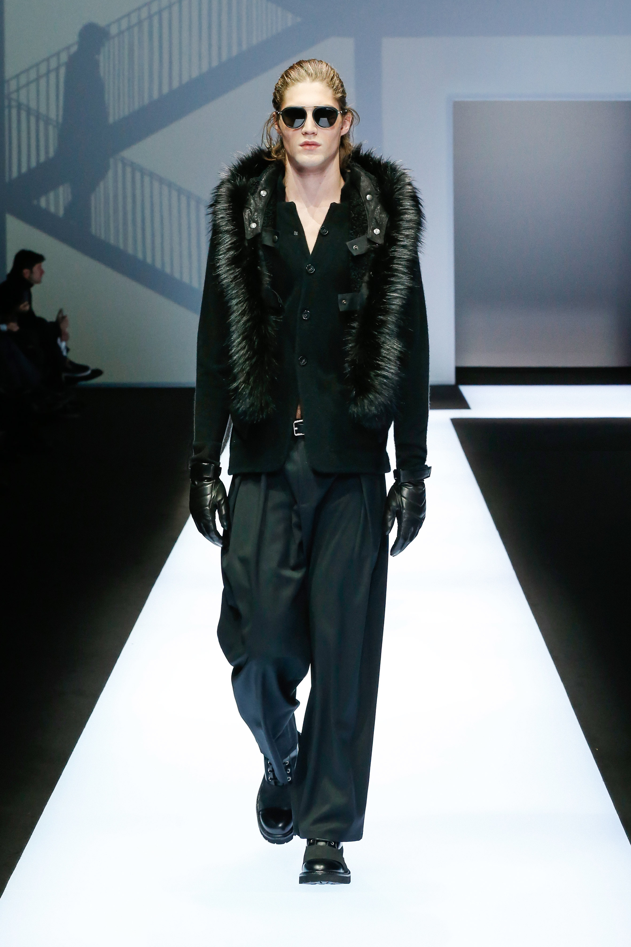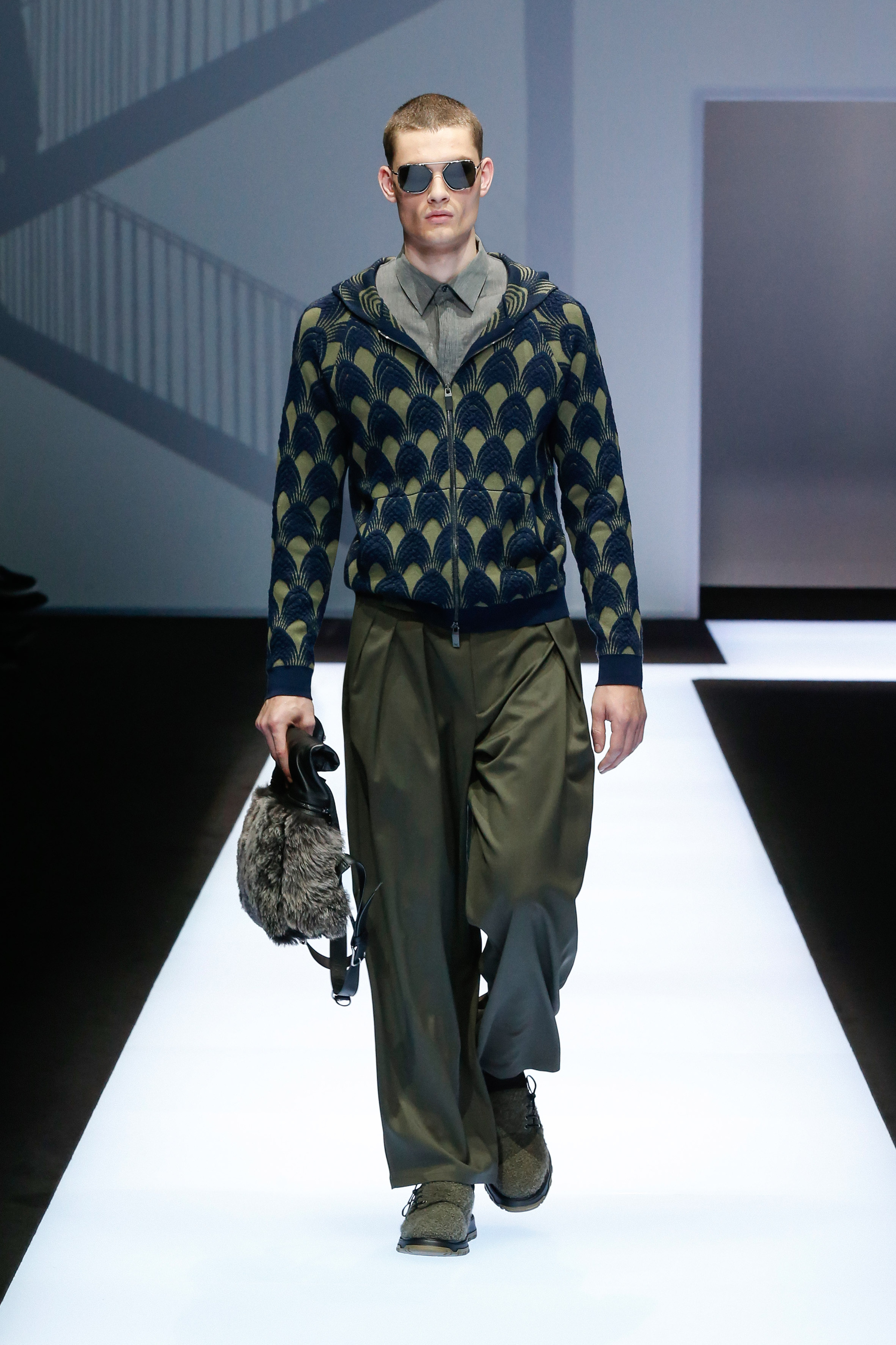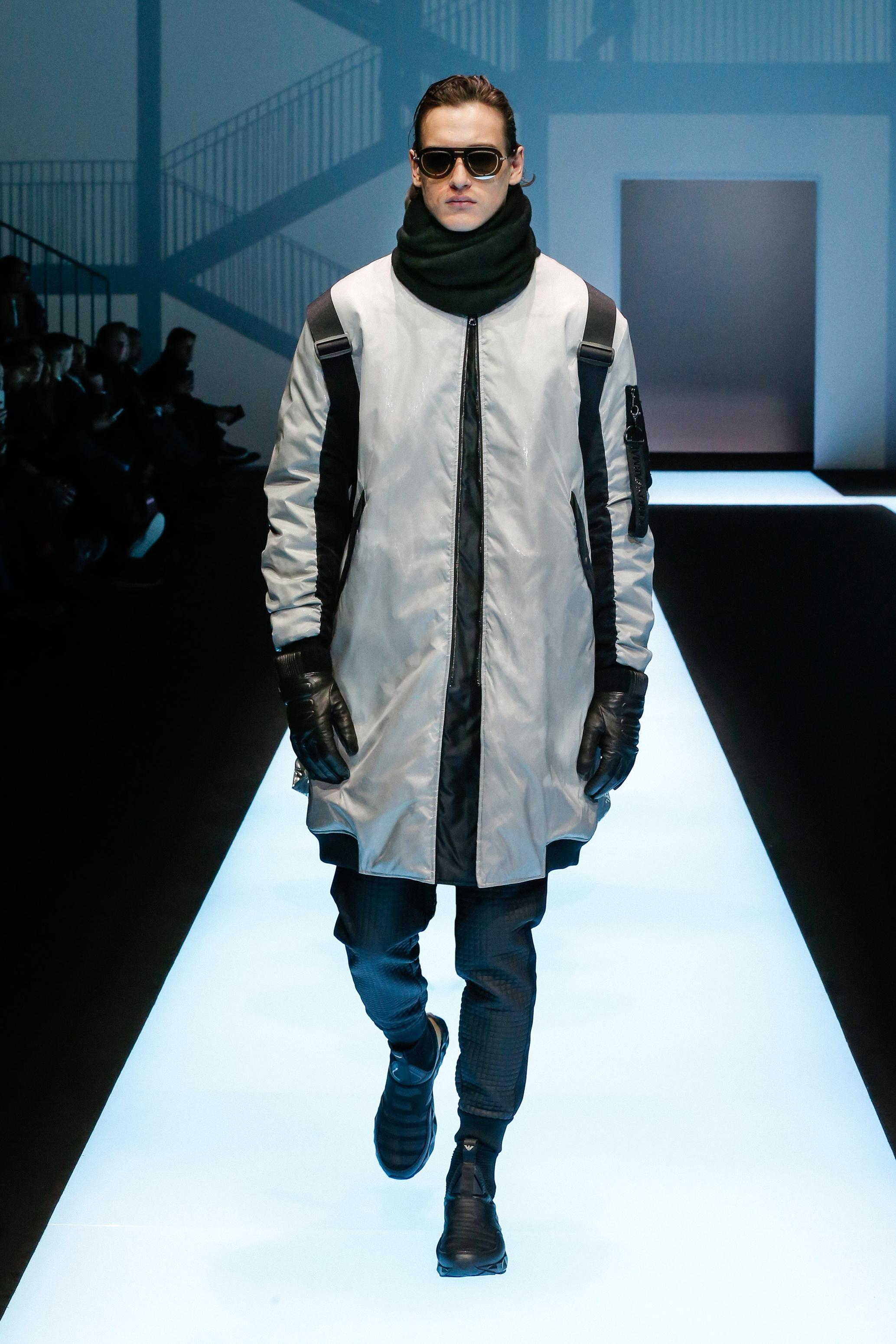 La palette de couleur oscille du noir intense au gris clair, à laquelle s’ajoutent des tons plus naturels comme le kaki et le bleu. Les chapeaux et lunettes de soleil sont nombreux en tant qu’accessoires. Les parkas restent elles dans les tons clairs et apportent de la fraîcheur aux tenues.