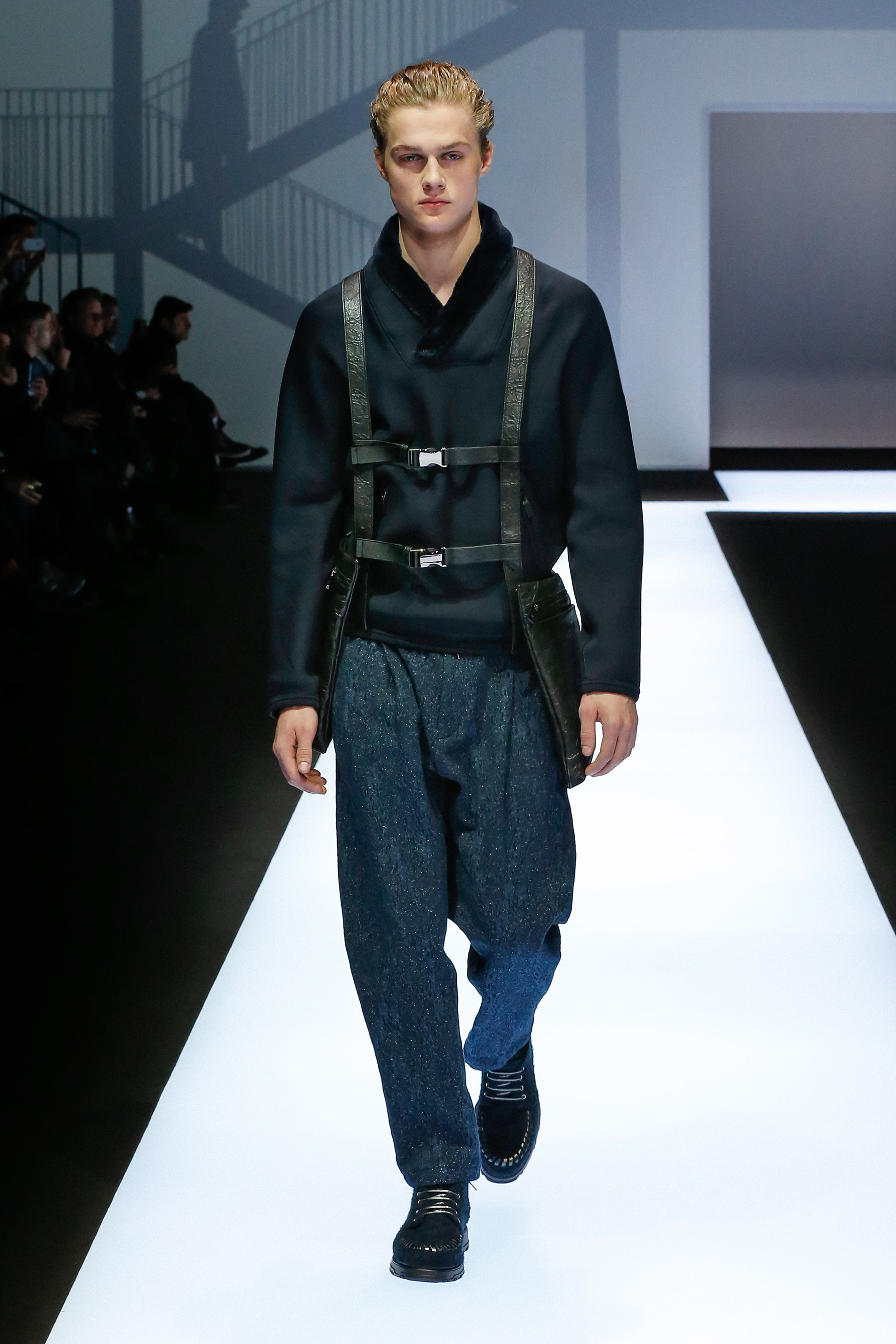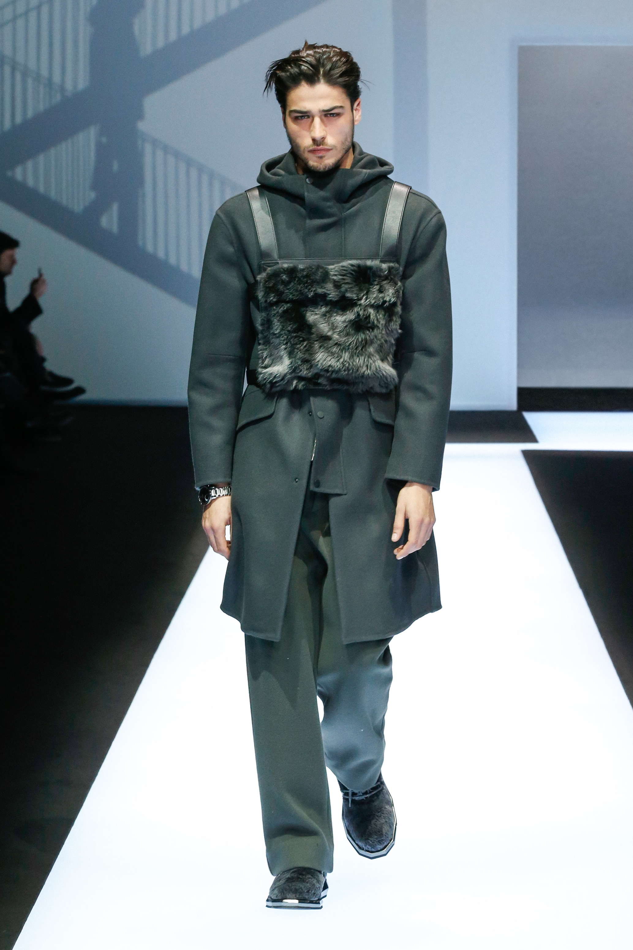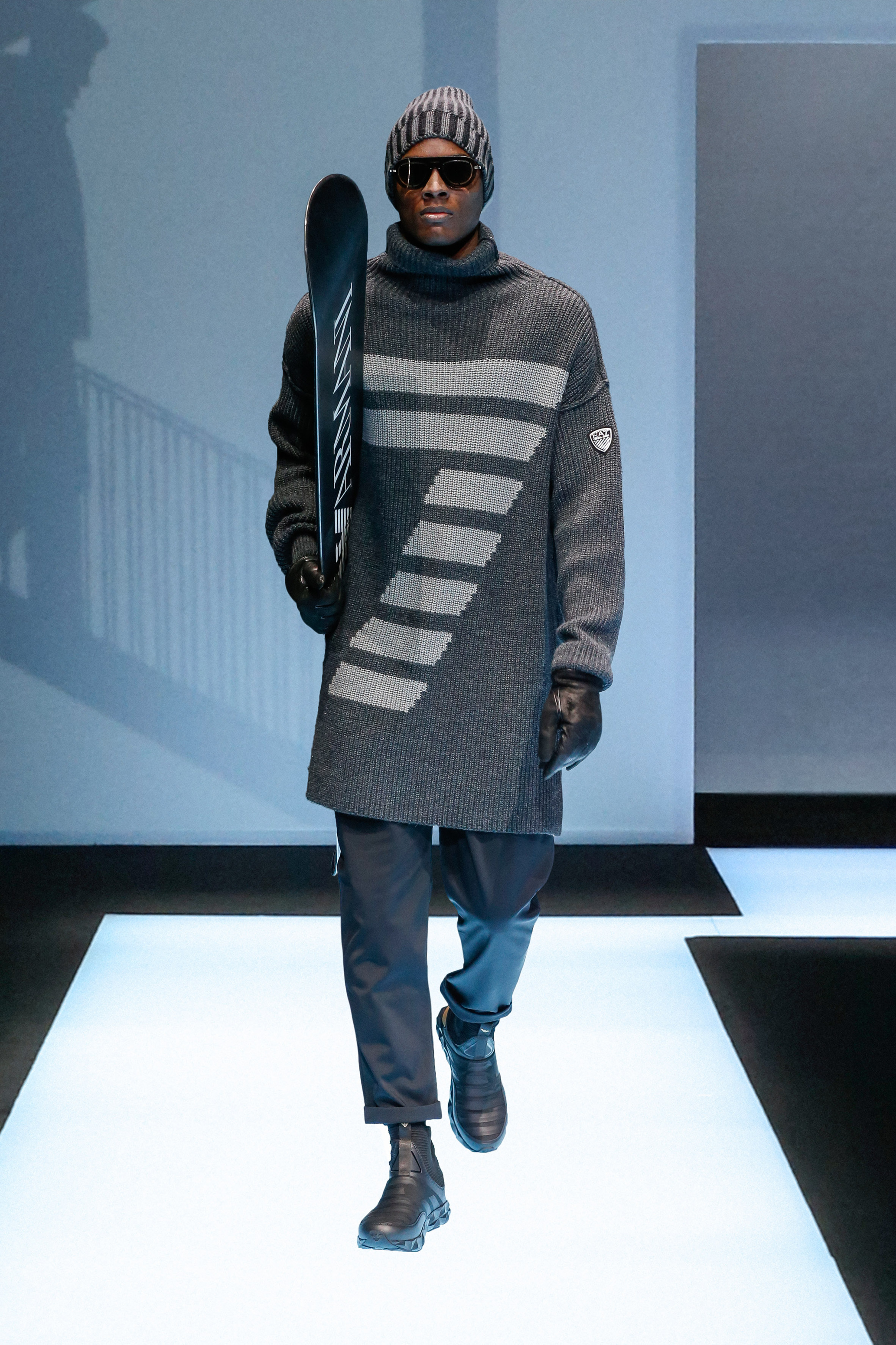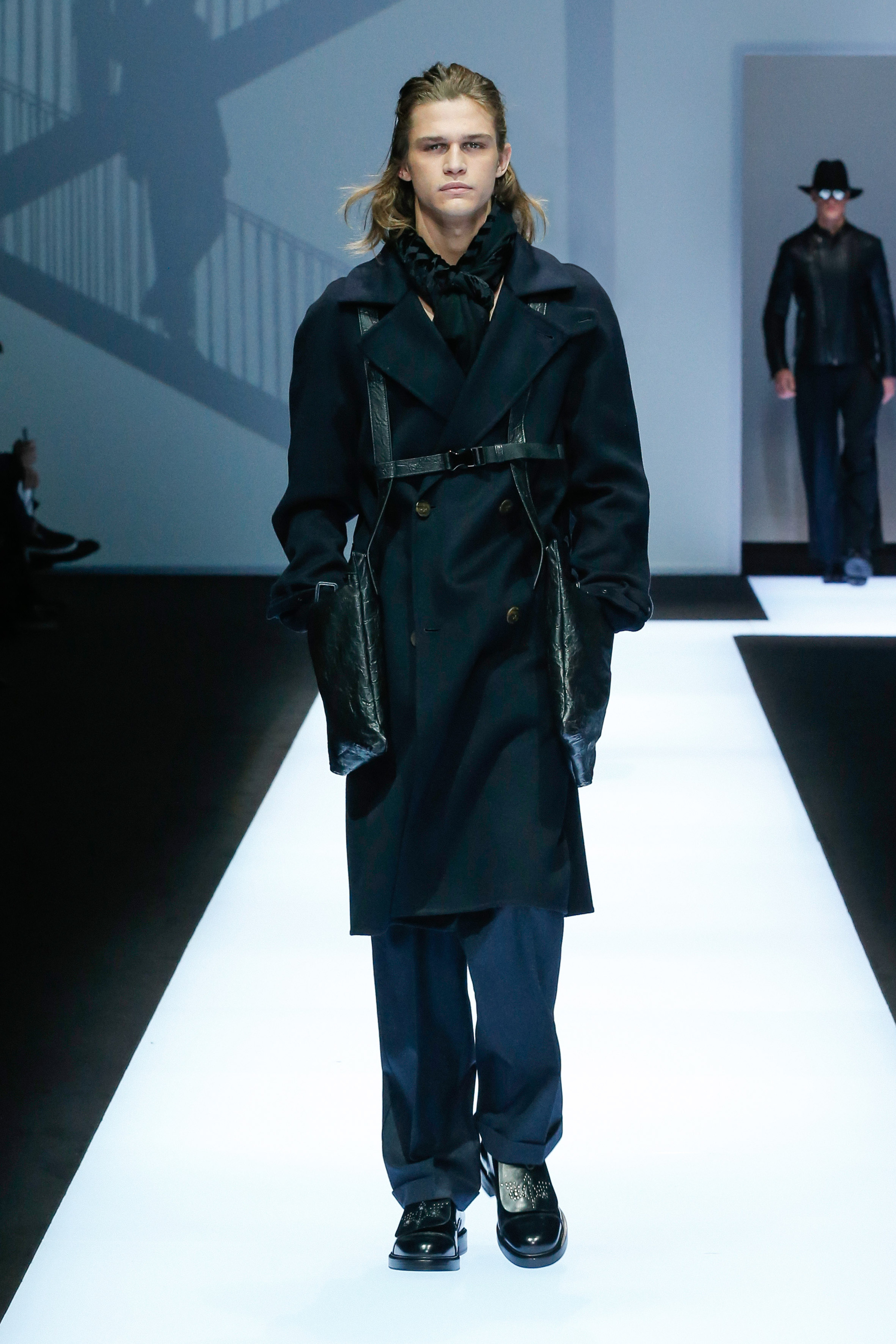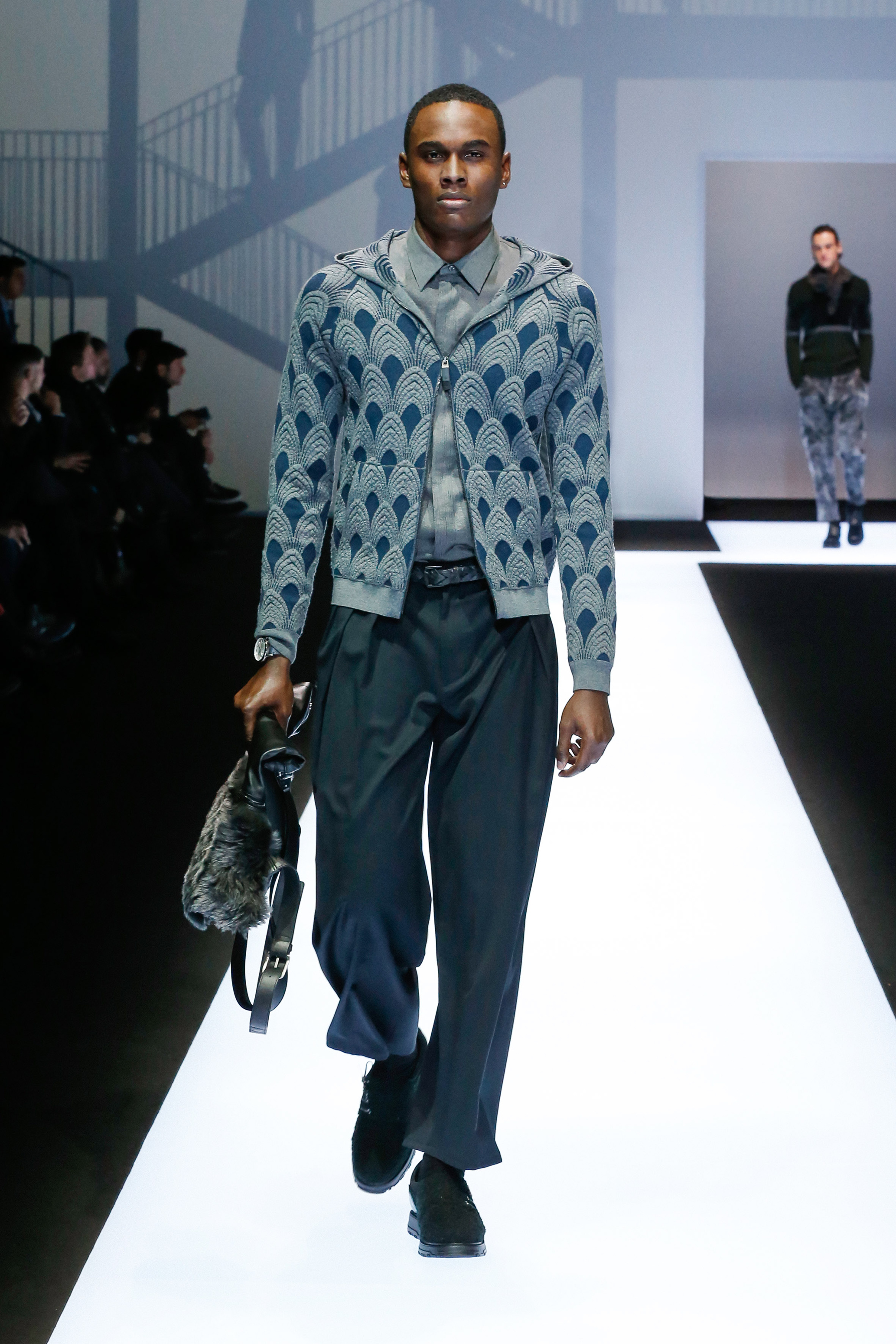 La palette de couleur oscille du noir intense au gris clair, à laquelle s’ajoutent des tons plus naturels comme le kaki et le bleu. Les chapeaux et lunettes de soleil sont nombreux en tant qu’accessoires. Les parkas restent elles dans les tons clairs et apportent de la fraîcheur aux tenues.
