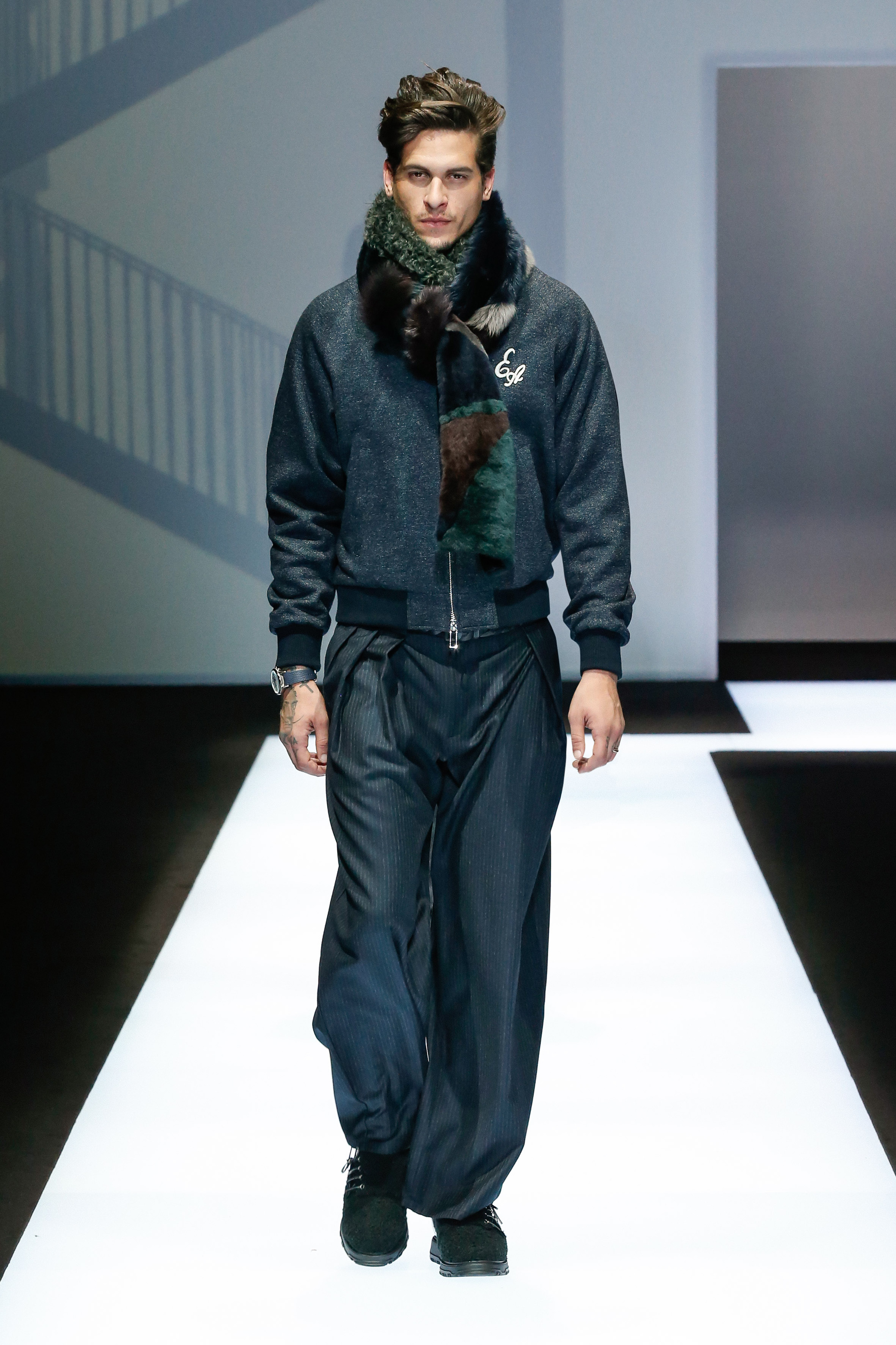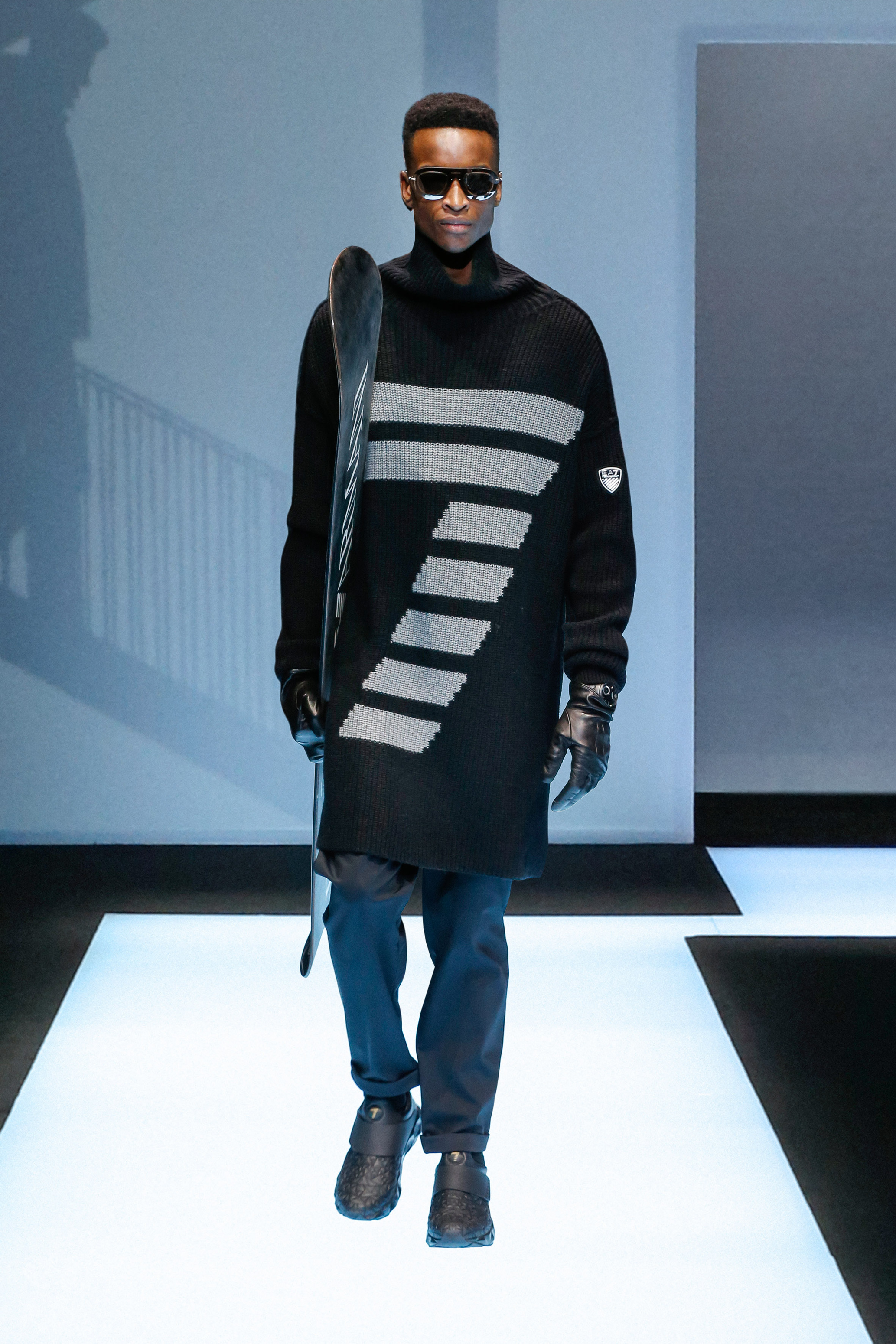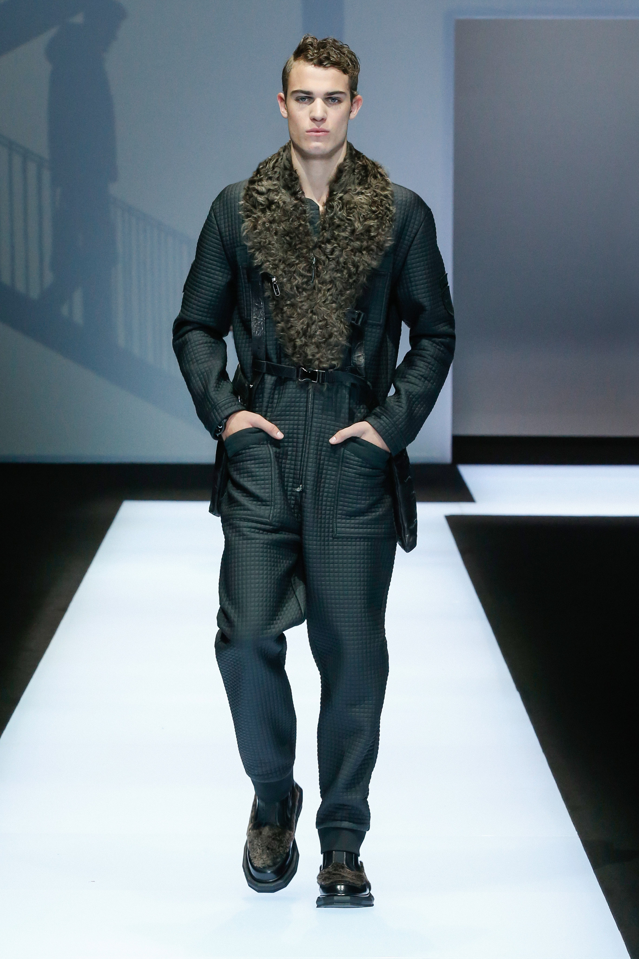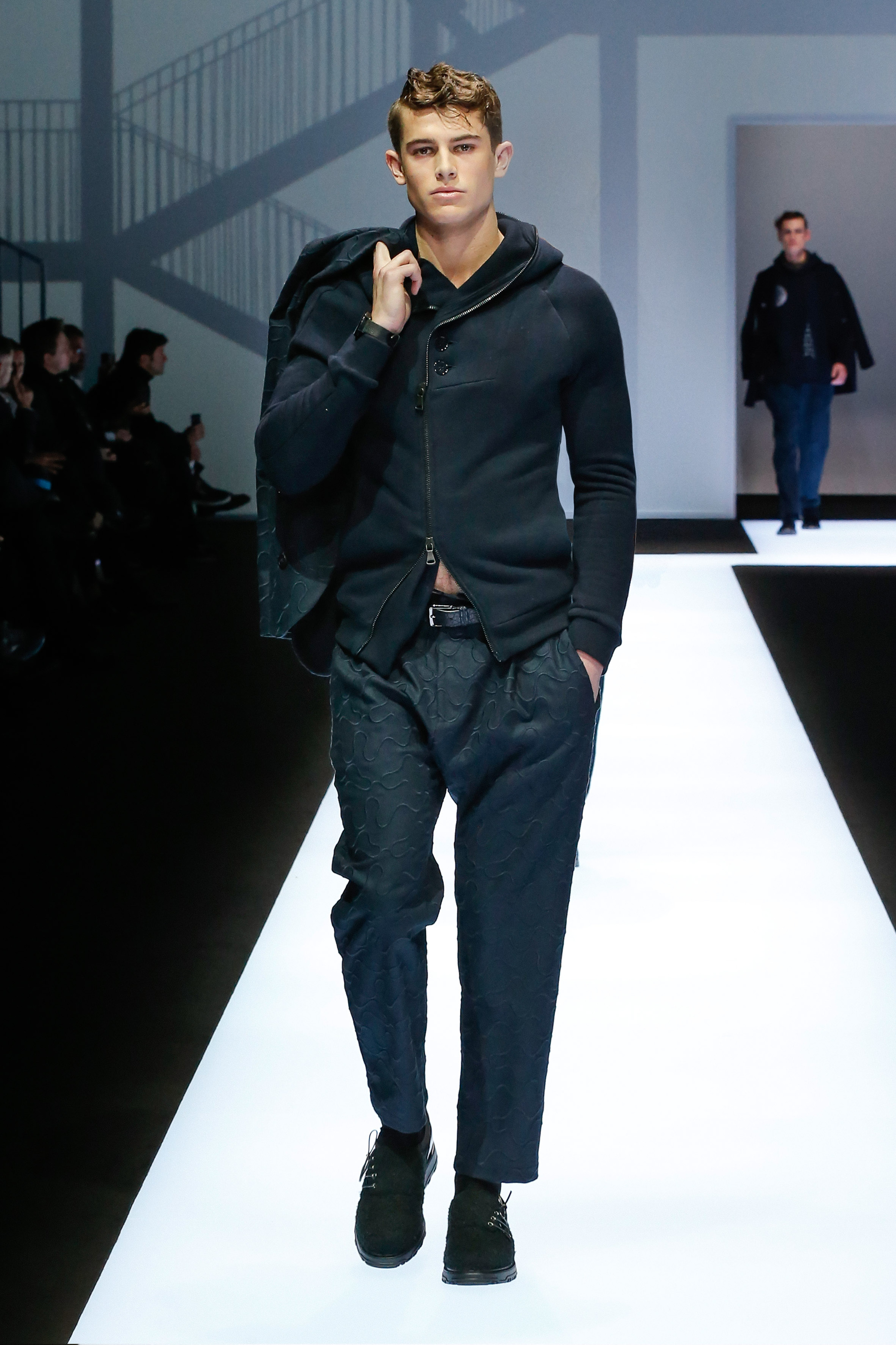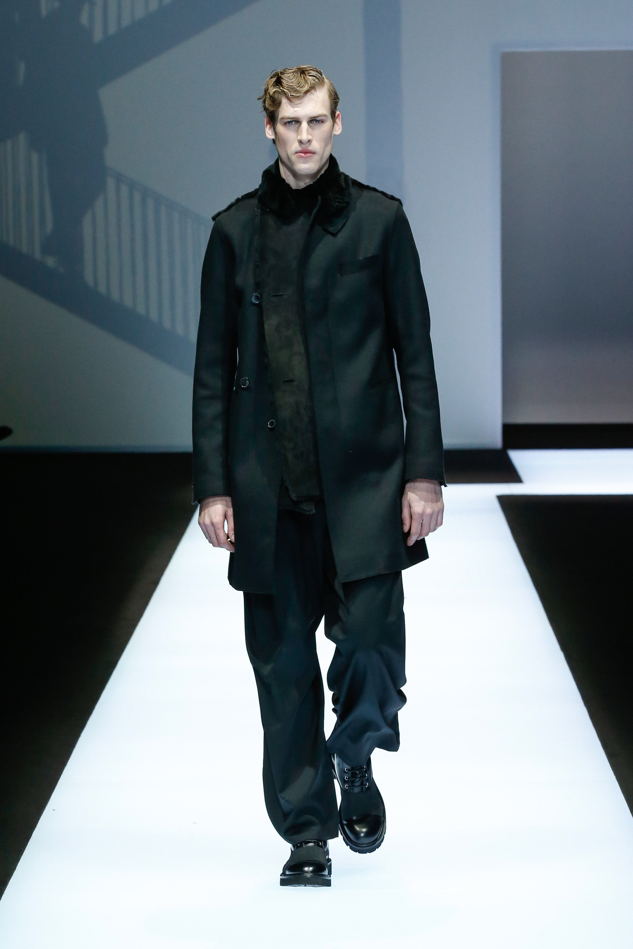 La palette de couleur oscille du noir intense au gris clair, à laquelle s’ajoutent des tons plus naturels comme le kaki et le bleu. Les chapeaux et lunettes de soleil sont nombreux en tant qu’accessoires. Les parkas restent elles dans les tons clairs et apportent de la fraîcheur aux tenues.