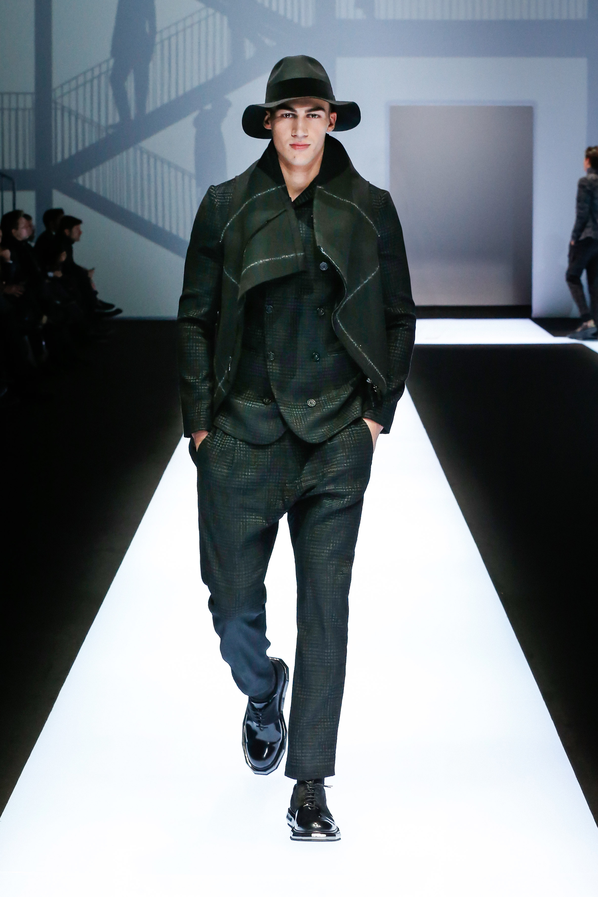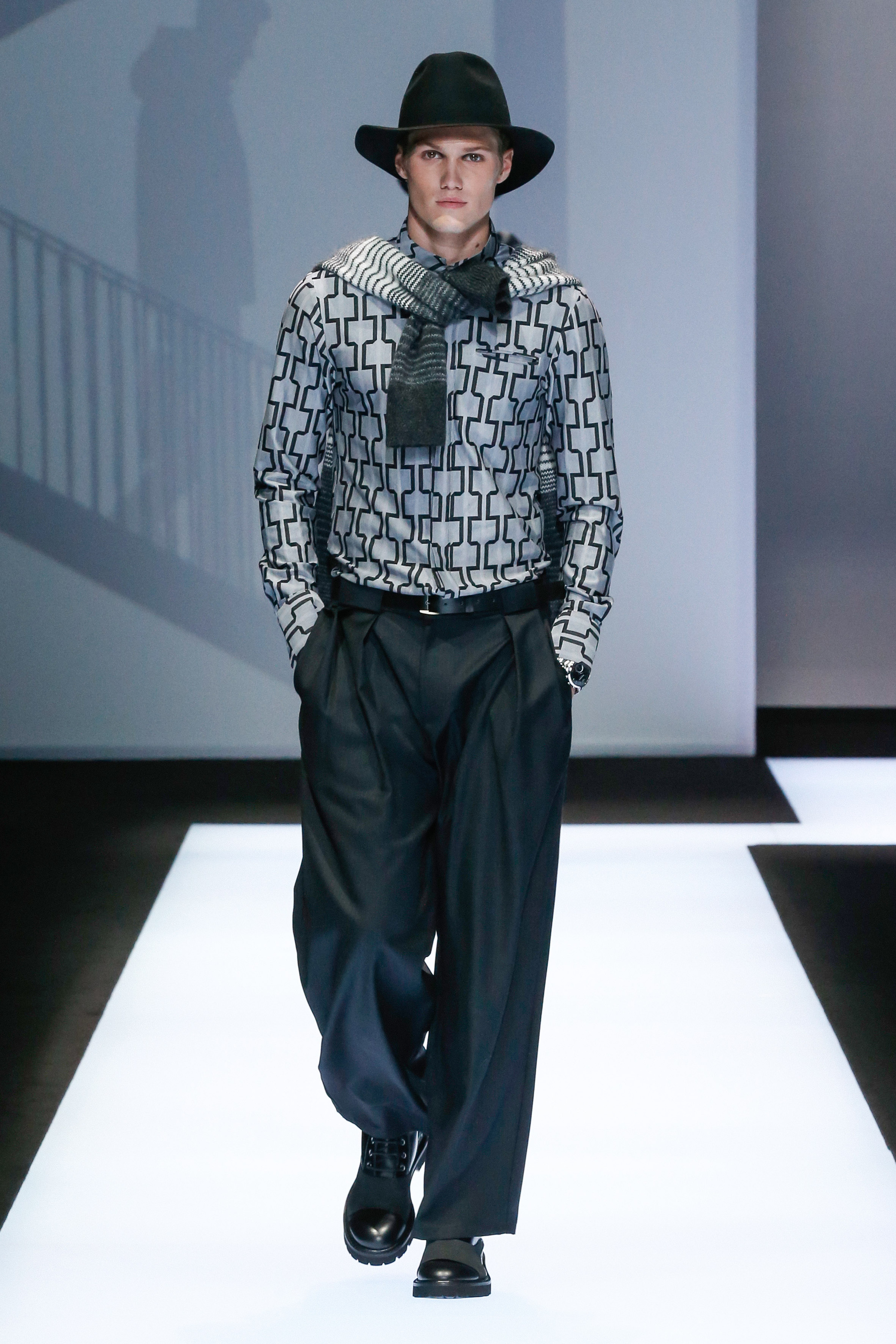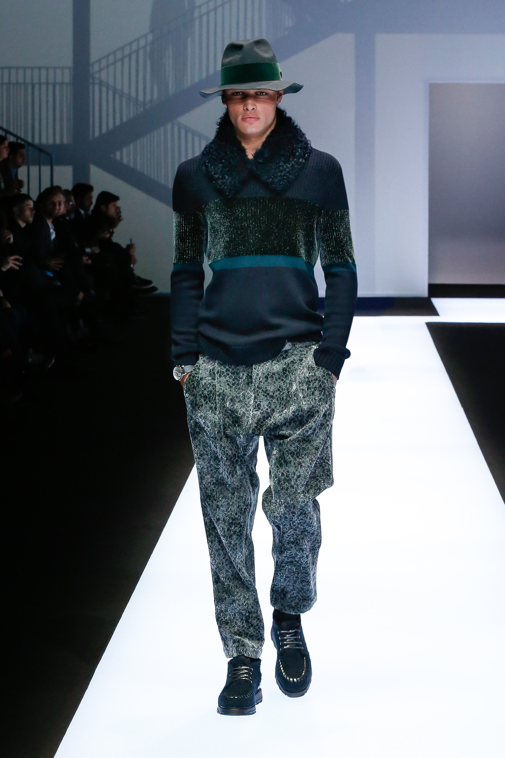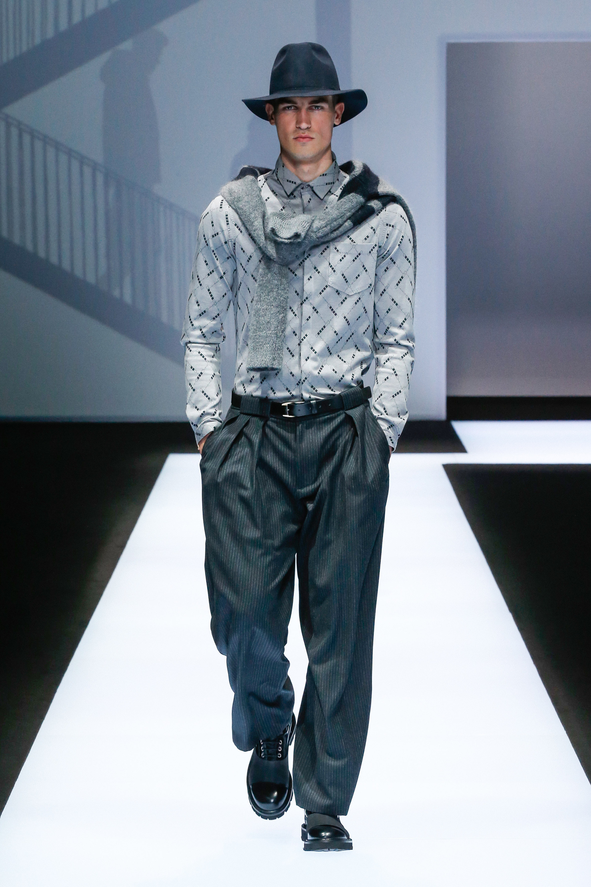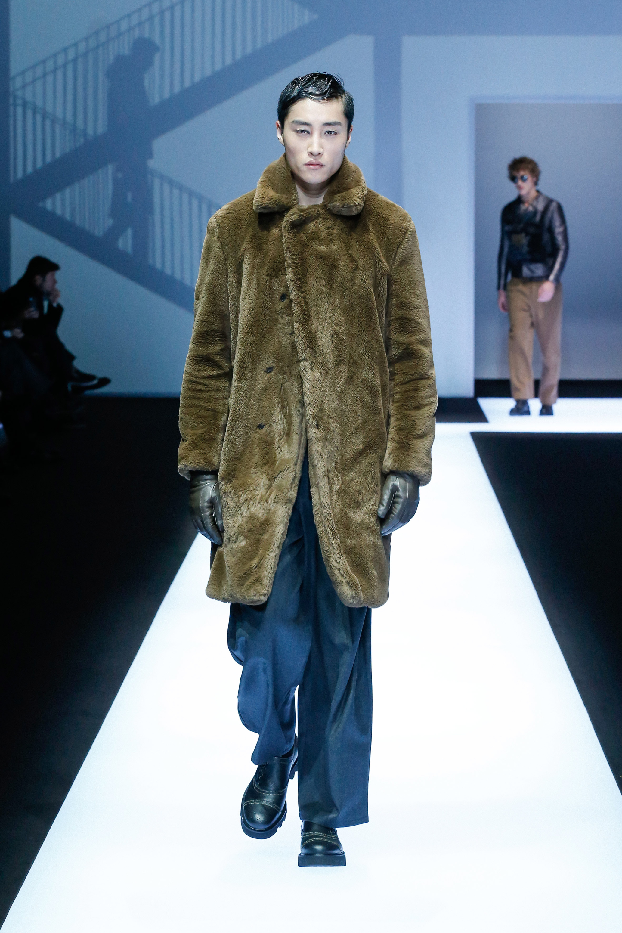 La palette de couleur oscille du noir intense au gris clair, à laquelle s’ajoutent des tons plus naturels comme le kaki et le bleu. Les chapeaux et lunettes de soleil sont nombreux en tant qu’accessoires. Les parkas restent elles dans les tons clairs et apportent de la fraîcheur aux tenues.
