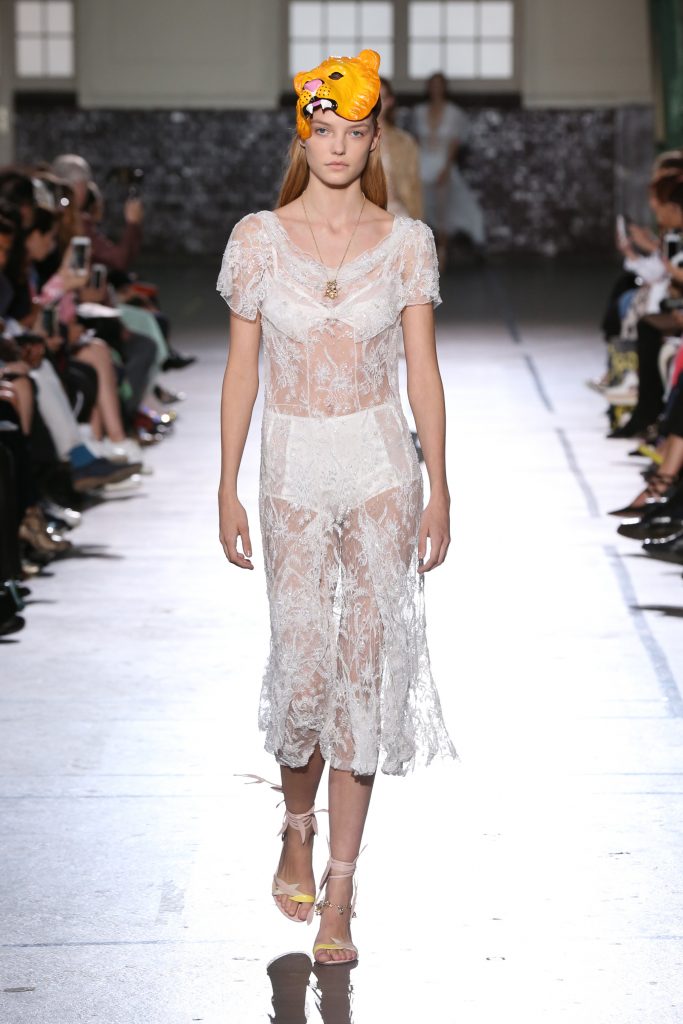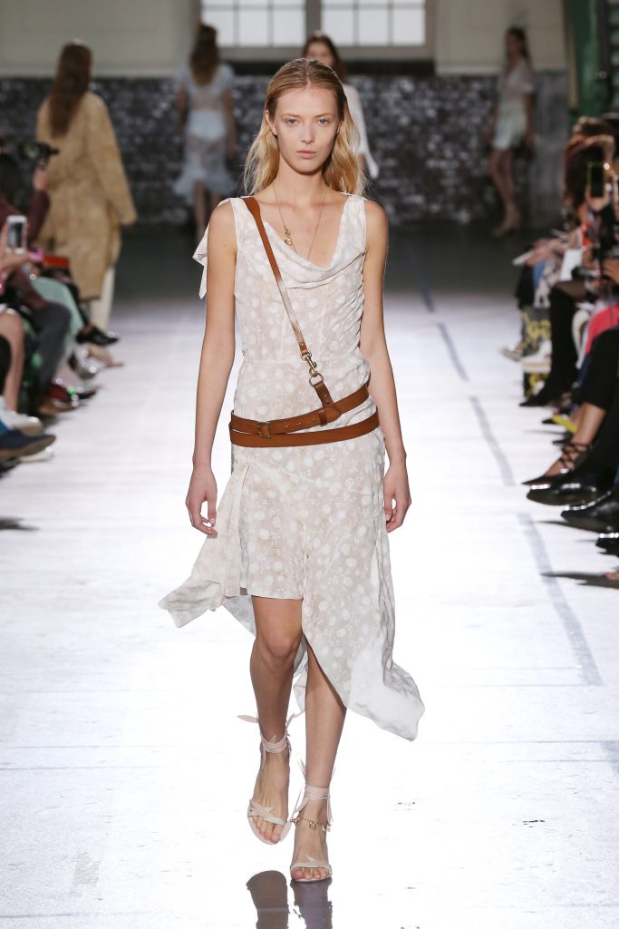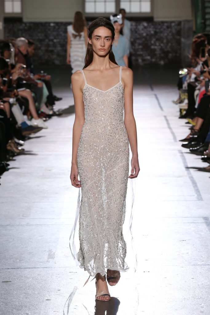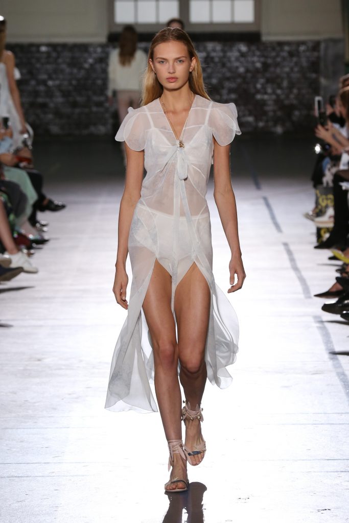 Délicatesse et transparence pour des robes fluides en mousseline. De la lingerie en transparence et de la broderie pour des robes du soir signature maison. Des volants, rubans, ceintures en cuir autour de la taille.