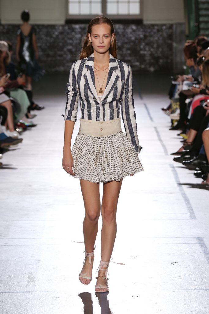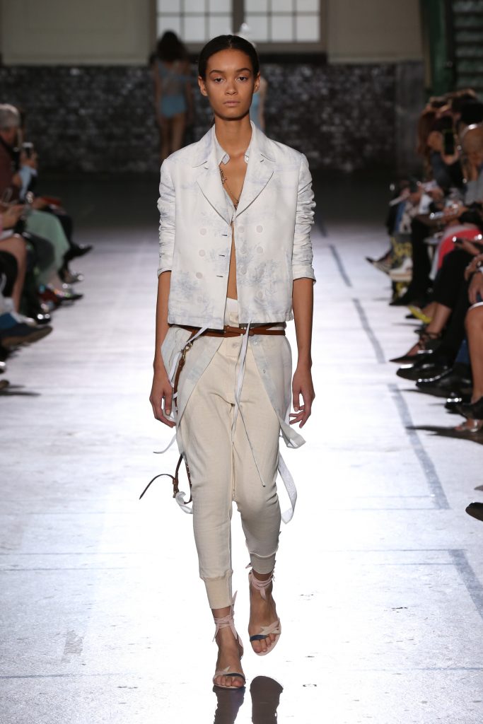 Imprimé toile de Jouy pastel, comme fané par le soleil.Pantalon rayé trainant sur le sol et taille ouverte pour laisser voir les dessous.