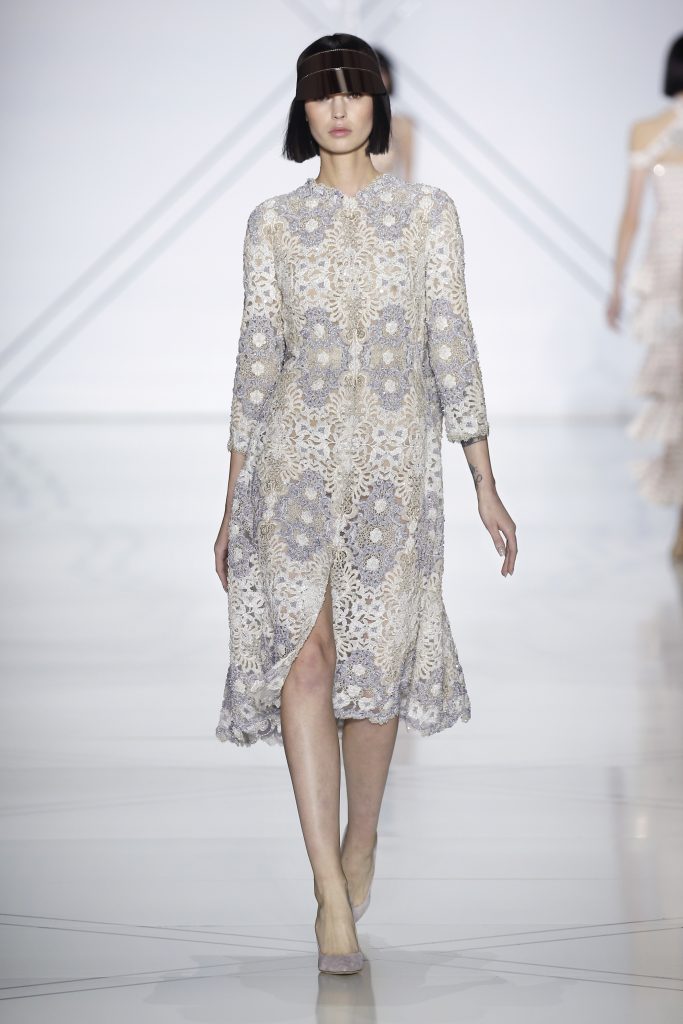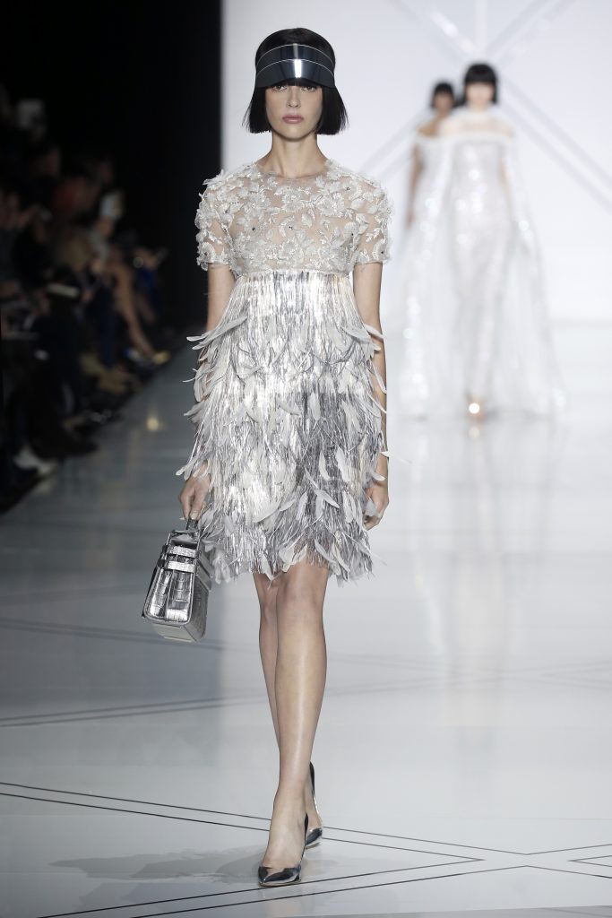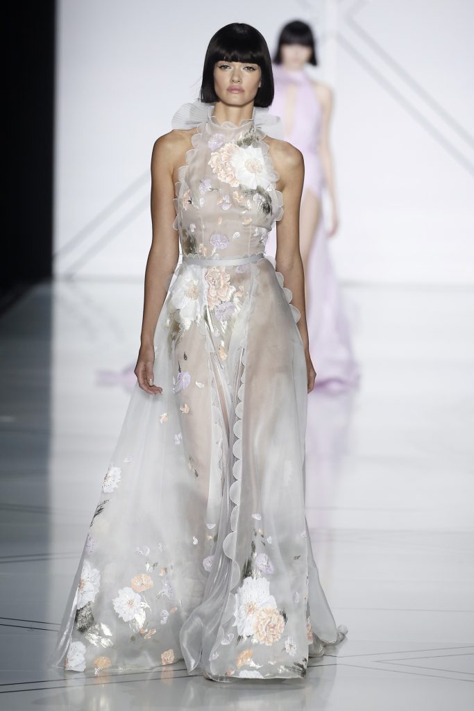 Canalisant l’intersection entre la beauté naturelle et l’architecture moderne, l’ornement est botanique ; de crystal plissé et de feuilles métalliques frangées, synthétisant la symétrie innée de la nature avec des configurations contemporaines. Des pétales San Gallo cousues de lurex et des traits d’encre métallique giclés à coup de pinceau ajoutent des teintes urbaines aux tons bleu ciel, rose poudre, indigo et vert pétillant propres à la fraîcheur des jardins.