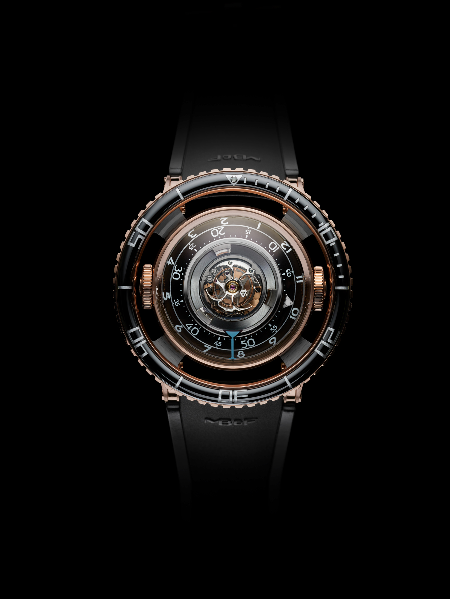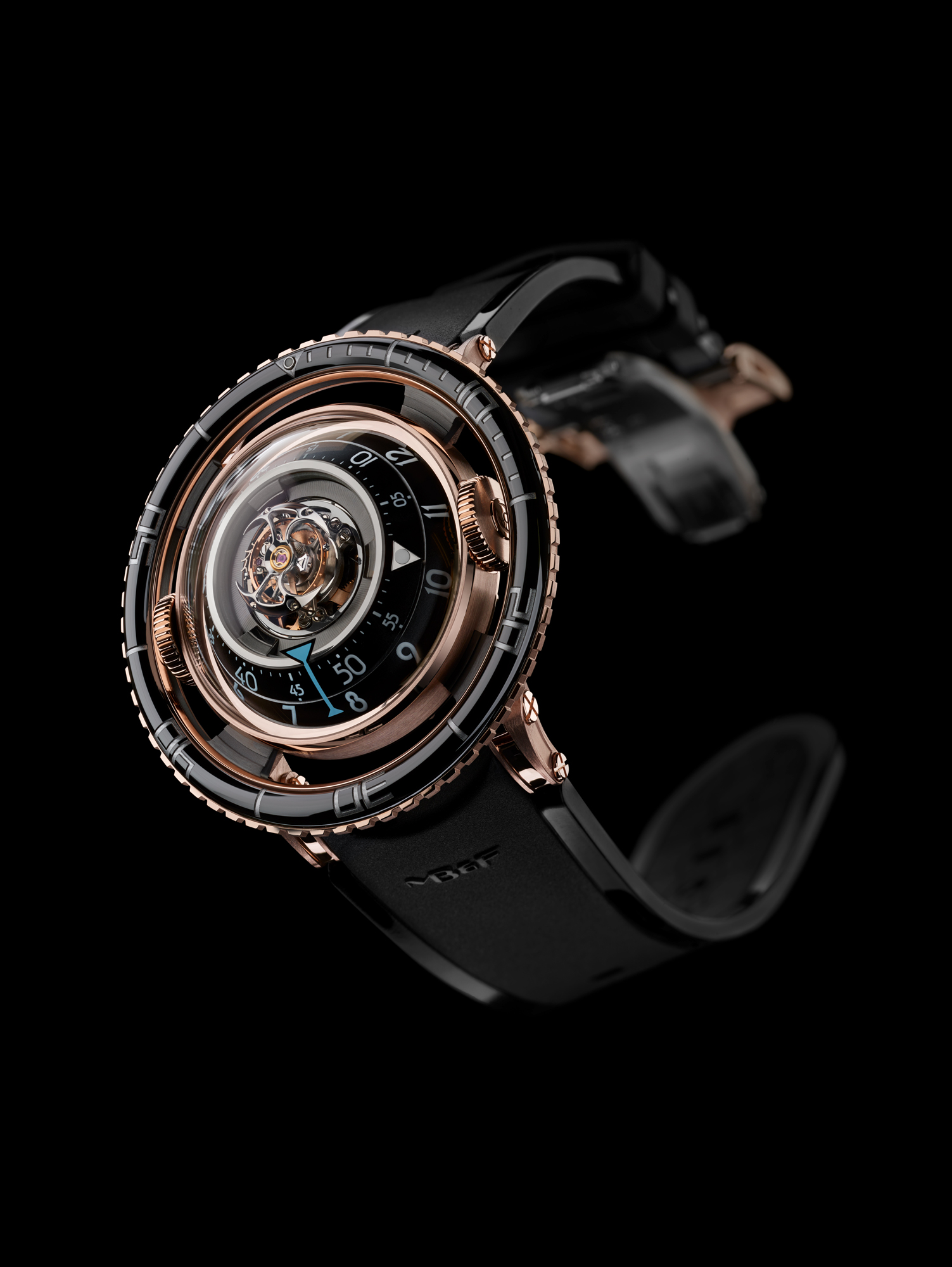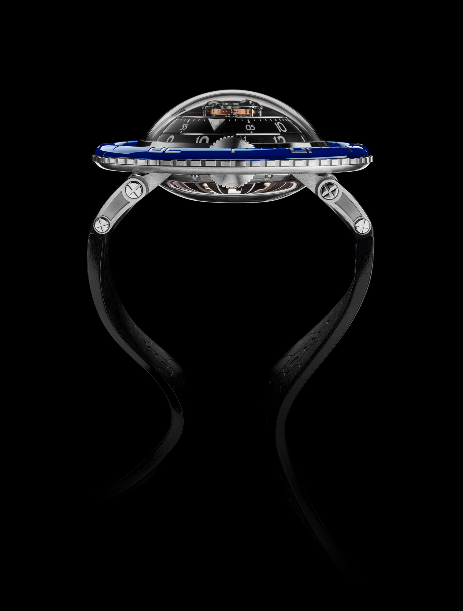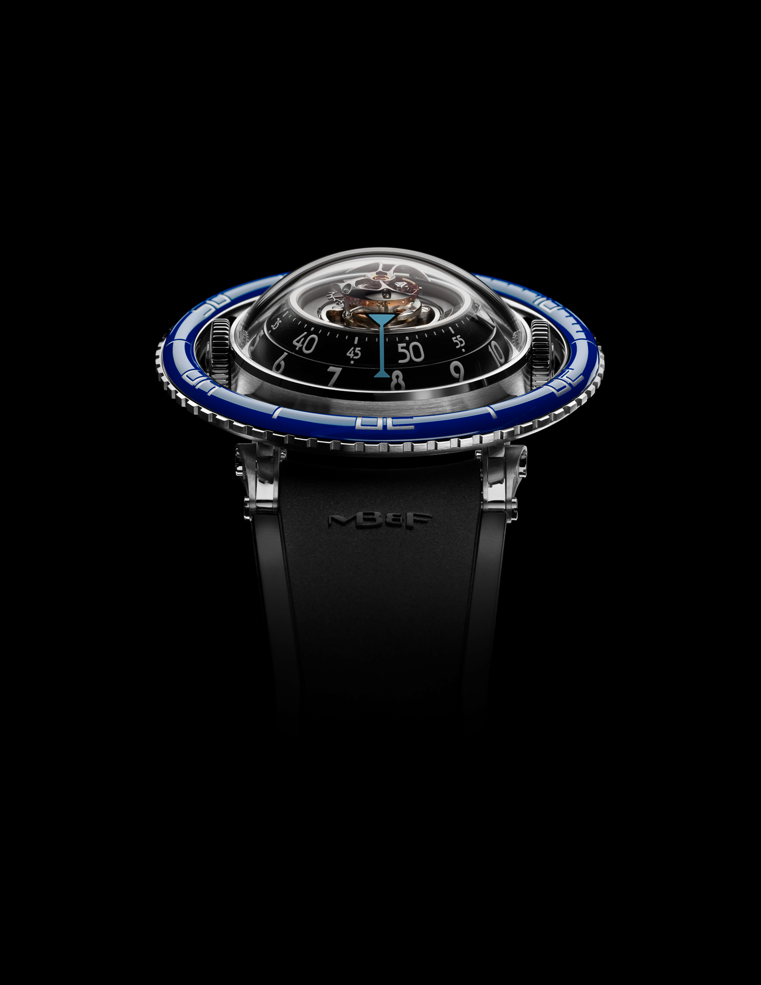 Avec HM7 Aquapod, MB&F pousse l’exploration horlogère un peu plus loin: après l’espace, le ciel, la route et les circuits, il plonge dans l’eau. Sa lunette rotative « flottante » et surdimensionnée est clairement un clin d’œil aux montres de plongée… même si Aquapod n’est pas formellement une montre de plongée: c’est une méduse horlogère! De l’extérieur, la forme bombée de son boîtier, sa peau transparente, ses cornes articulées, son bracelet en caoutchouc souple et son rotor-tentacules rappellent une méduse. A l’intérieur, la structure verticale et radialement symétrique du mouvement reprend l’anatomie de ces créatures marines gélatineuses… et comme de nombreuses méduses, HM7 Aquapod luit dans la nuit.