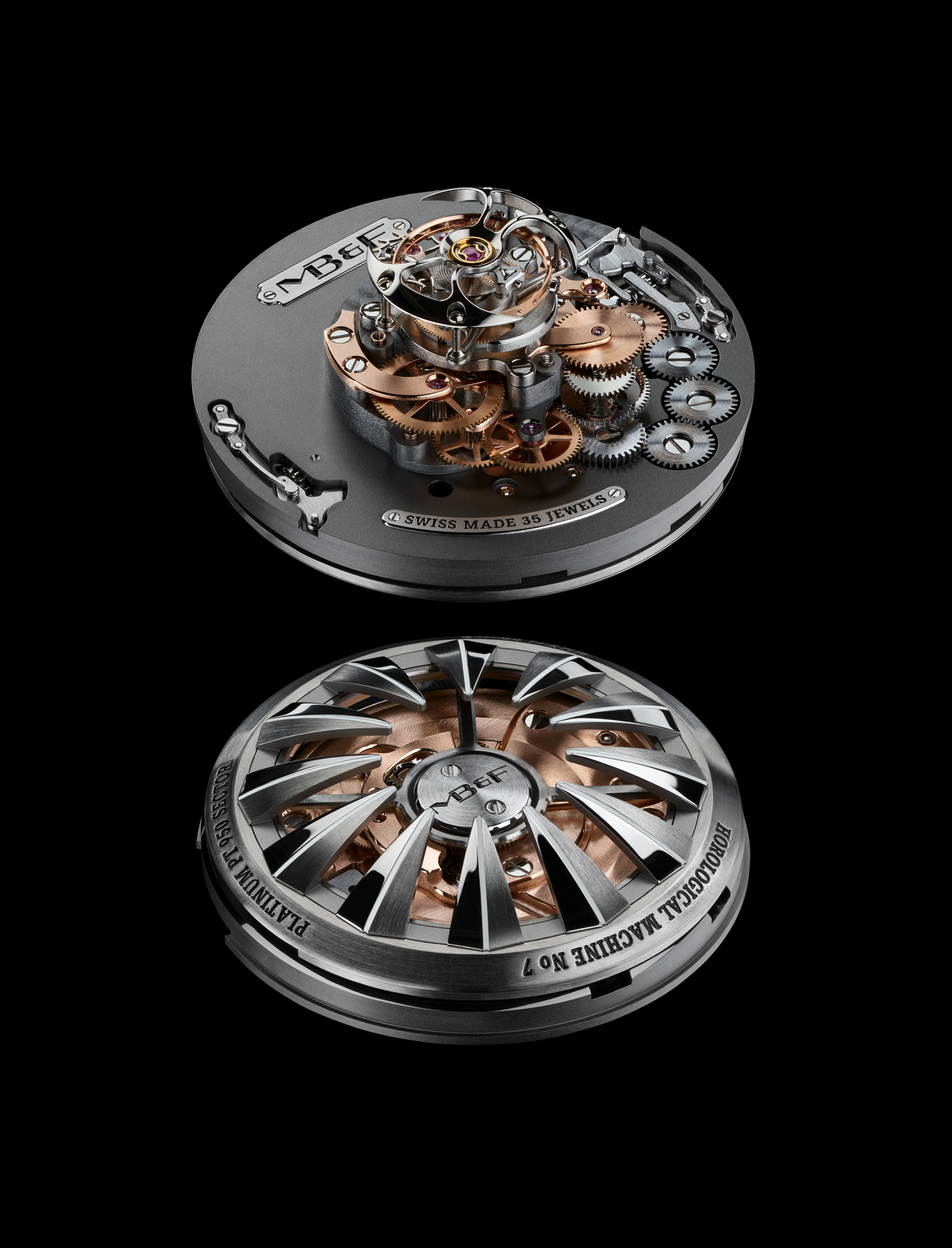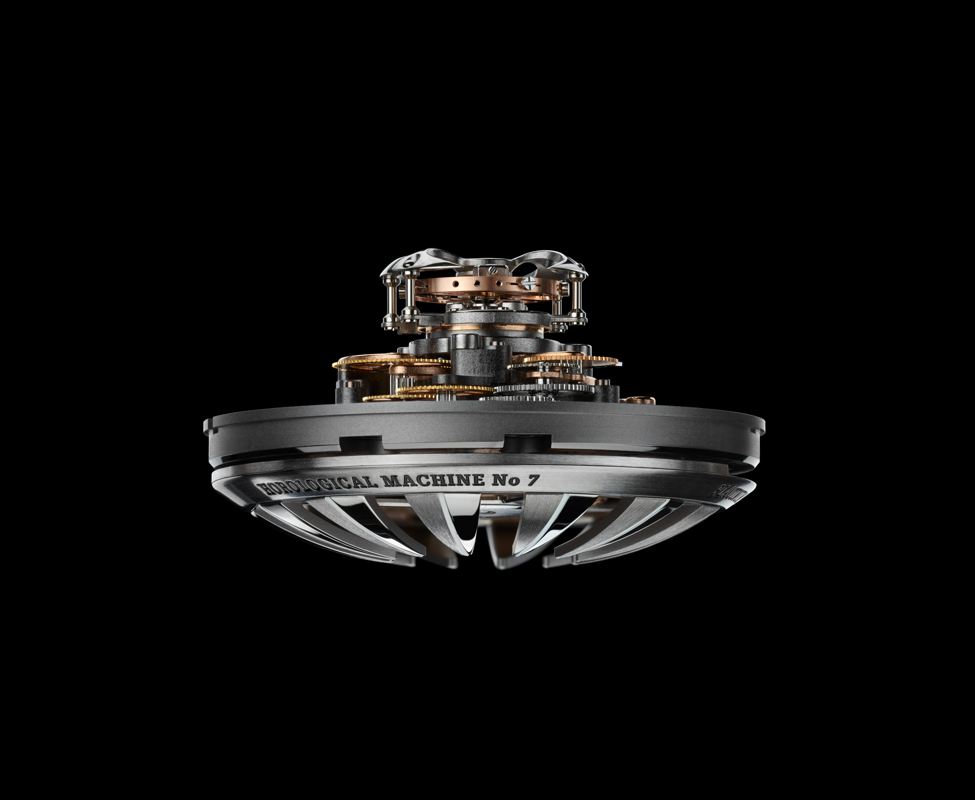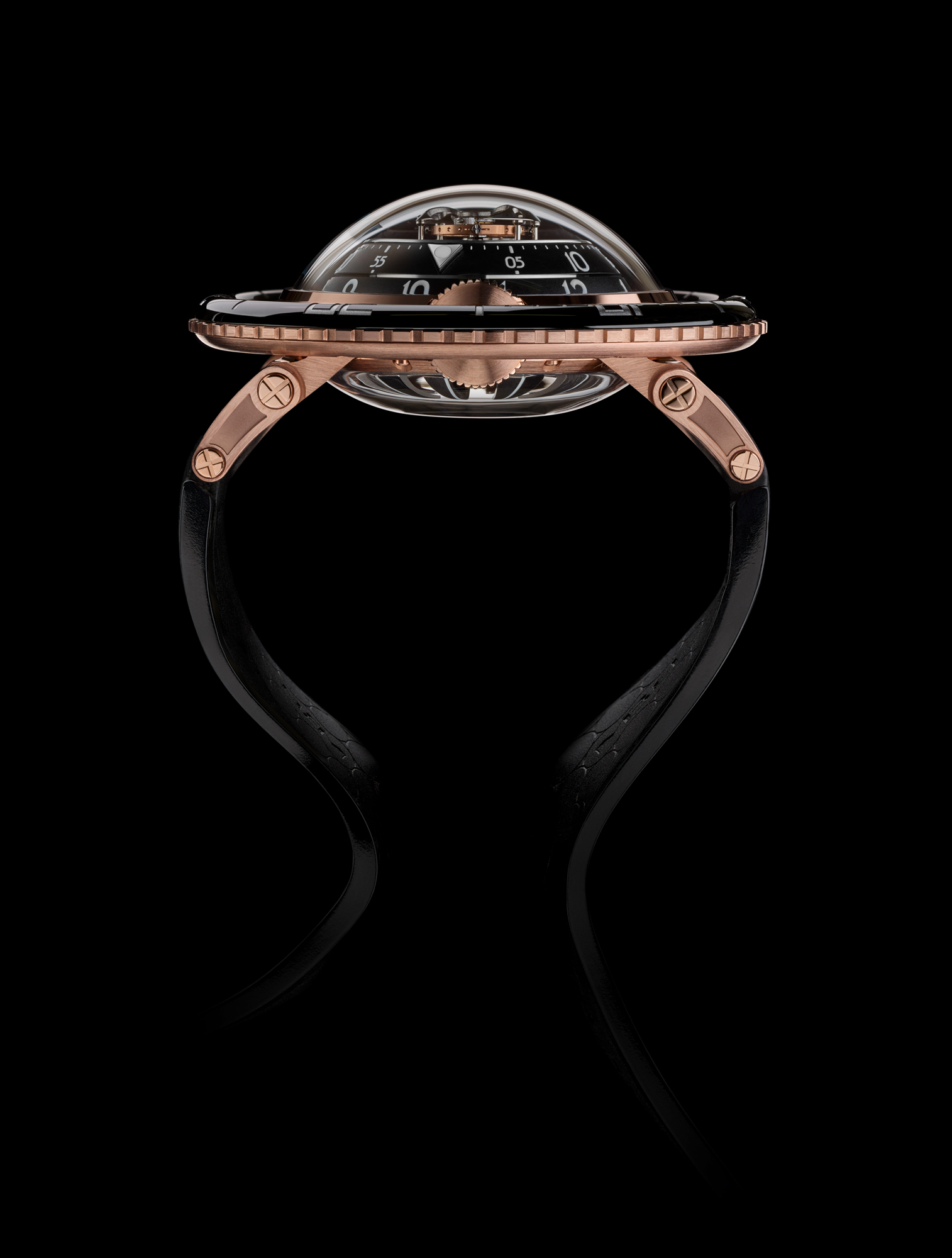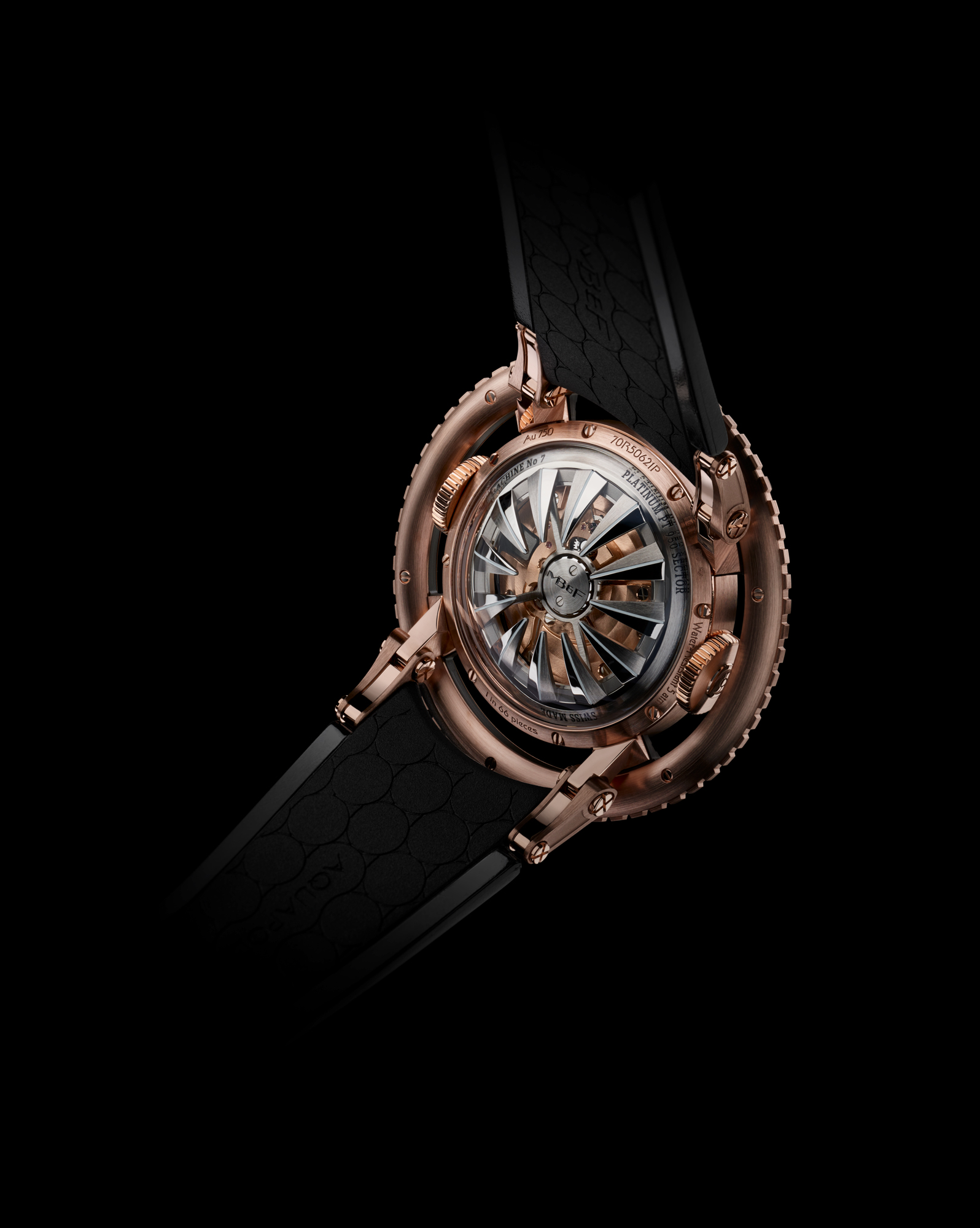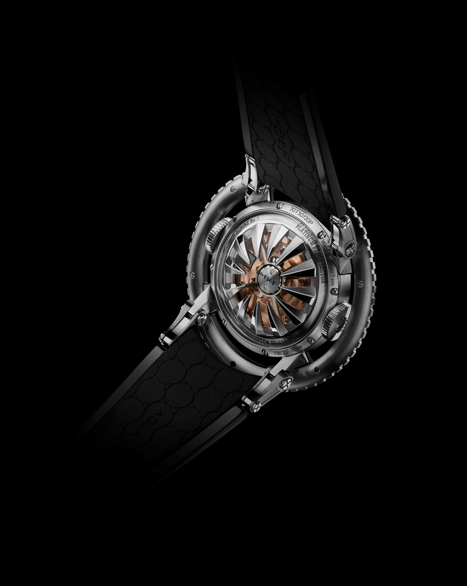 Avec HM7 Aquapod, MB&F pousse l’exploration horlogère un peu plus loin: après l’espace, le ciel, la route et les circuits, il plonge dans l’eau. Sa lunette rotative « flottante » et surdimensionnée est clairement un clin d’œil aux montres de plongée… même si Aquapod n’est pas formellement une montre de plongée: c’est une méduse horlogère! De l’extérieur, la forme bombée de son boîtier, sa peau transparente, ses cornes articulées, son bracelet en caoutchouc souple et son rotor-tentacules rappellent une méduse. A l’intérieur, la structure verticale et radialement symétrique du mouvement reprend l’anatomie de ces créatures marines gélatineuses… et comme de nombreuses méduses, HM7 Aquapod luit dans la nuit.
