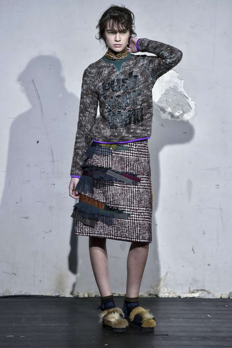 Après les déambulations à travers le cosmos, retour à la campagne. Chez  Stella Mc Cartney où Kolor, les brumes épaisses se combattent à coup d’imprimés tartan, de pulls en laines, de matelassés où de costumes à petits carreaux. Les sacs se portent sous le bras où en bandoulière; pour être paré à un départ soudain. Exit le Norfolk, place à l’aventure. Plus qu’un emprunt aux codes de l’équitation, les accessoires et les matières métamorphosent la femme en un sorte de minautaure : les chaussures sont comme le prolongement des sabots de l’animal.