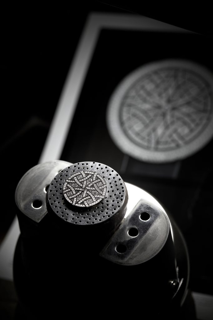 Né d’un emmaillement de fils d’acier, ce bracelet estampé révèle une prouesse technique : pour rappeler la richesse du tissu, le motif Tweed doit en effet être bien marqué par une frappe précise et profonde tout en garantissant une très grande souplesse et ainsi, assurer un porter très confortable. La réalisation de ce bracelet a demandé plusieurs mois de mise au point.