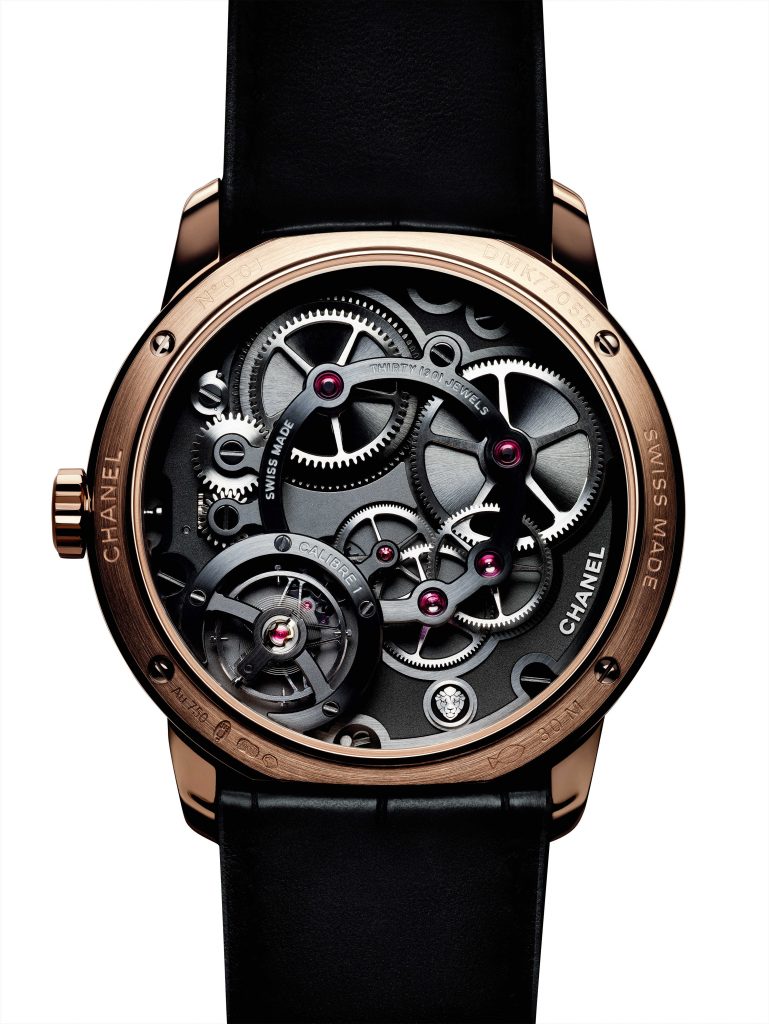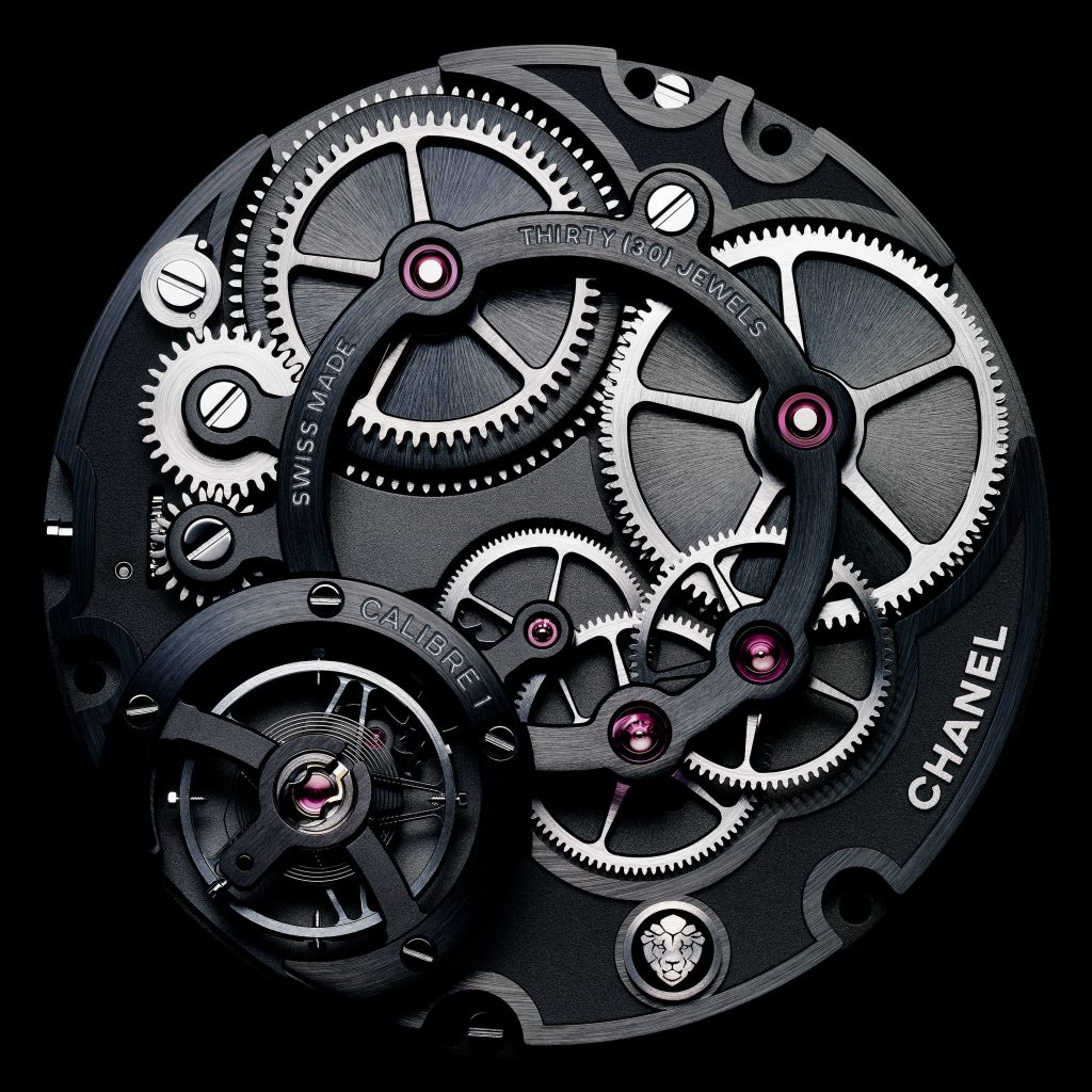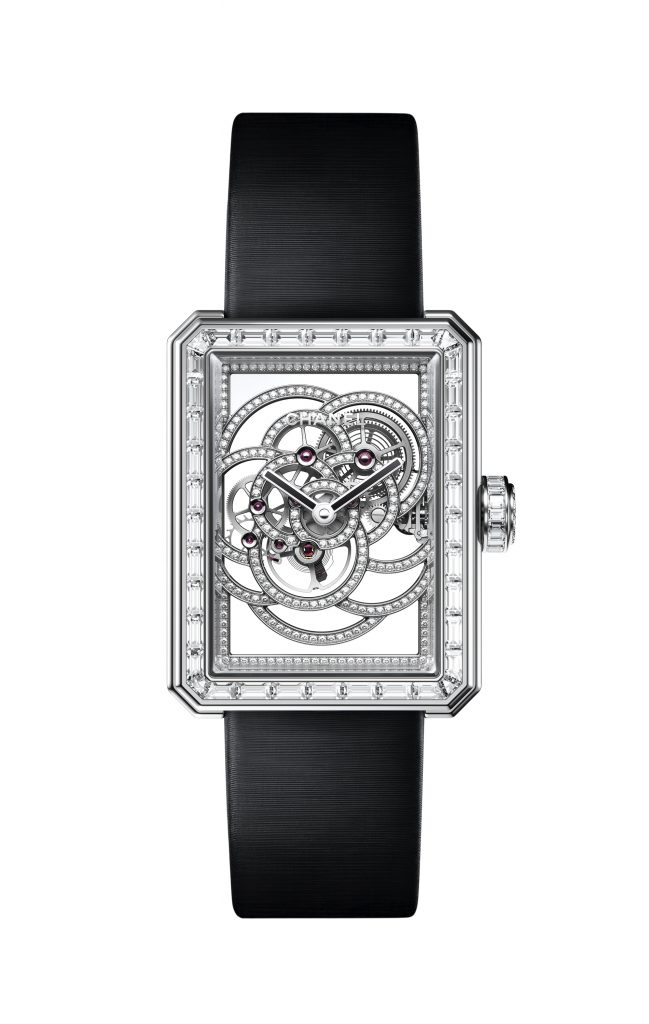 Cette pièce d’exception est animée par le deuxième mouvement in-house de CHANEL, le Calibre 2, dont la géométrie aérienne dessine une fleur de camélia. D’un noir absolu ou serti, ce mouvement squelette en or, unique en son genre incarne l’un des symboles iconique de la Maison.
