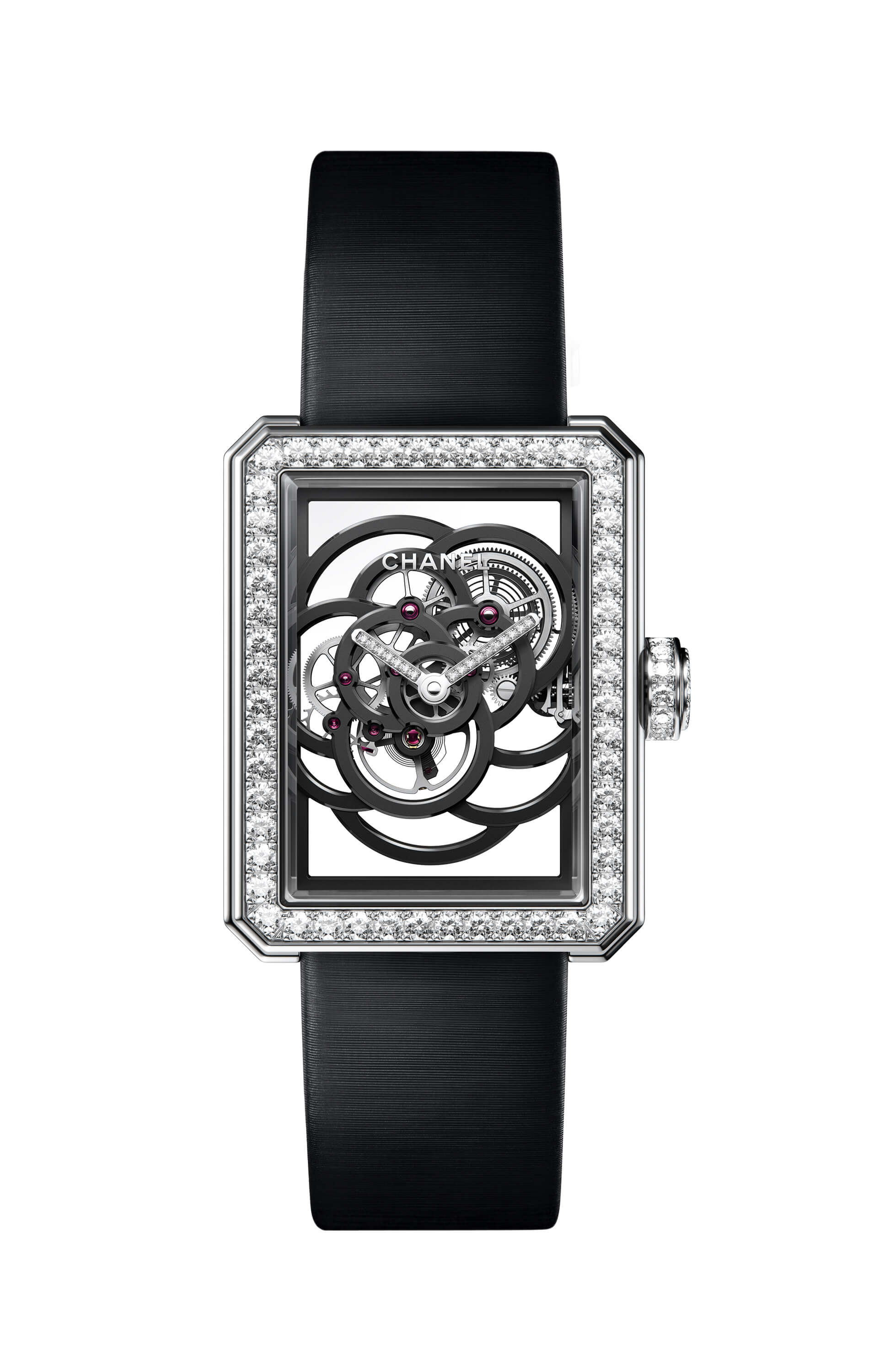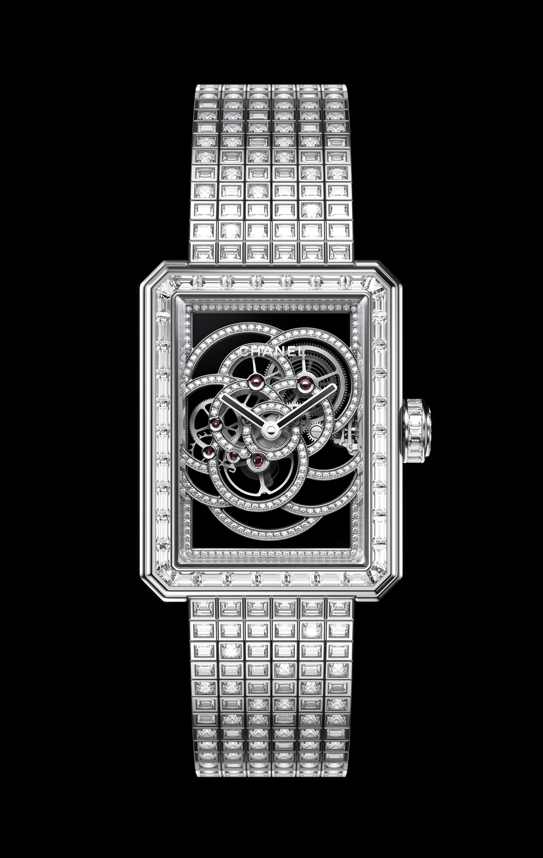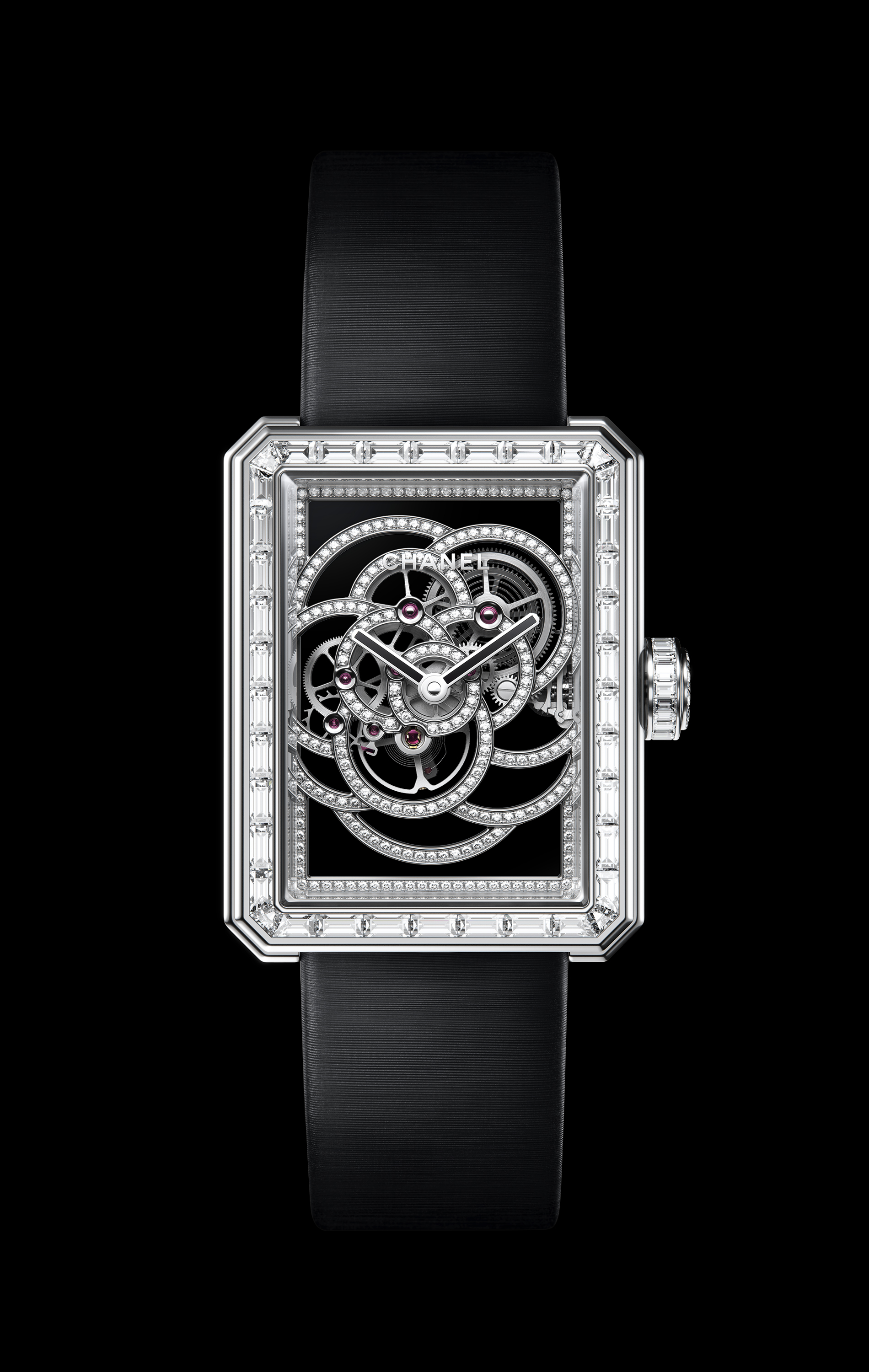 Cette pièce d’exception est animée par le deuxième mouvement in-house de CHANEL, le Calibre 2, dont la géométrie aérienne dessine une fleur de camélia. D’un noir absolu ou serti, ce mouvement squelette en or, unique en son genre incarne l’un des symboles iconique de la Maison.