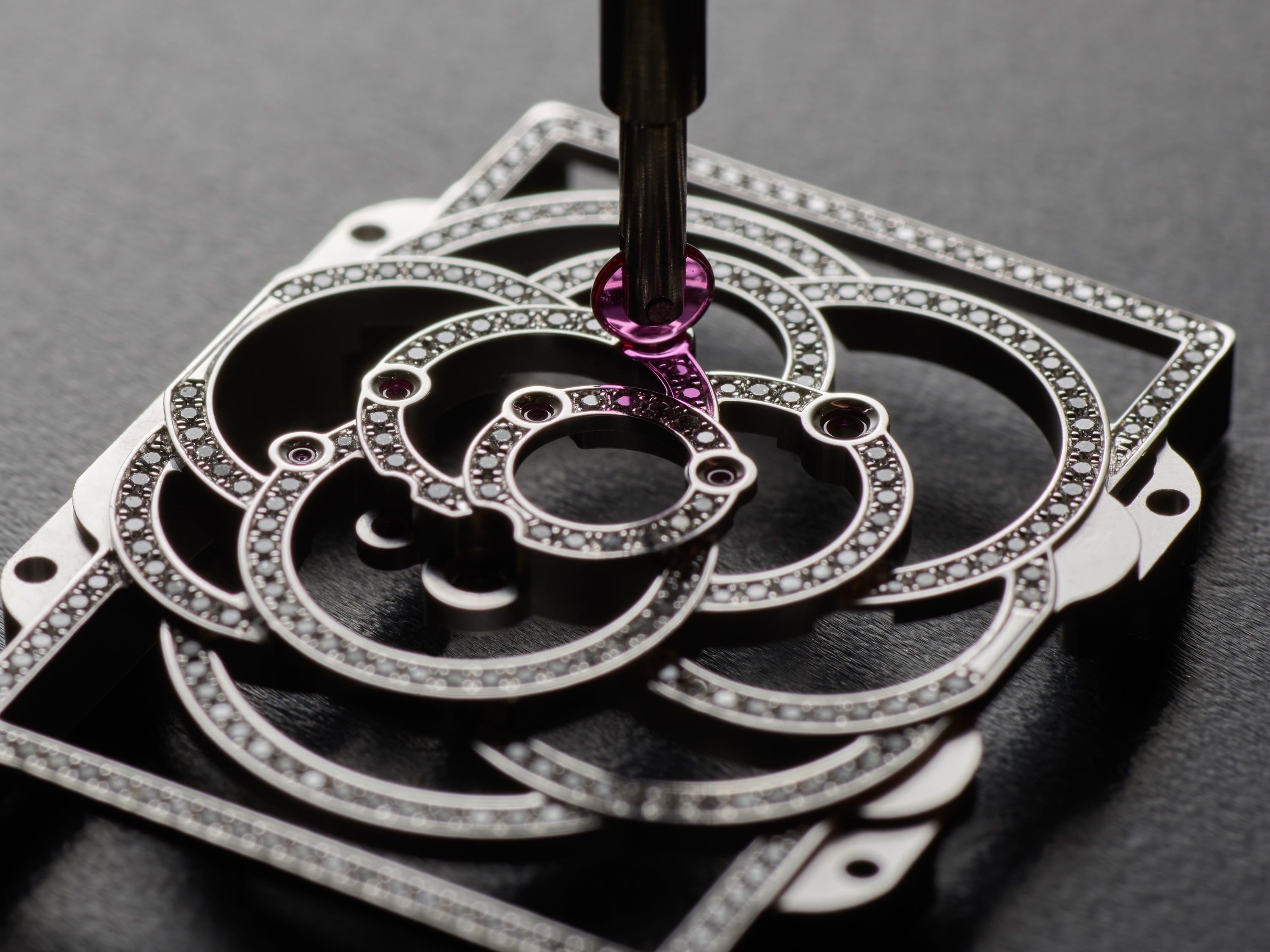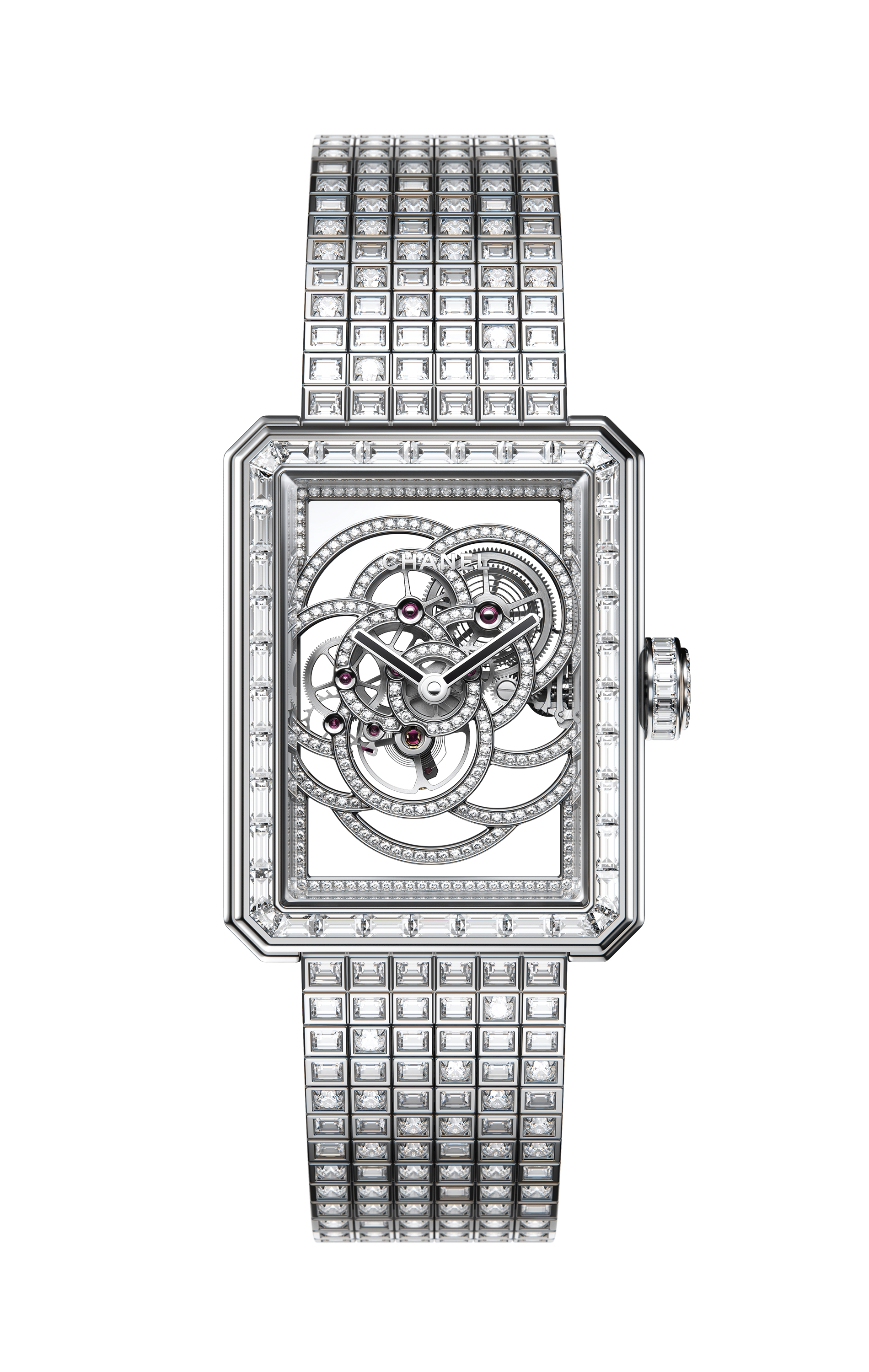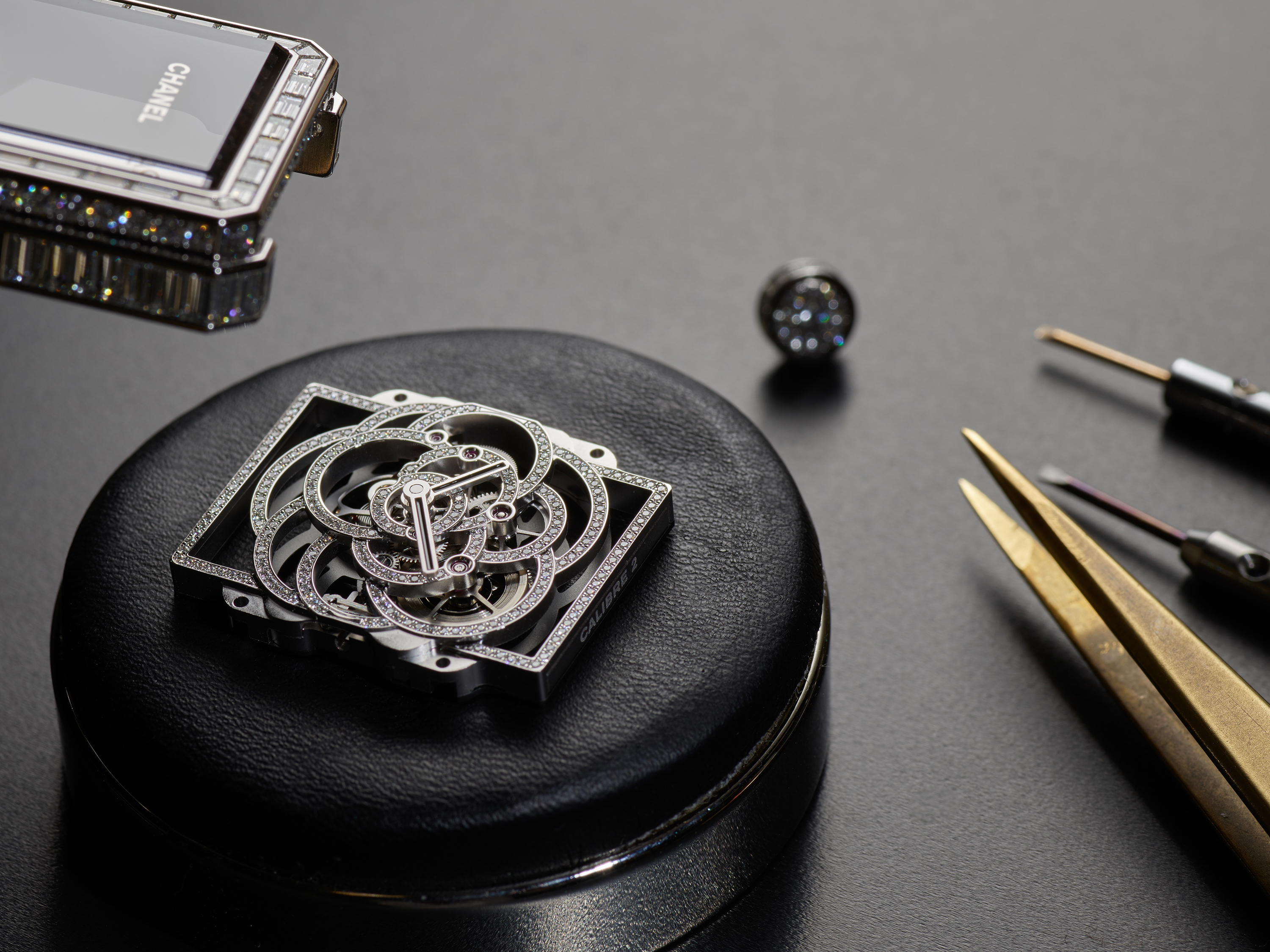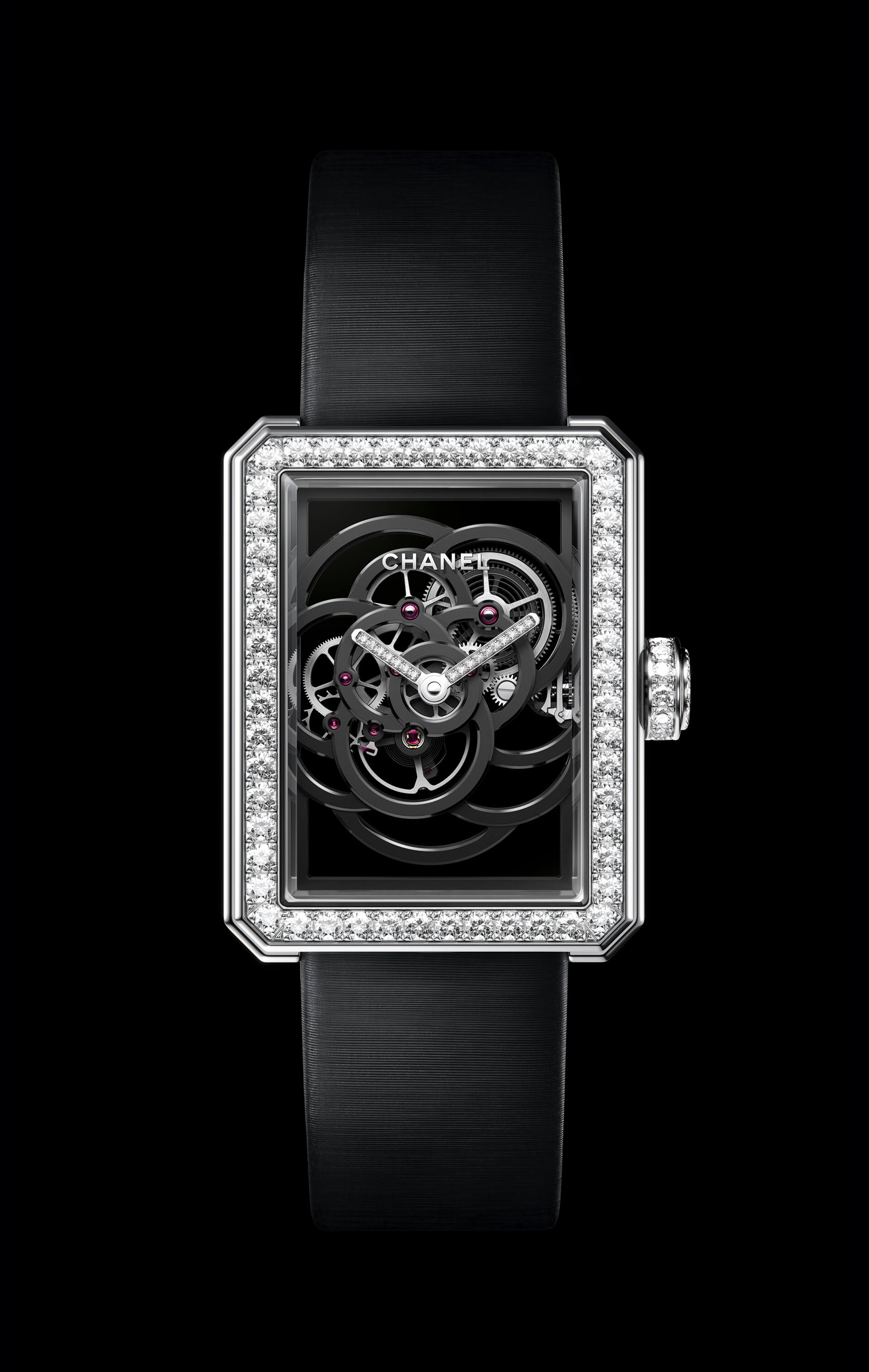 Cette pièce d’exception est animée par le deuxième mouvement in-house de CHANEL, le Calibre 2, dont la géométrie aérienne dessine une fleur de camélia. D’un noir absolu ou serti, ce mouvement squelette en or, unique en son genre incarne l’un des symboles iconique de la Maison.