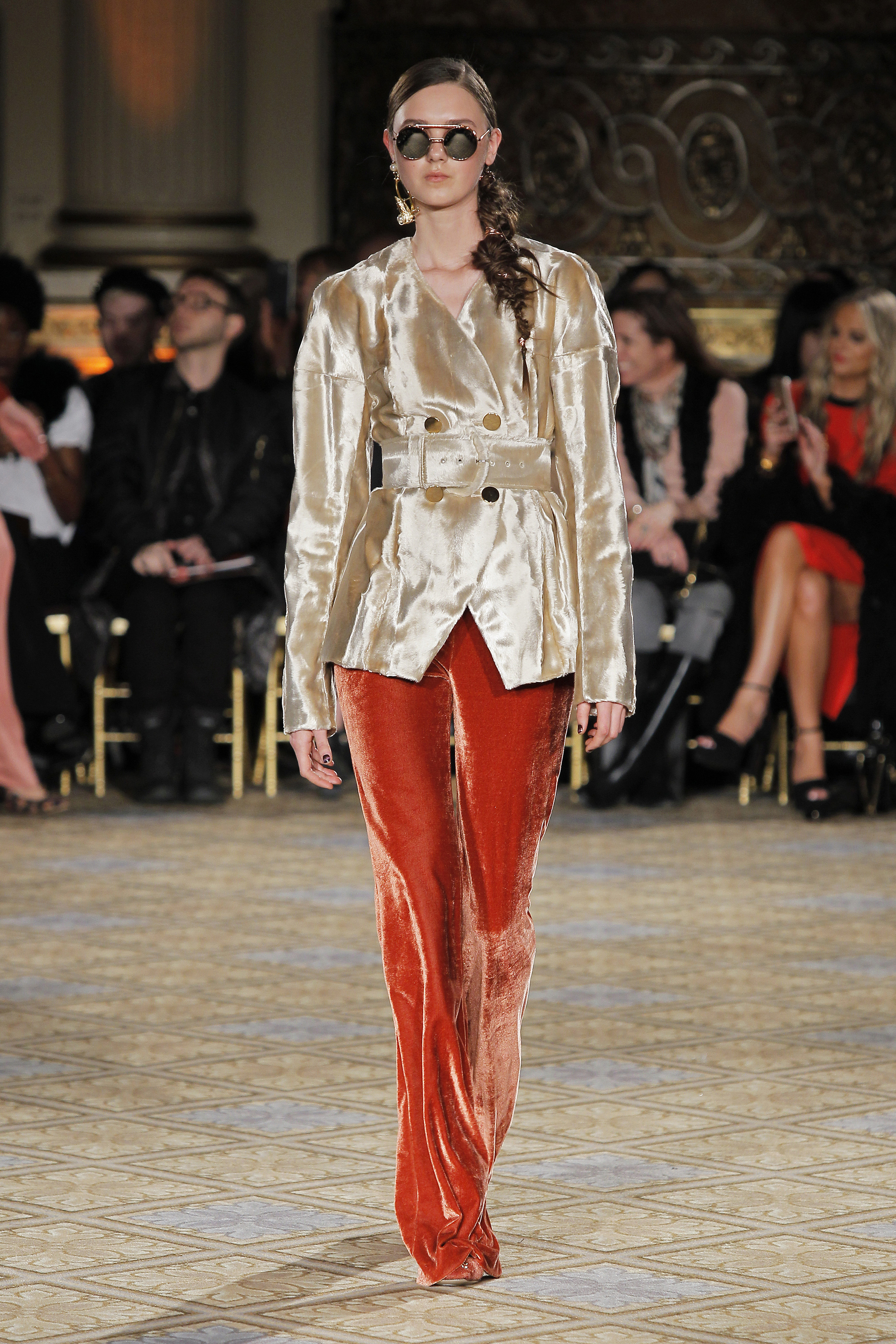Pour ma collection automne 2017, j’ai été inspiré par les formations de sable dans le parc de Valley of Fire. Les rainures et les conceptions balayées par le vent créent de belles couches qui ont contribué à inspirer les silhouettes puissantes de cette collection et les formes expressives et fortes. La profonde vallée de couleur argileuse s’est traduite par une riche palette de couleurs dorées avec des textures vagues et des velours de luxe. Pour les tenues d’extérieur, j’ai aussi trouvé l’inspiration dans les lignes et les couches du sculpteur minimaliste Richard Serra et son exposition permanente « The Hedgehog and the Fox, » exposée à l’Université de Princeton. La collection est élégante et audacieuse, moderne pour notre client. »