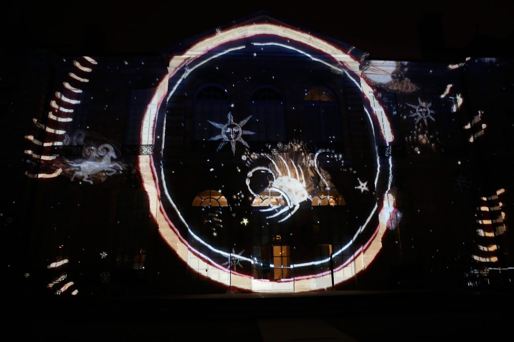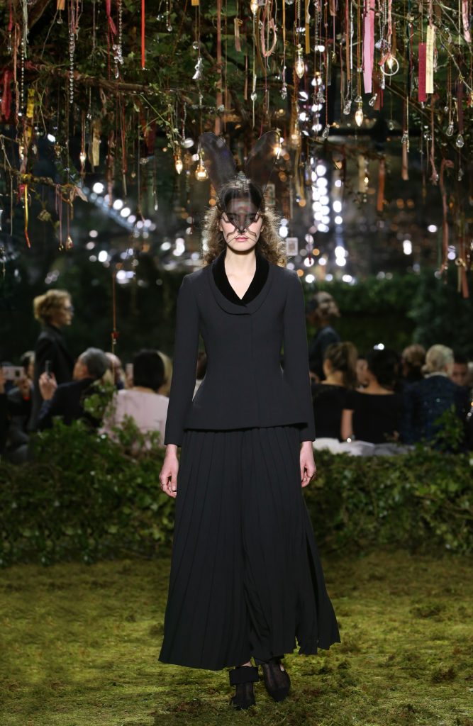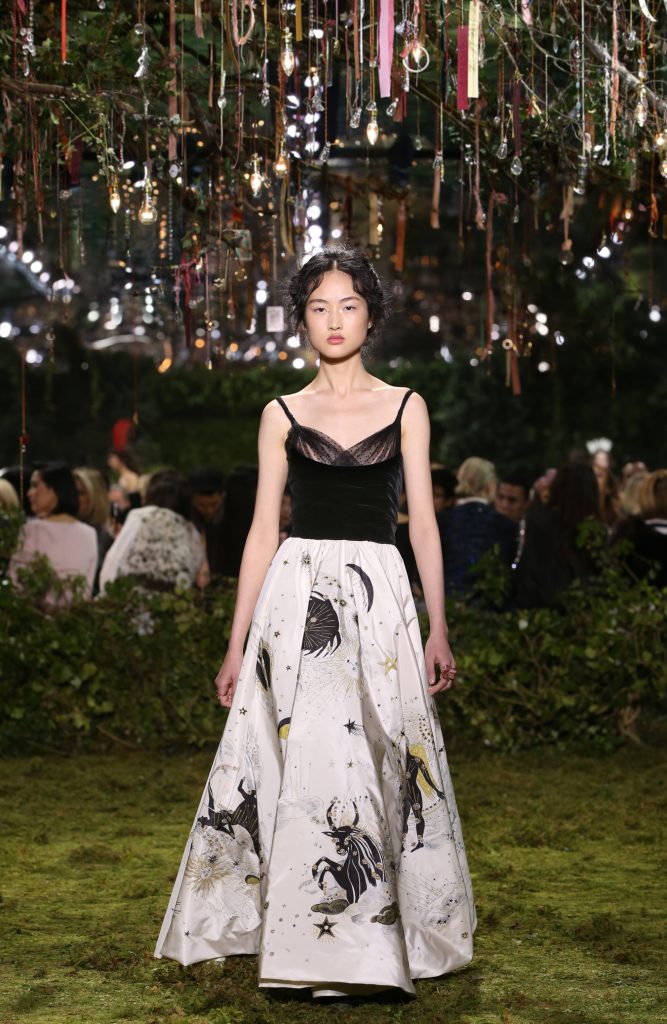 Maria Grazia Chiuri se rapproche de l’art de la divination et le transforme pour embellir ses créations : des étoiles brodées ressortent du tulle couleur or, les symboles des tarots sont peints à la main sur les pans blancs des robes longues. Ce blanc, que l’on retrouve à l’intérieur d’un manteau noir et qui complète le smoking féminin. C’est alors que surgit une série d’interprétations de cette tenue de soirée masculine, qui devient la pièce maîtresse d’une féminité contemporaine. Le tailleur Bar est décomposé et recomposé, jusqu’à devenir une cape. Des jupes-culottes amples, plissées elles aussi, révèlent du satin sur leur côté. Le manteau Domino développe sa grande capuche de velours noir.