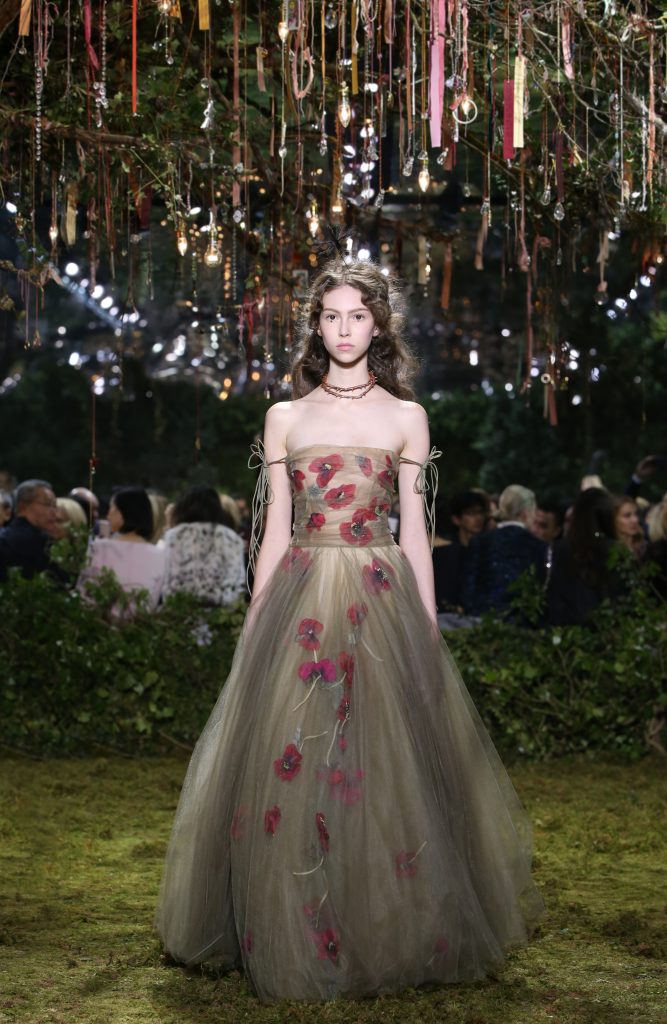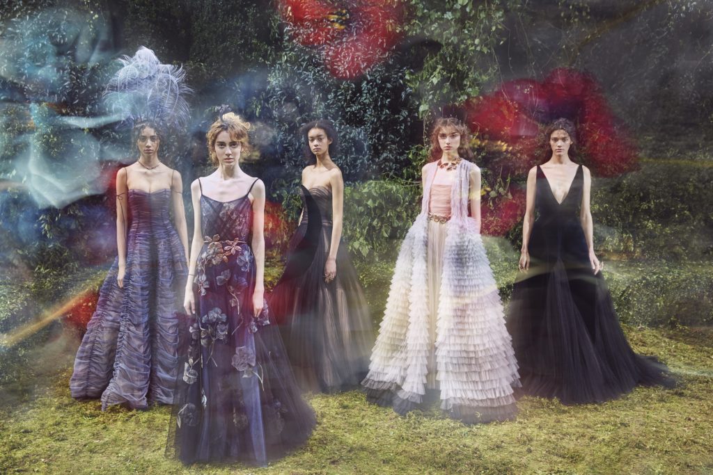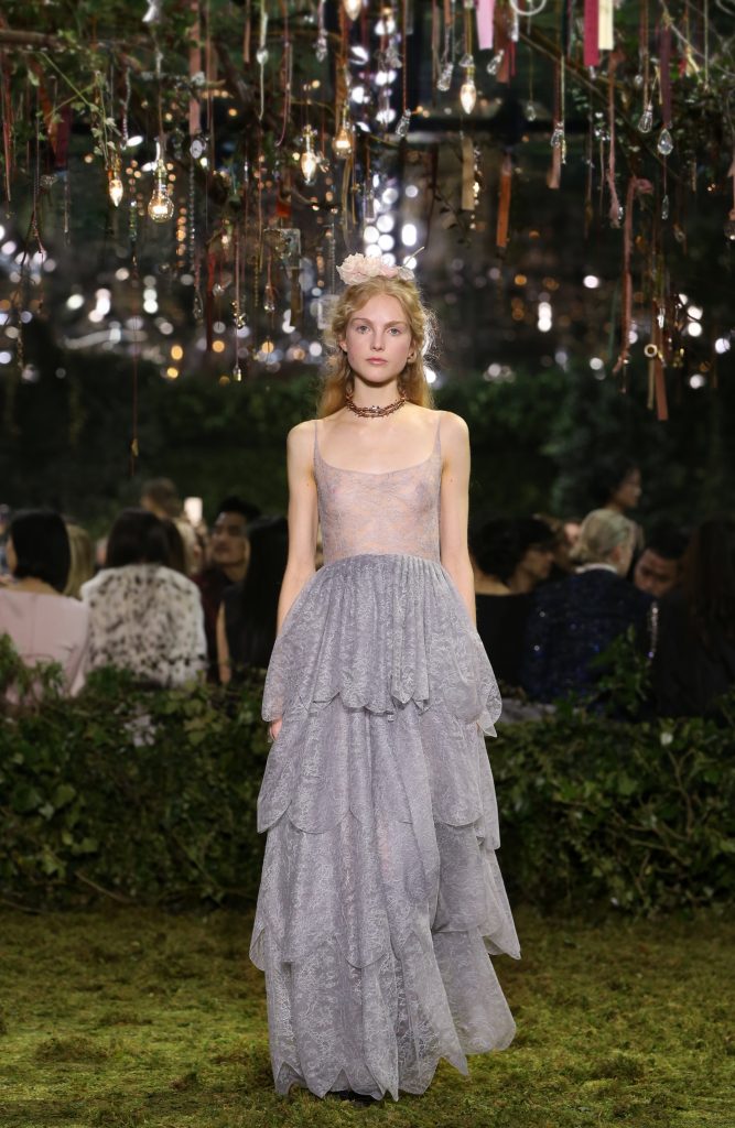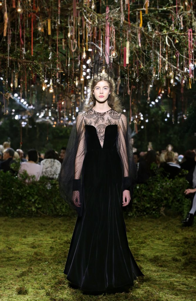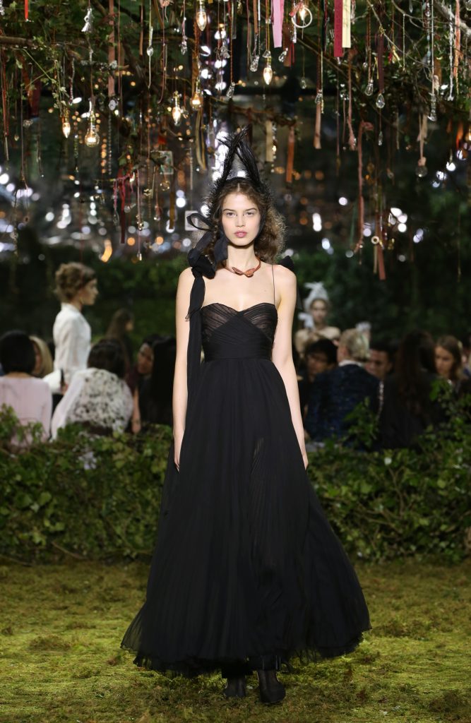 La mémoire devient le moteur d’une histoire nouvelle qui bouleverse l’abécédaire de la Maison pour le transposer dans des formes et des coupes qui sont l’empreinte des silhouettes, des rêves et des désirs des femmes d’aujourd’hui. C’est ainsi que la dentelle est décousue et remontée sur l’organza, et que les tulles plissés aux couleurs de contes de fées se superposent en compositions à la fois légères et majestueuses.Les chapeaux et les masques de Stephen Jones sont autant de fantasmagories gothiques en version punk.