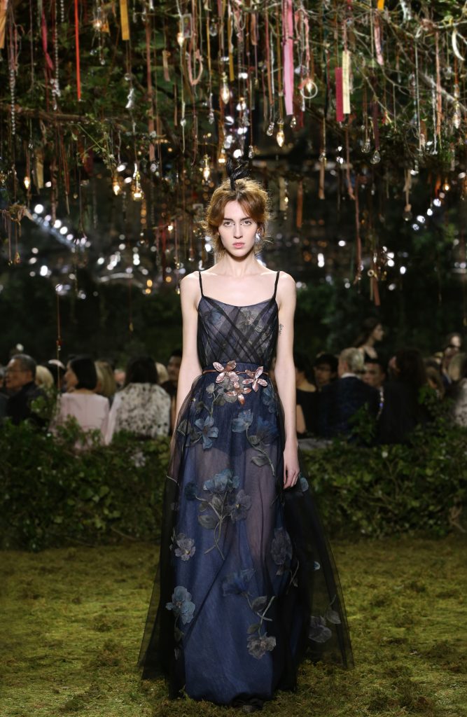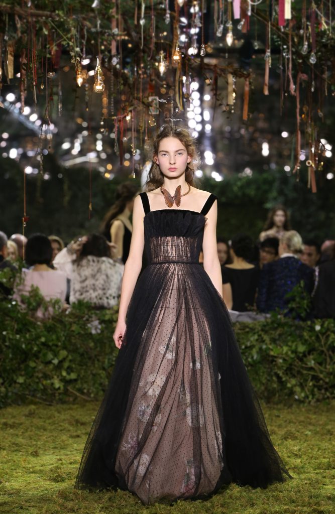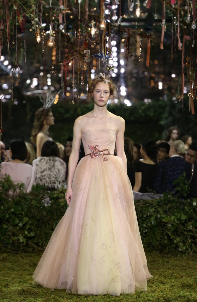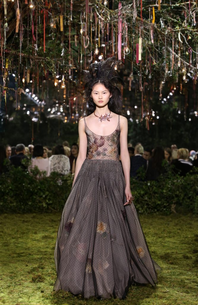 Fascinée par les interprétations multiples que cette forme archétypale a soulevées au fil du temps, elle s’est aperçue que son aventure au cœur du monde de Dior ressemblait à une entrée dans un labyrinthe, dont le chemin est parsemé de ces fleurs, de ces plantes, de ces images allégoriques qui font partie de l’iconographie des lieux et qui, en même temps, renvoient à l’imaginaire de Christian Dior, qui écrivait d’elles : « Après la femme, les fleurs sont les créations les plus divines. Elles sont si délicates et si charmantes, mais il faut les employer avec soin. » C’est ainsi que sont nées ces robes du soir aux couleurs changeantes, poudrées (mauve, bleu, rose, gris), qui évoquent le passage des saisons et de la vie, et dont les couches de tulle emprisonnent des fleurs merveilleuses, comme celles que nous conservons dans nos herbiers les plus précieux. Claude Lalanne, quant à elle, a imaginé que les fleurs, les ronces, les papillons des bijoux se posaient sur des corps prêts à reprendre vie.