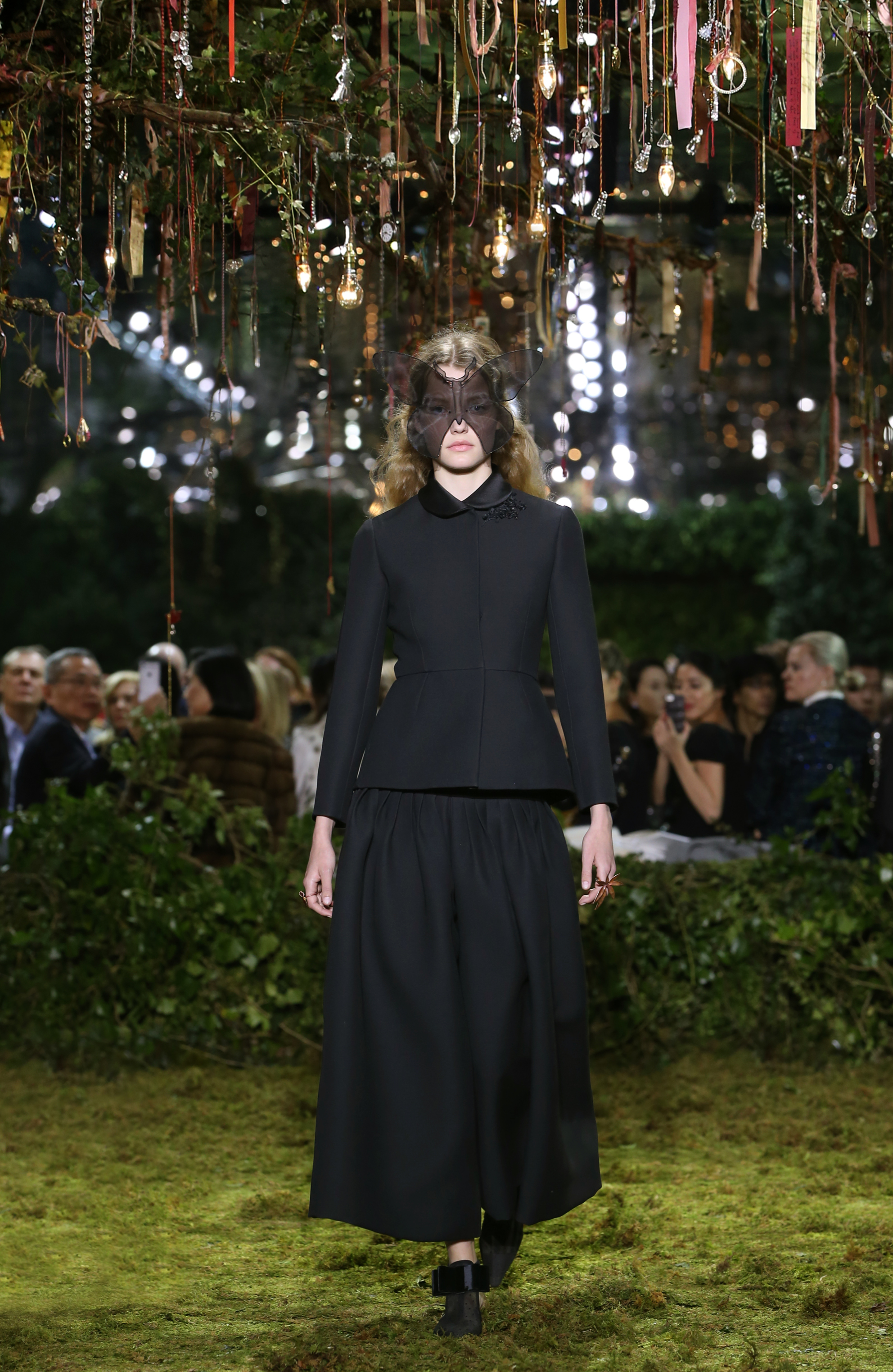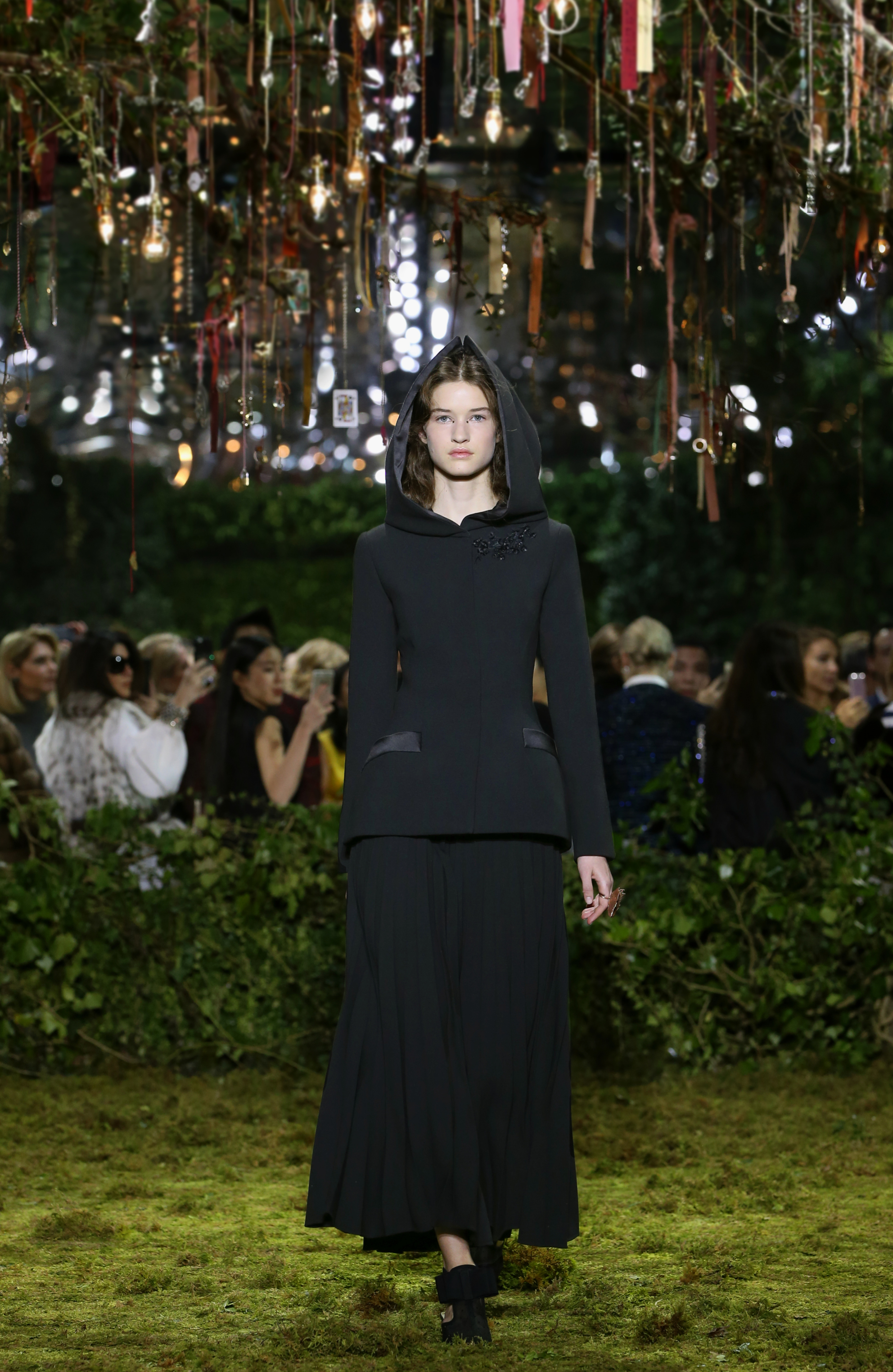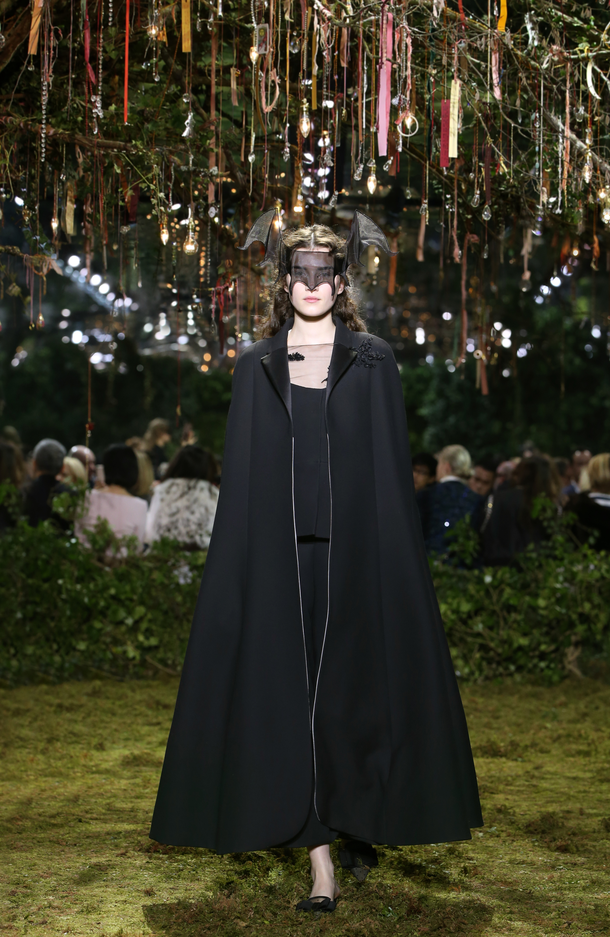Maria Grazia Chiuri se rapproche de l’art de la divination et le transforme pour embellir ses créations : des étoiles brodées ressortent du tulle couleur or, les symboles des tarots sont peints à la main sur les pans blancs des robes longues. Ce blanc, que l’on retrouve à l’intérieur d’un manteau noir et qui complète le smoking féminin. C’est alors que surgit une série d’interprétations de cette tenue de soirée masculine, qui devient la pièce maîtresse d’une féminité contemporaine. Le tailleur Bar est décomposé et recomposé, jusqu’à devenir une cape. Des jupes-culottes amples, plissées elles aussi, révèlent du satin sur leur côté. Le manteau Domino développe sa grande capuche de velours noir.