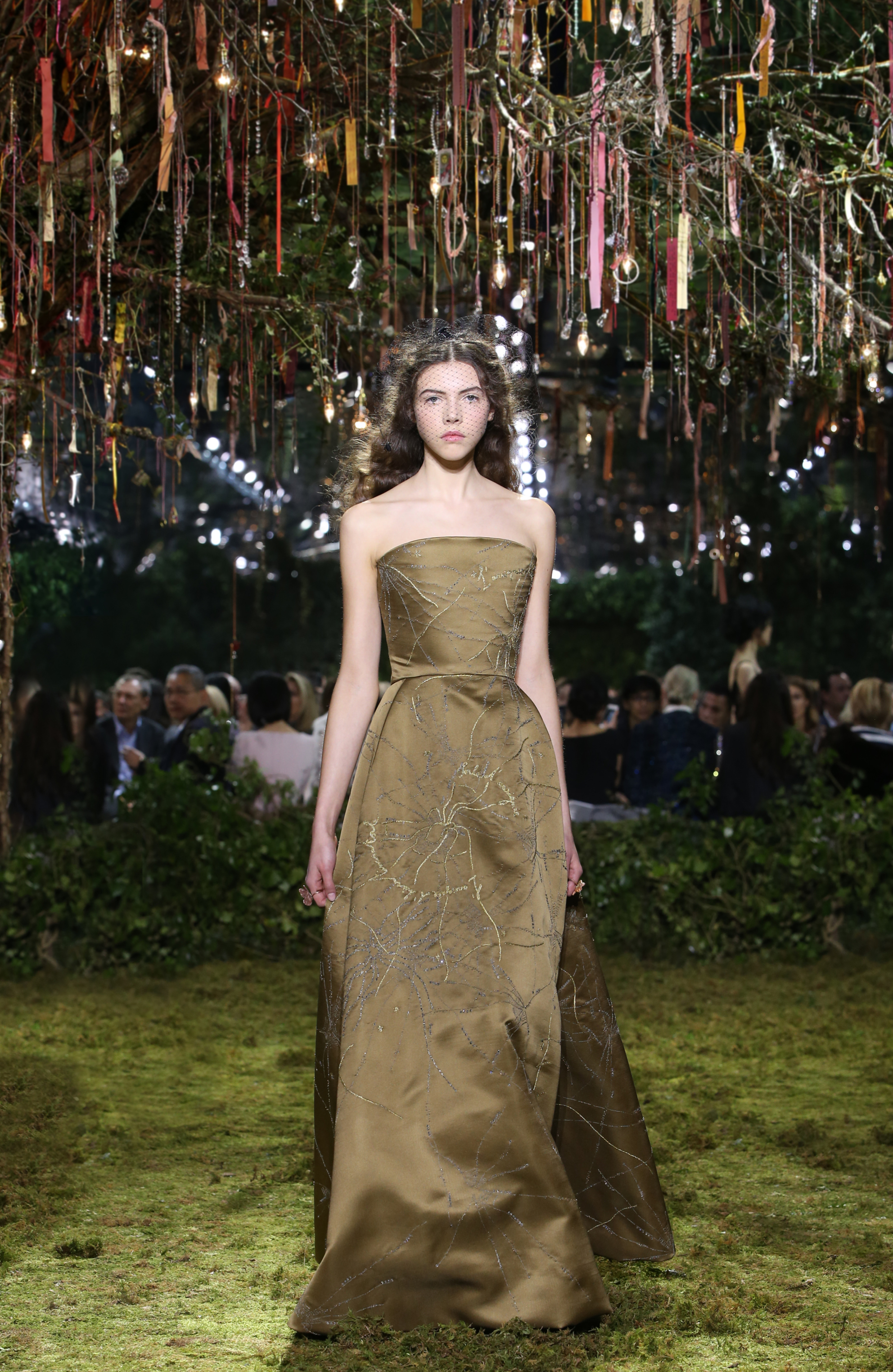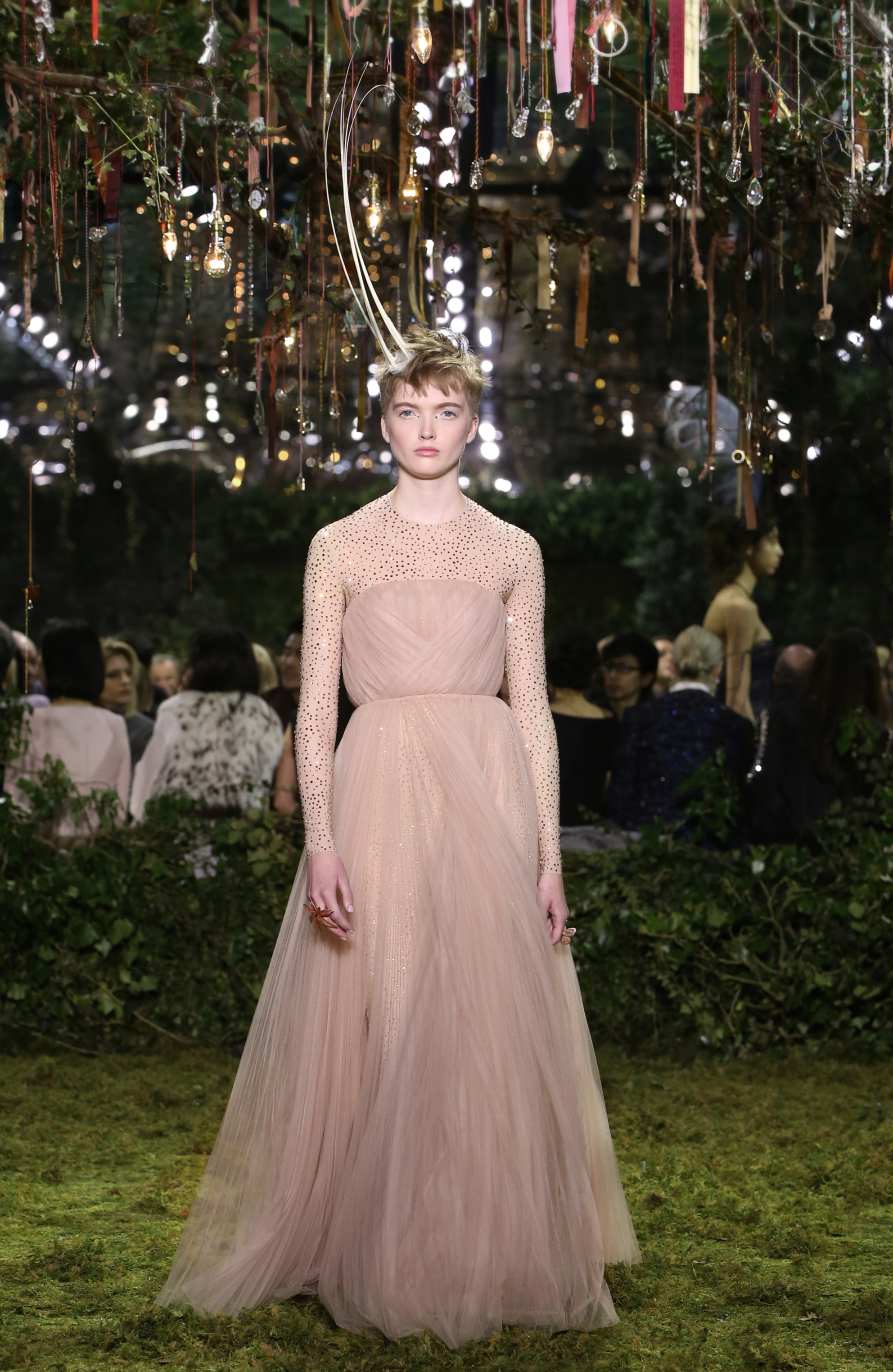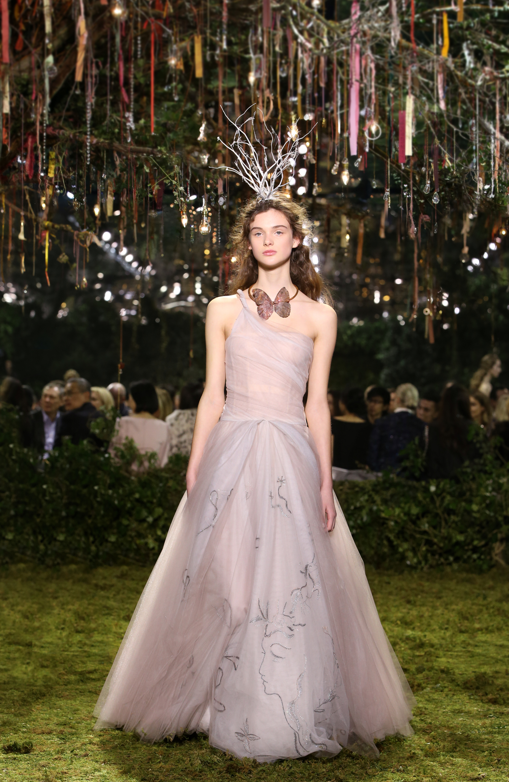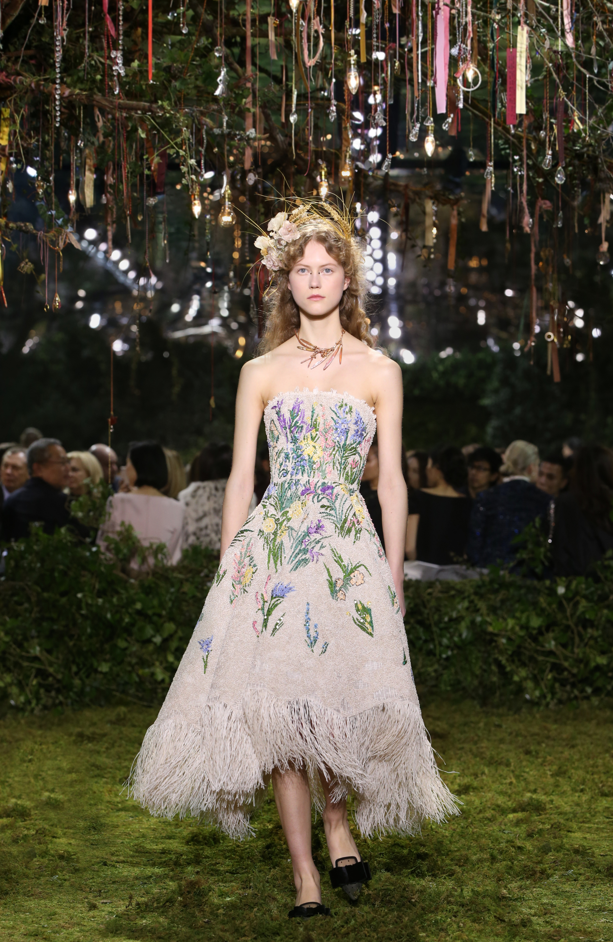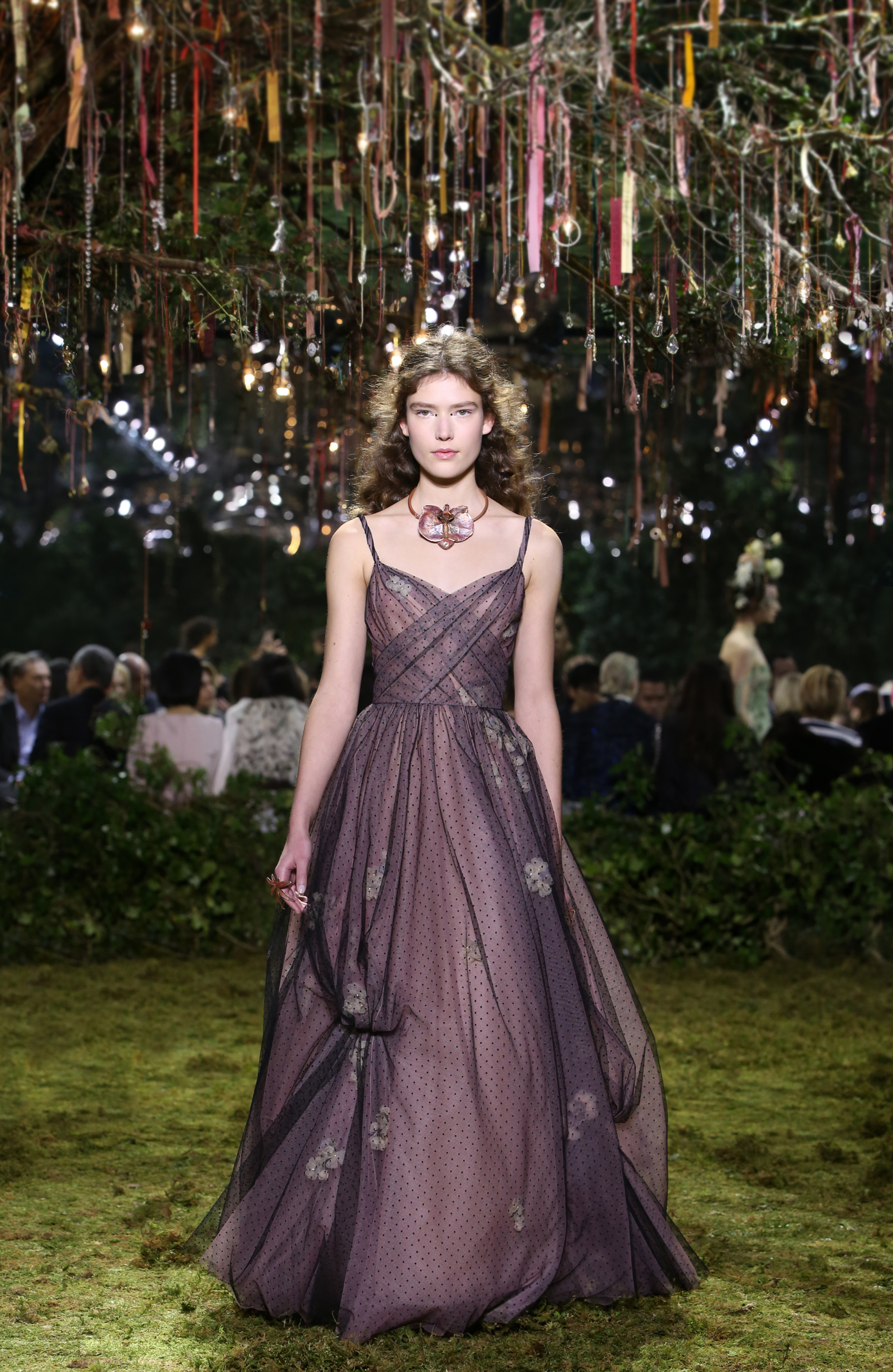 Fascinée par les interprétations multiples que cette forme archétypale a soulevées au fil du temps, elle s’est aperçue que son aventure au cœur du monde de Dior ressemblait à une entrée dans un labyrinthe, dont le chemin est parsemé de ces fleurs, de ces plantes, de ces images allégoriques qui font partie de l’iconographie des lieux et qui, en même temps, renvoient à l’imaginaire de Christian Dior, qui écrivait d’elles : « Après la femme, les fleurs sont les créations les plus divines. Elles sont si délicates et si charmantes, mais il faut les employer avec soin. » C’est ainsi que sont nées ces robes du soir aux couleurs changeantes, poudrées (mauve, bleu, rose, gris), qui évoquent le passage des saisons et de la vie, et dont les couches de tulle emprisonnent des fleurs merveilleuses, comme celles que nous conservons dans nos herbiers les plus précieux. Claude Lalanne, quant à elle, a imaginé que les fleurs, les ronces, les papillons des bijoux se posaient sur des corps prêts à reprendre vie.