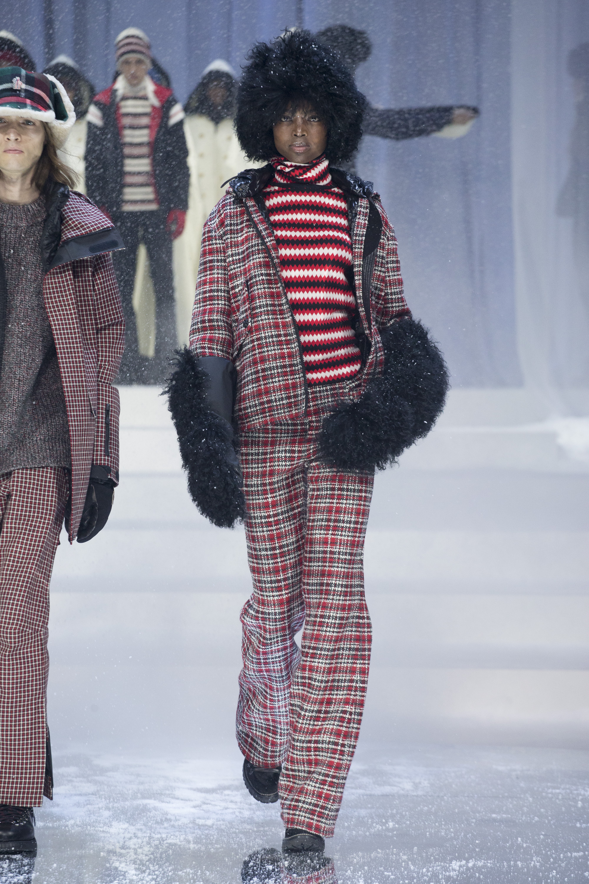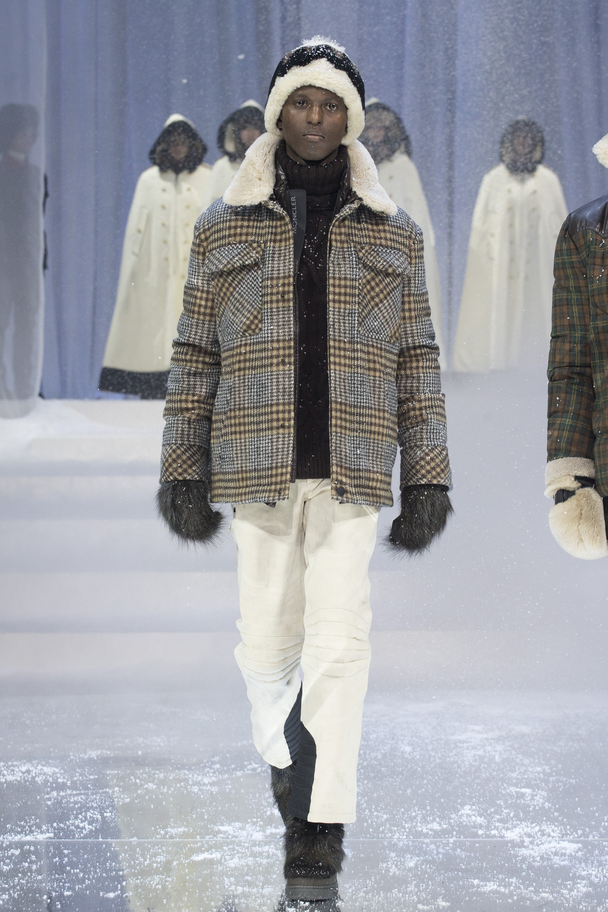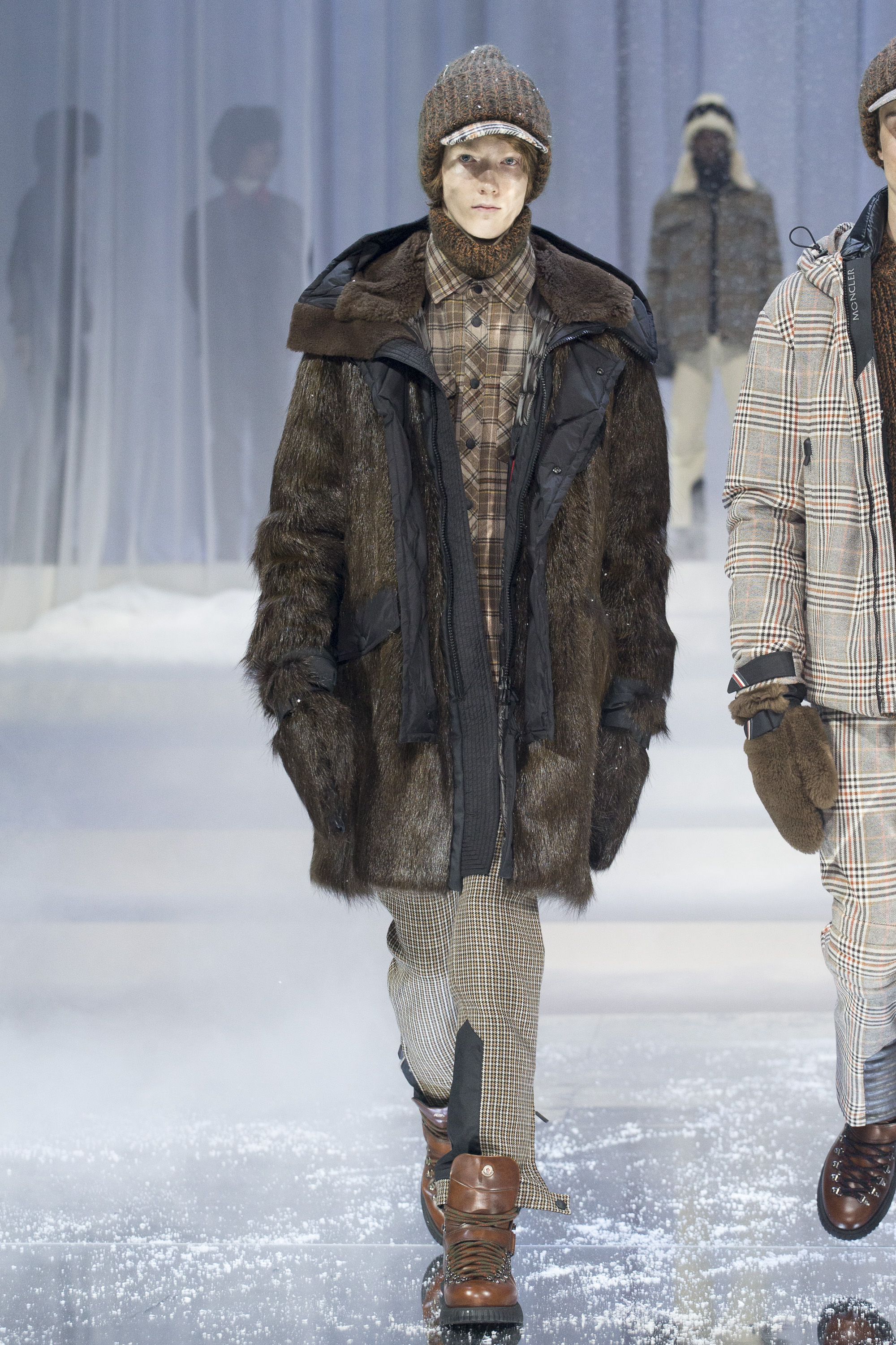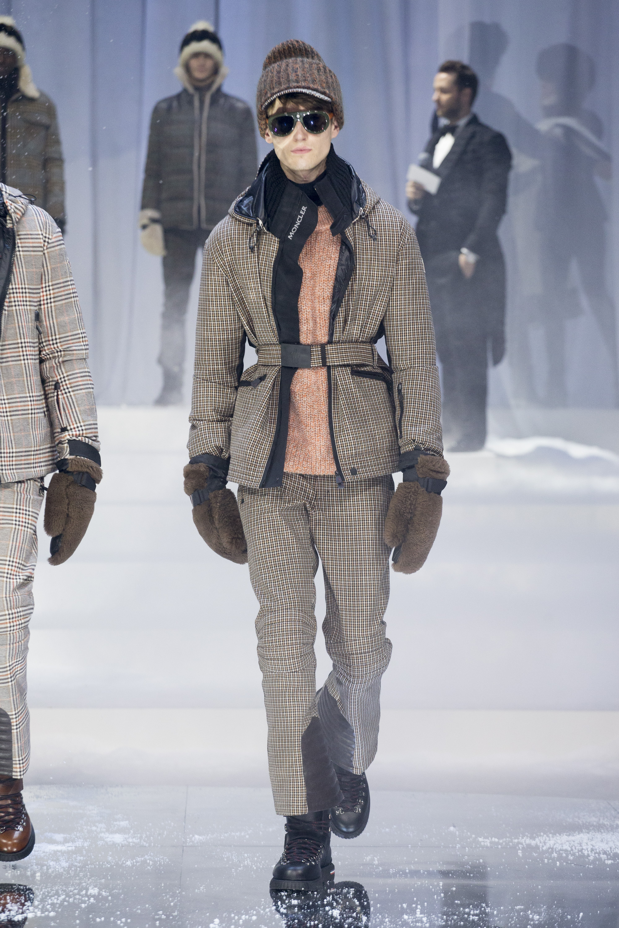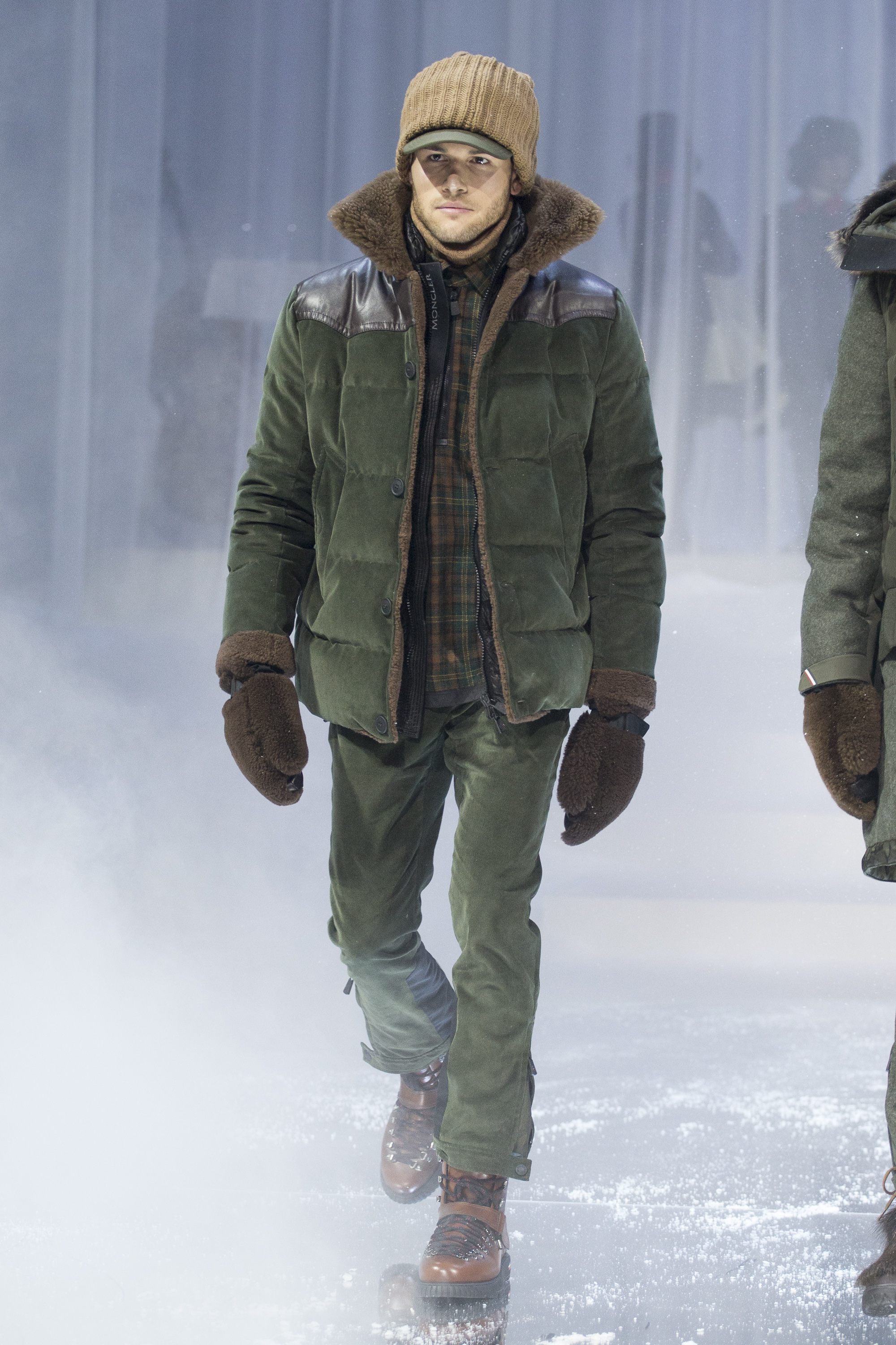Une fois quittées les pistes, l’après-ski de Moncler Grenoble se décline en ce sens et sur une palette de nuances profondes et apaisantes, clairement naturelles: camel, havane et chocolat. On ressort les trames graphiques des Prince de Galles et des pieds-de-poule au parfum d’autrefois. On se souvient des inspirations stylistiques osées et de la vocation géométrique accentuée d’un certain tayloring masculin des années 60 et de la décennie suivante. Nuances dégradées et modèles linéaires signent les chemises masculines, les blousons et les jupes. Outre des laines, les matières s’enrichissent des textures de différents tissus de production japonaise, plus secs et légers, démontés et reconstruits sur le métier avec un procédé manuel complexe, mais aussi de la présence du velours de coton plein ou côtelé. La maille aussi s’amplifie, avec des pulls souvent tricotés épais fait main et des broderies all over précieusement finies au crochet.