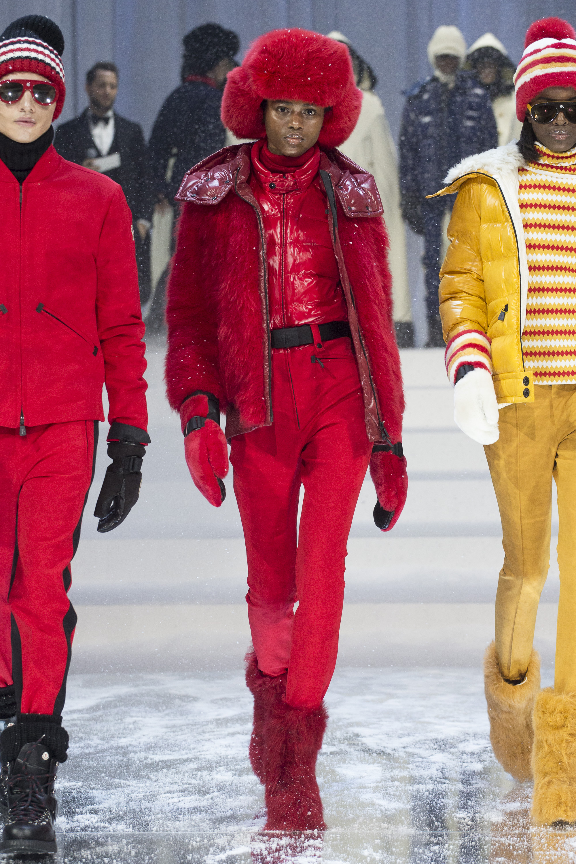 Le nylon technique, souvent avec une surface plus irrégulière et traitée chintz, se pare des couleurs classiques de l’héritage Moncler, en particulier dans le binôme rouge feu et bleu ciel. Les pantalons s’évasent légèrement avec une touche Seventy, alors que les vestes font un clin d’œil aux années 80 et sont slim, nettes, essentielles et rythmées par de un matelassage dense qui dessinent et enveloppent le buste.