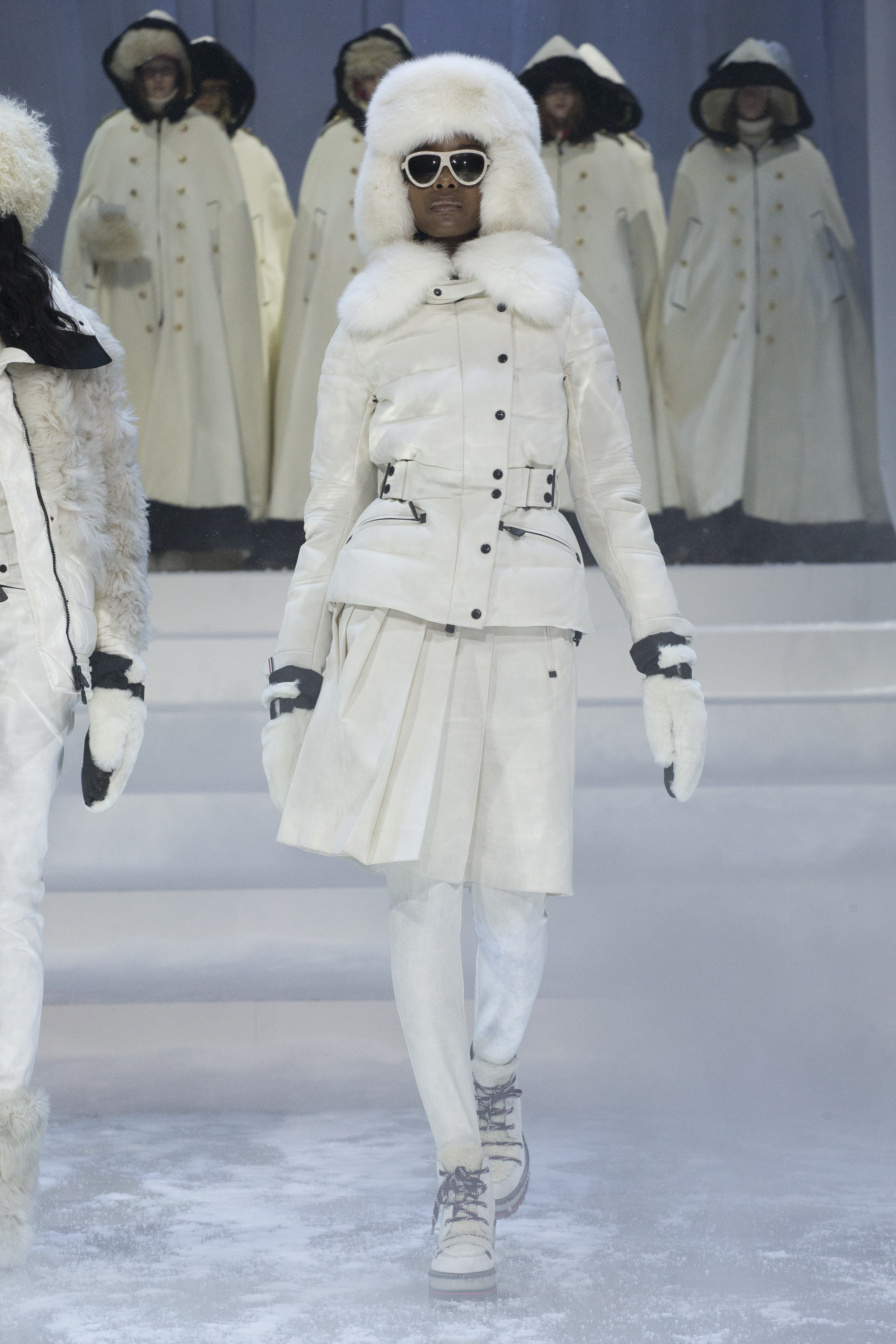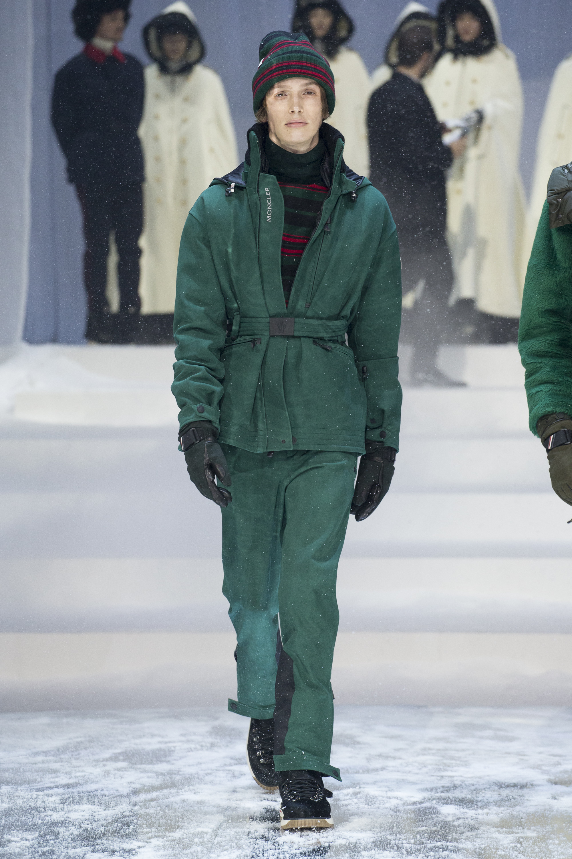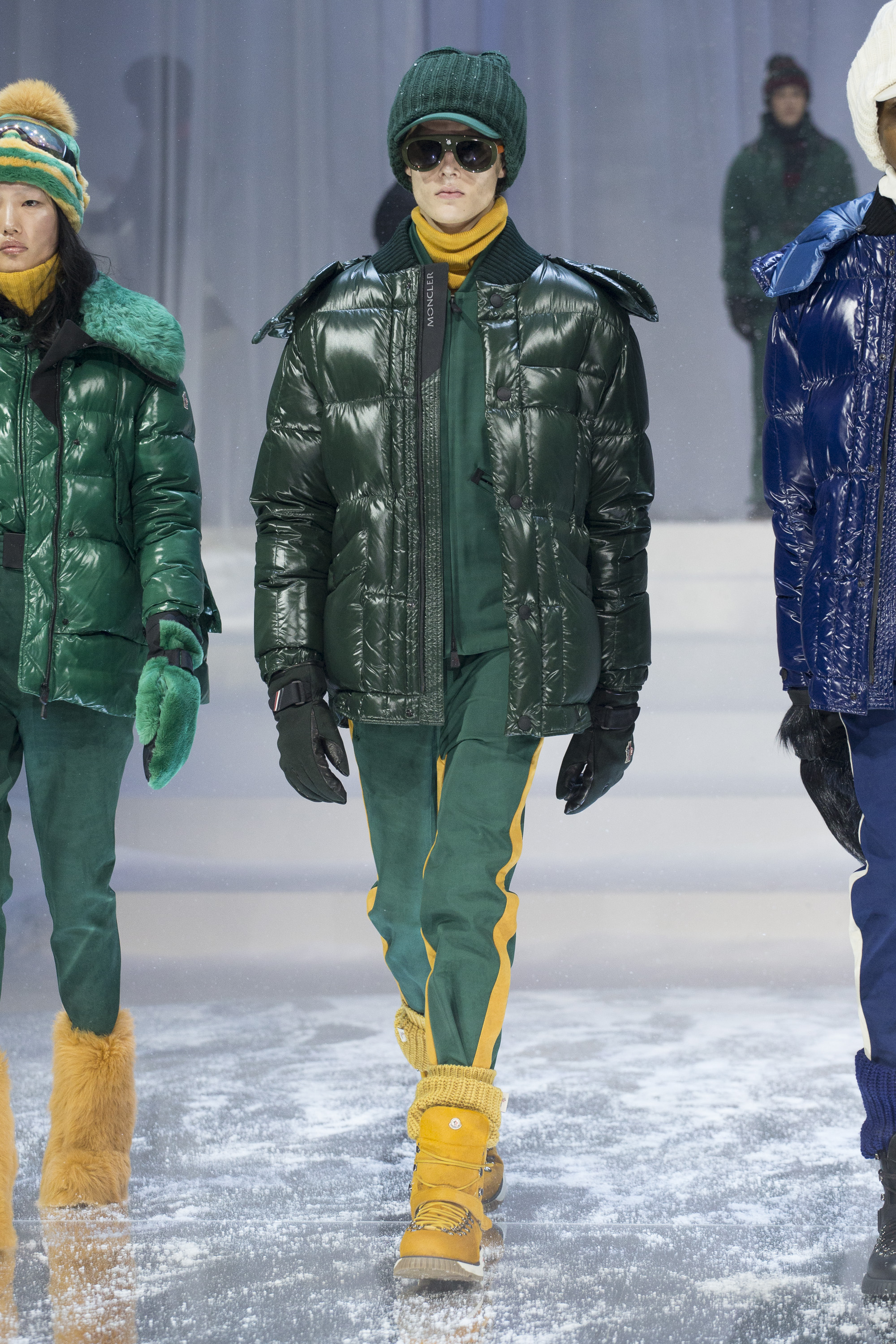 L’idée de base de Moncler Grenoble est de couvrir tous les aspects et chaque moment de la vie en extérieure dans une station de montagne durant la saison froide. Un concept esthétique inédit qui mélange citations et linéarité en parcourant librement les années 60, 70 et 80. Les combinaisons de ski pour hommes et femmes, laminées avec un film à l’intérieur et thermo-soudées pour accentuer au maximum leur caractéristique waterproof, sont de plus en plus chaudes et légères et emploient des coefficients de plumes spéciaux.