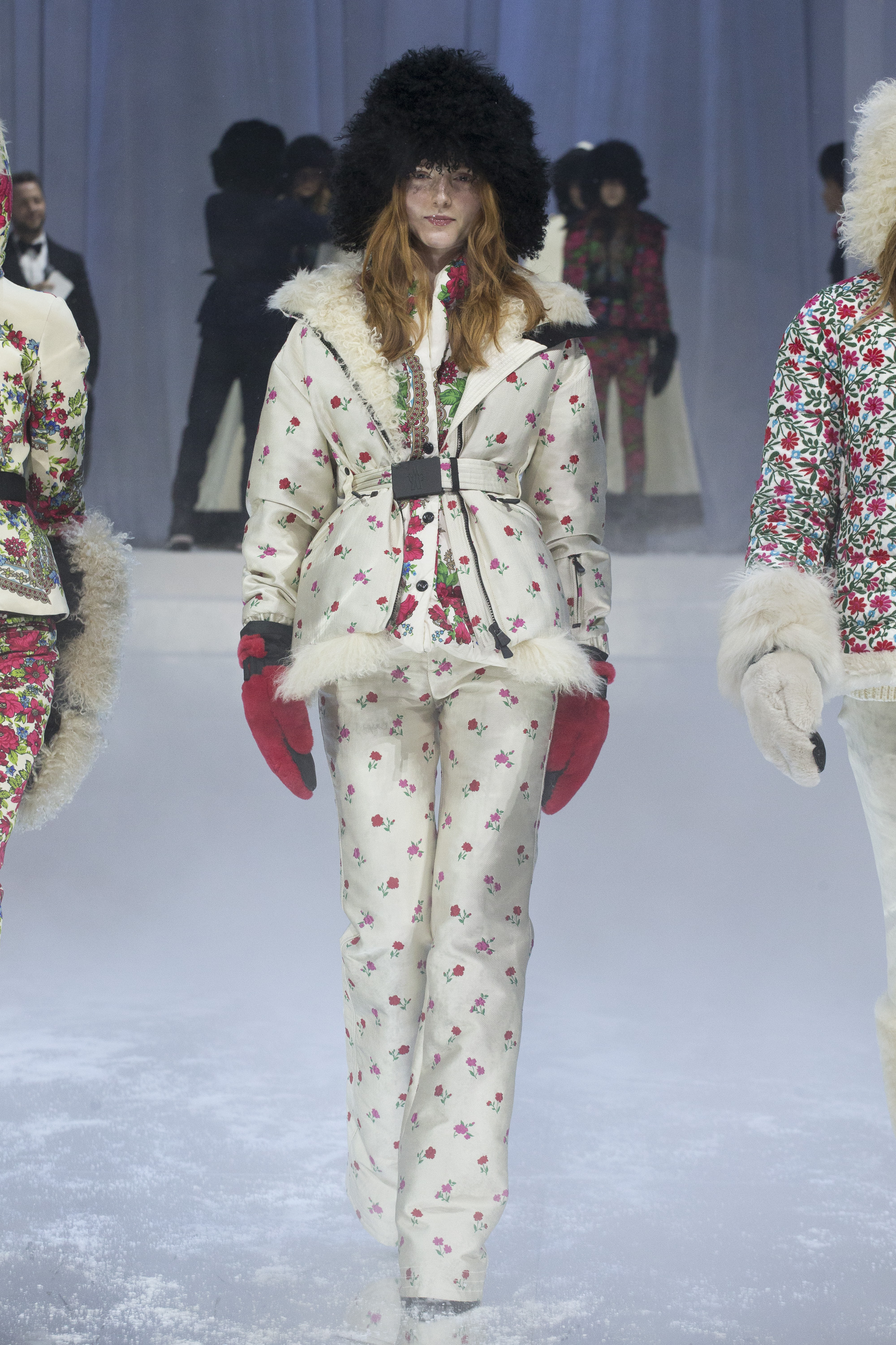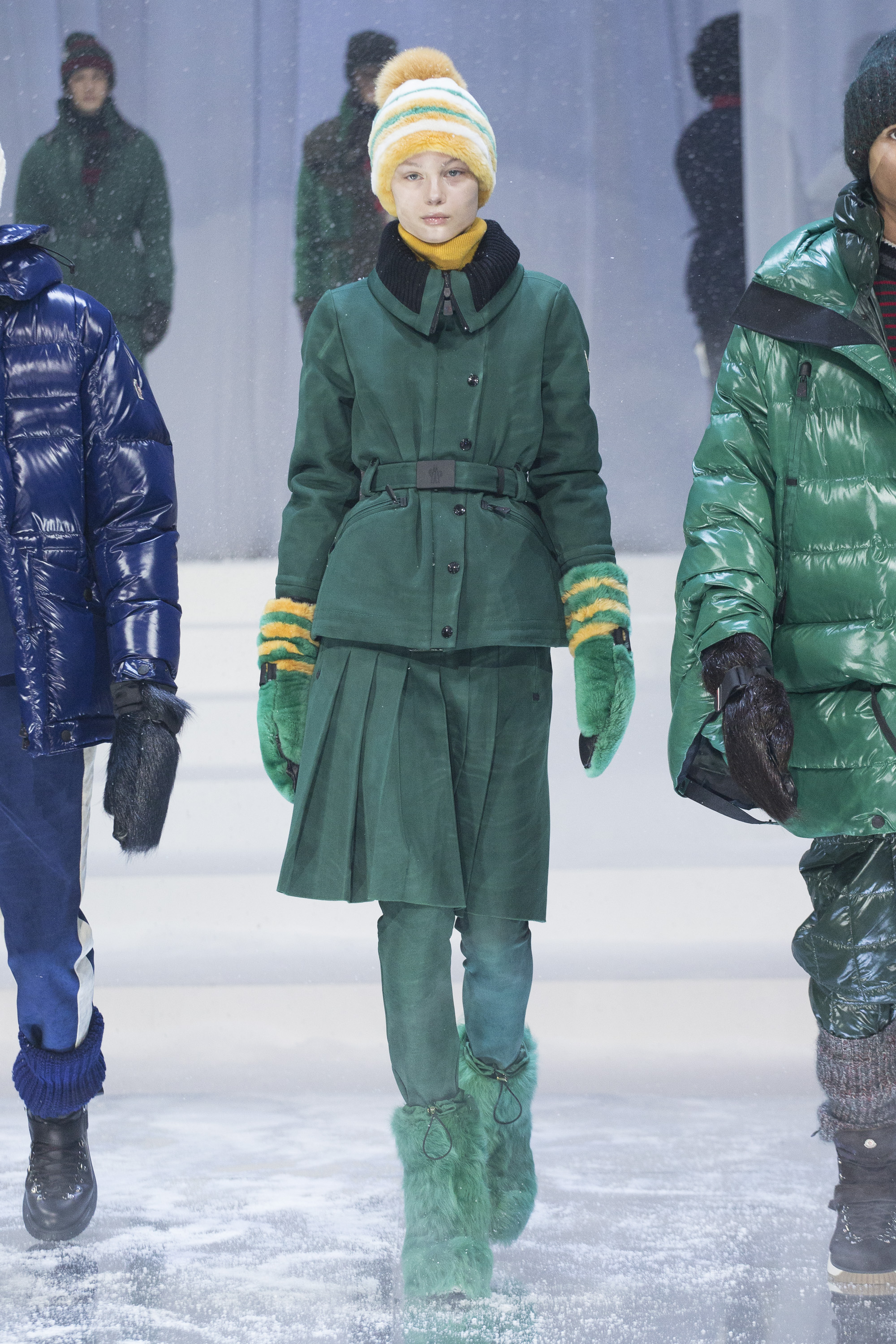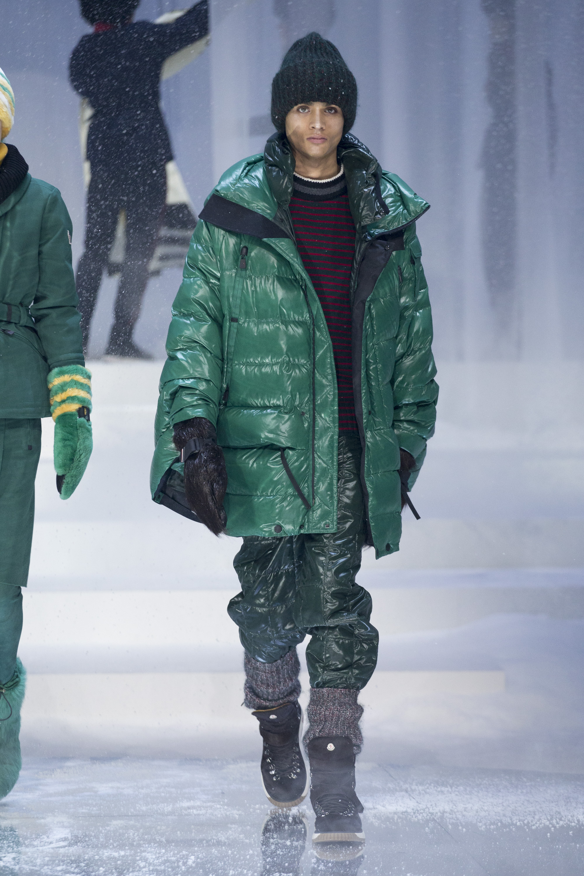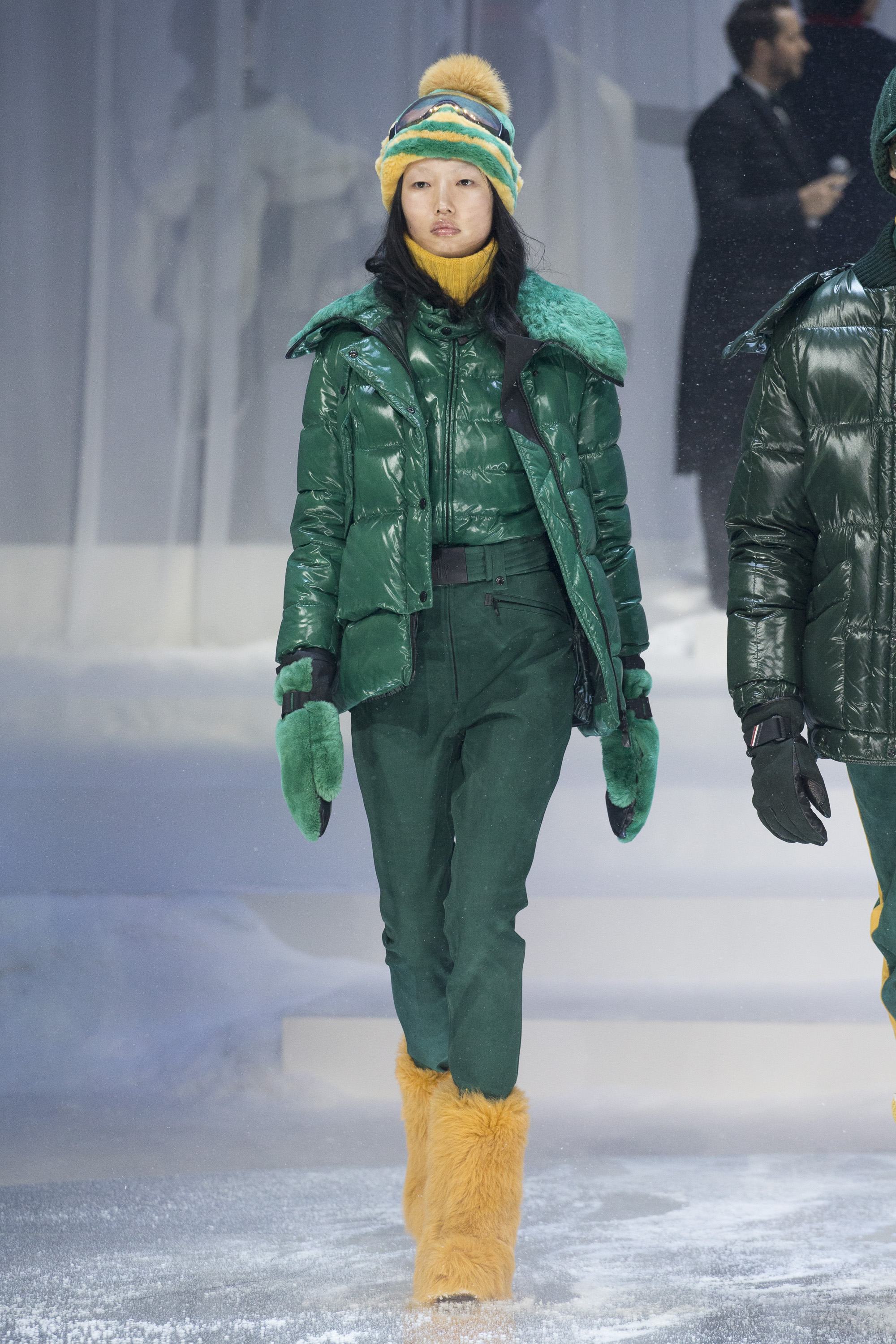 L’idée de base de Moncler Grenoble est de couvrir tous les aspects et chaque moment de la vie en extérieure dans une station de montagne durant la saison froide. Un concept esthétique inédit qui mélange citations et linéarité en parcourant librement les années 60, 70 et 80. Les combinaisons de ski pour hommes et femmes, laminées avec un film à l’intérieur et thermo-soudées pour accentuer au maximum leur caractéristique waterproof, sont de plus en plus chaudes et légères et emploient des coefficients de plumes spéciaux.