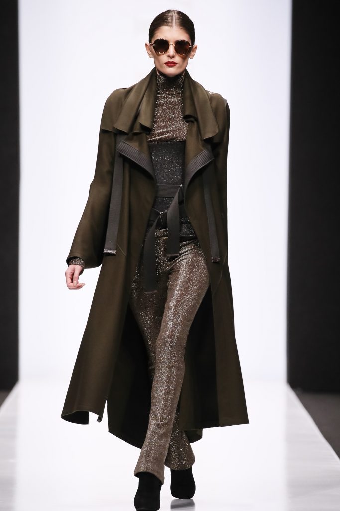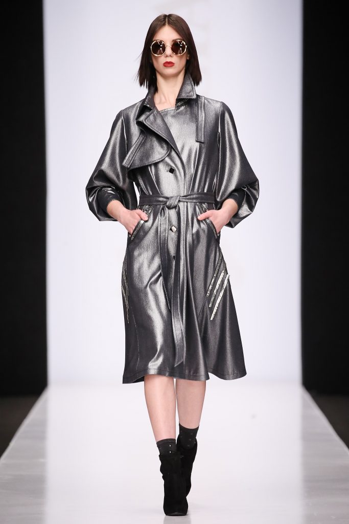 Futurisme sous-couvert de manteau d’officier . Trench métallique : un défilé qui relais la tendance cosmique. Désormais dans la course à l’espace les frontières s’abattent: c’est l’espoir qui se lie dans la combinaison de paillettes et de cuir.