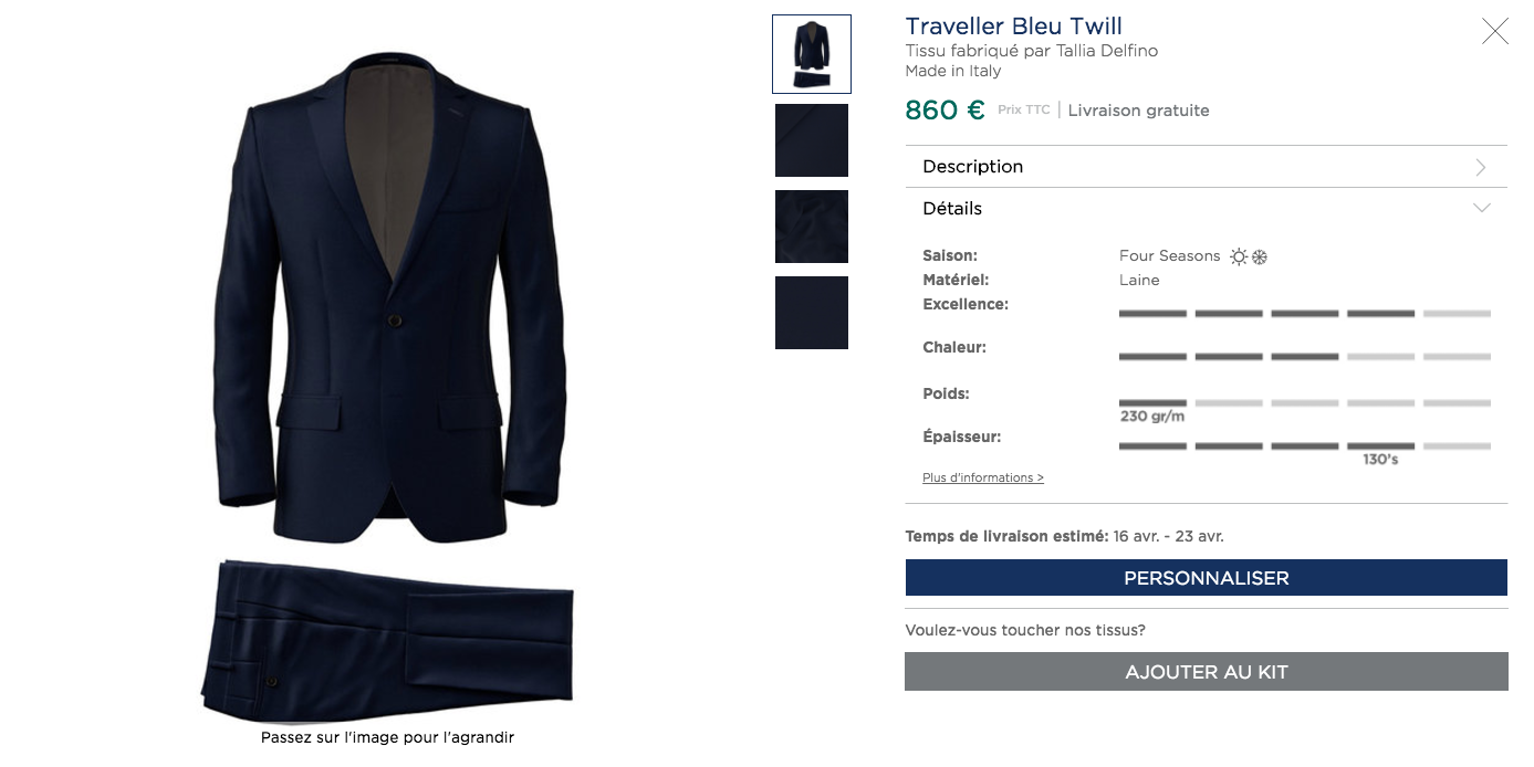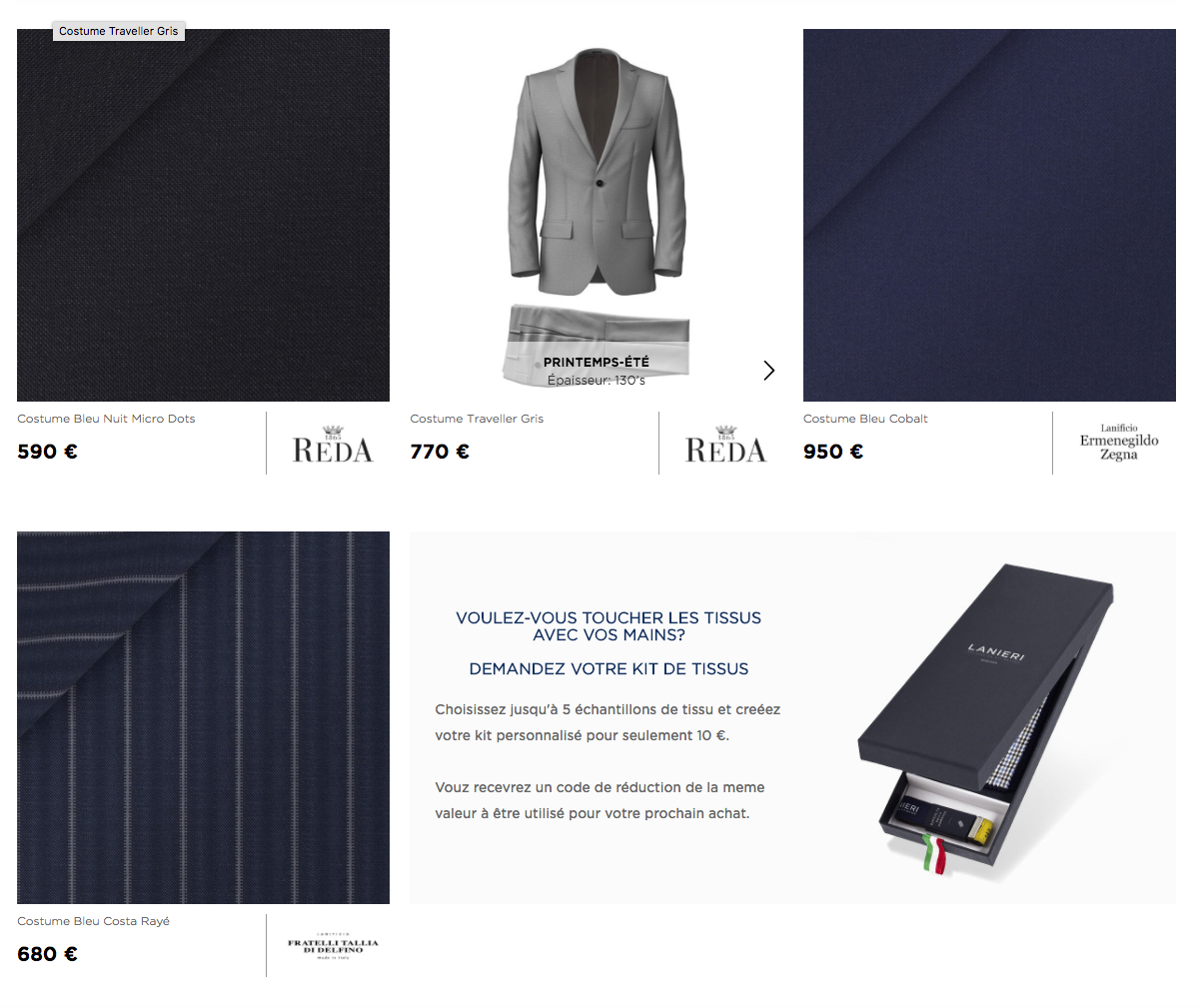 L’Offre Lanieri s’applique aux costumes, chemises, blazers, pantalons, accessoires et plus récemment aux manteaux, personnalisables en quelques clics pour s’adapter au style de chaque client et expédiés dans plus de 30 pays en 4 à 5 semaines.
