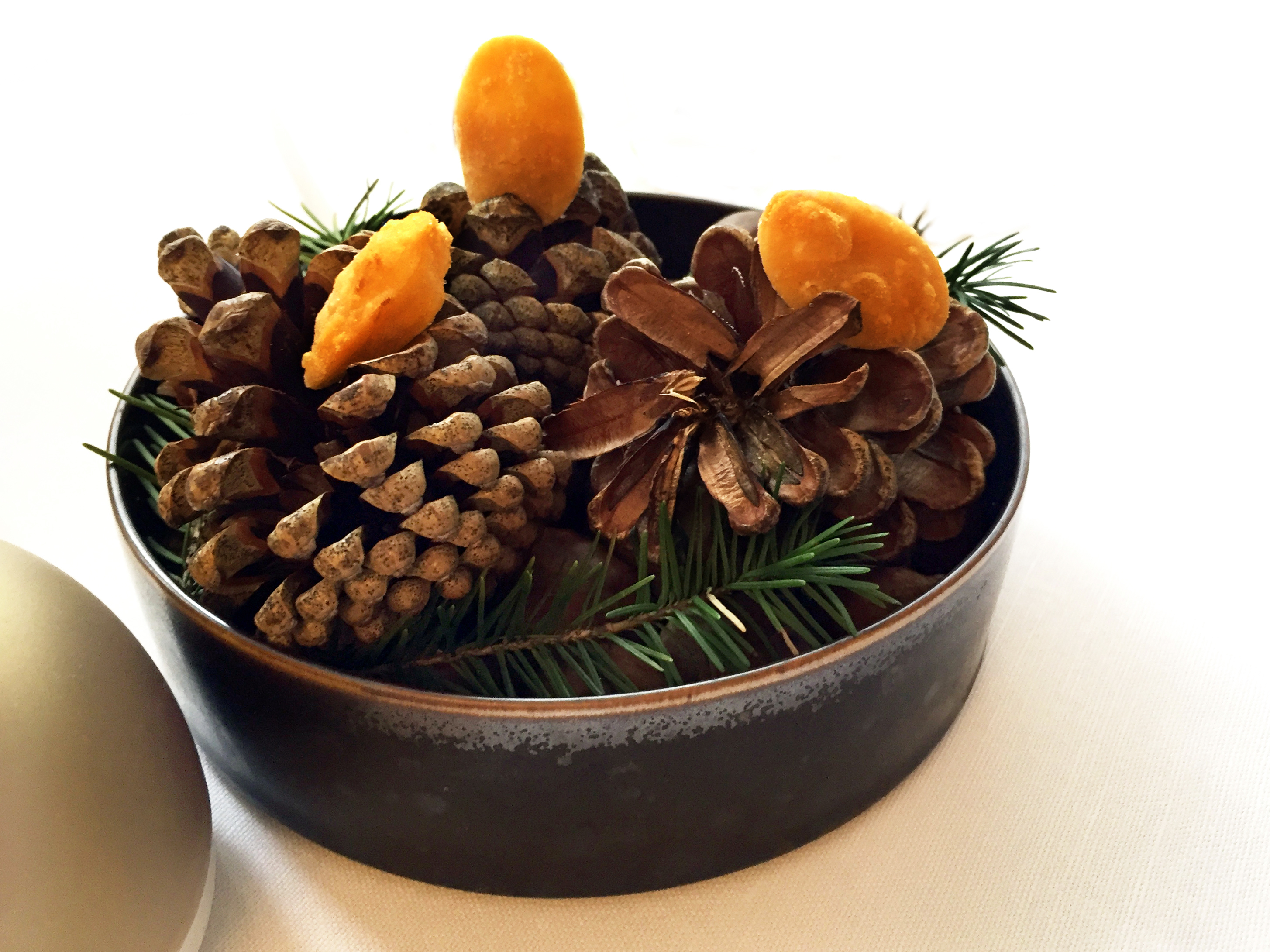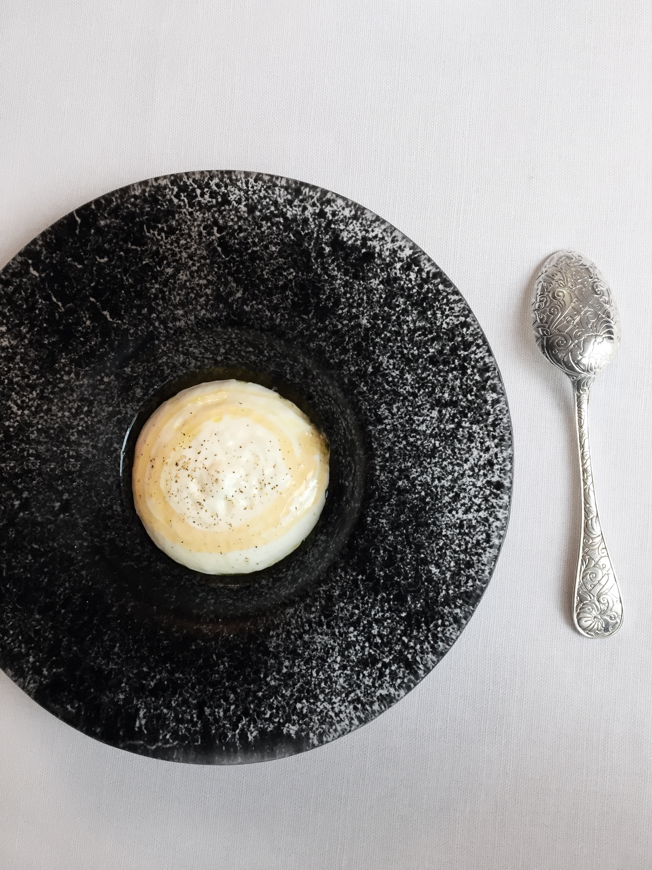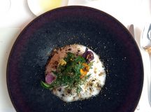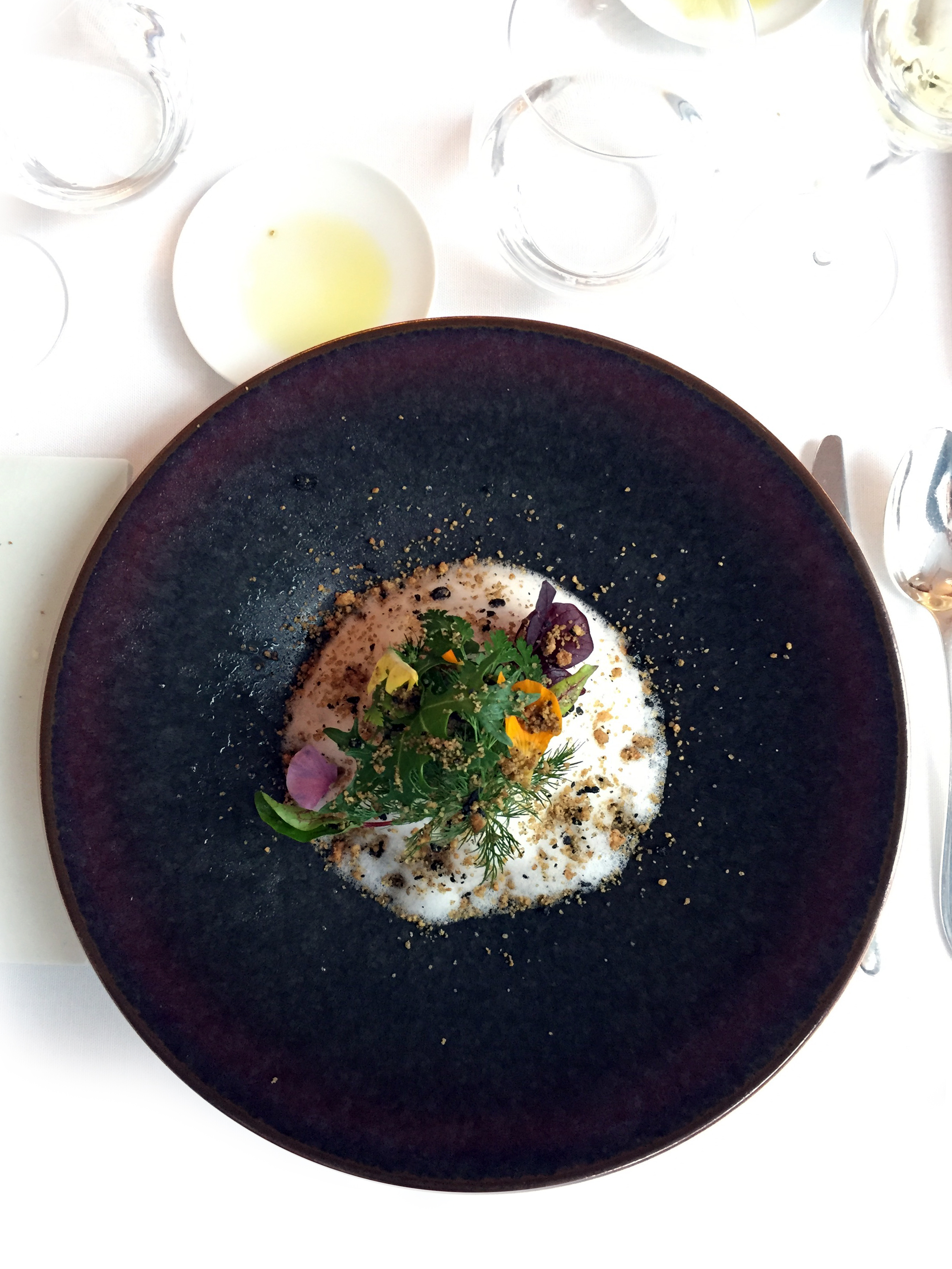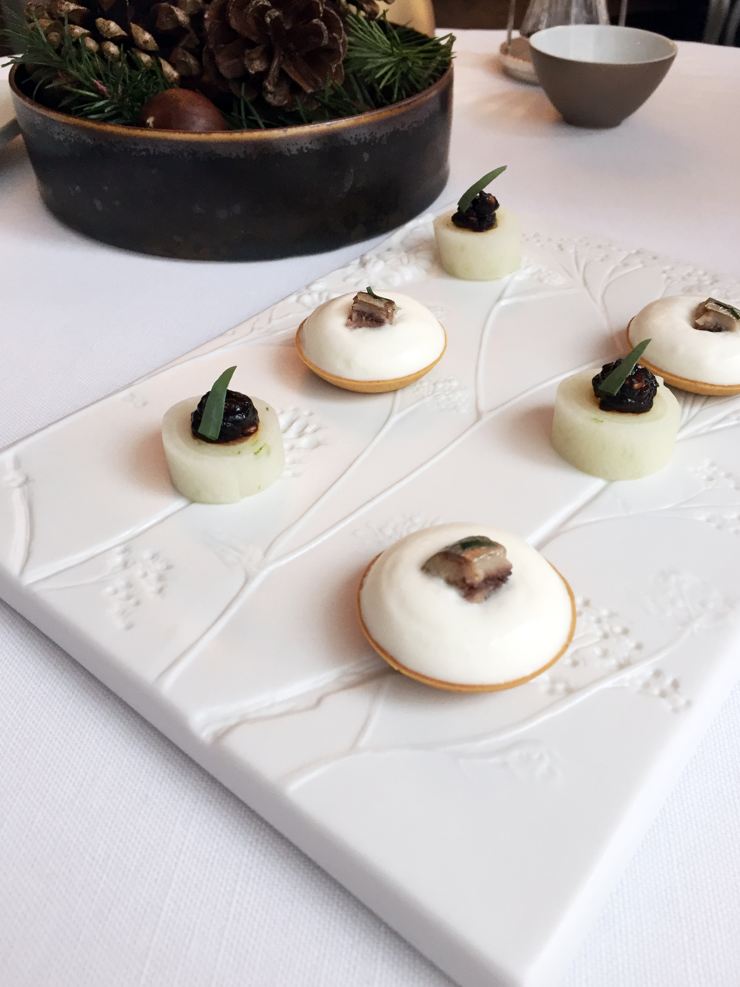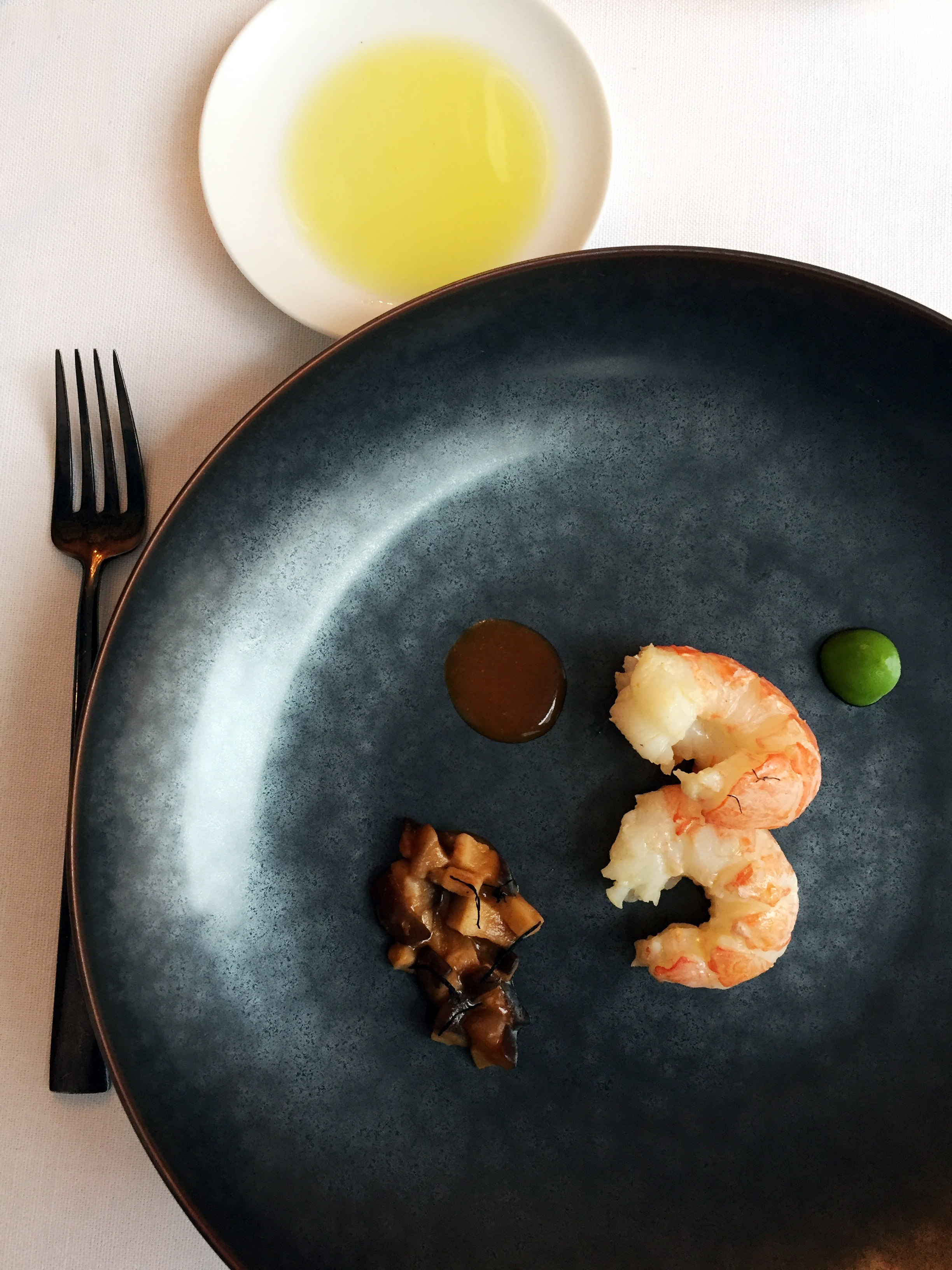 Un écrin zen aux tons gris argent ponctué de touches raffinées comme le lustre et les appliques Saint-Louis et volontairement épuré ; pas de tableaux aux murs, c’est la cuisine qui apporte les touches de couleur nécessaires à cette véritable expérience culinaire, avec au menu pour ce déjeuner de mars :