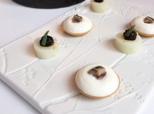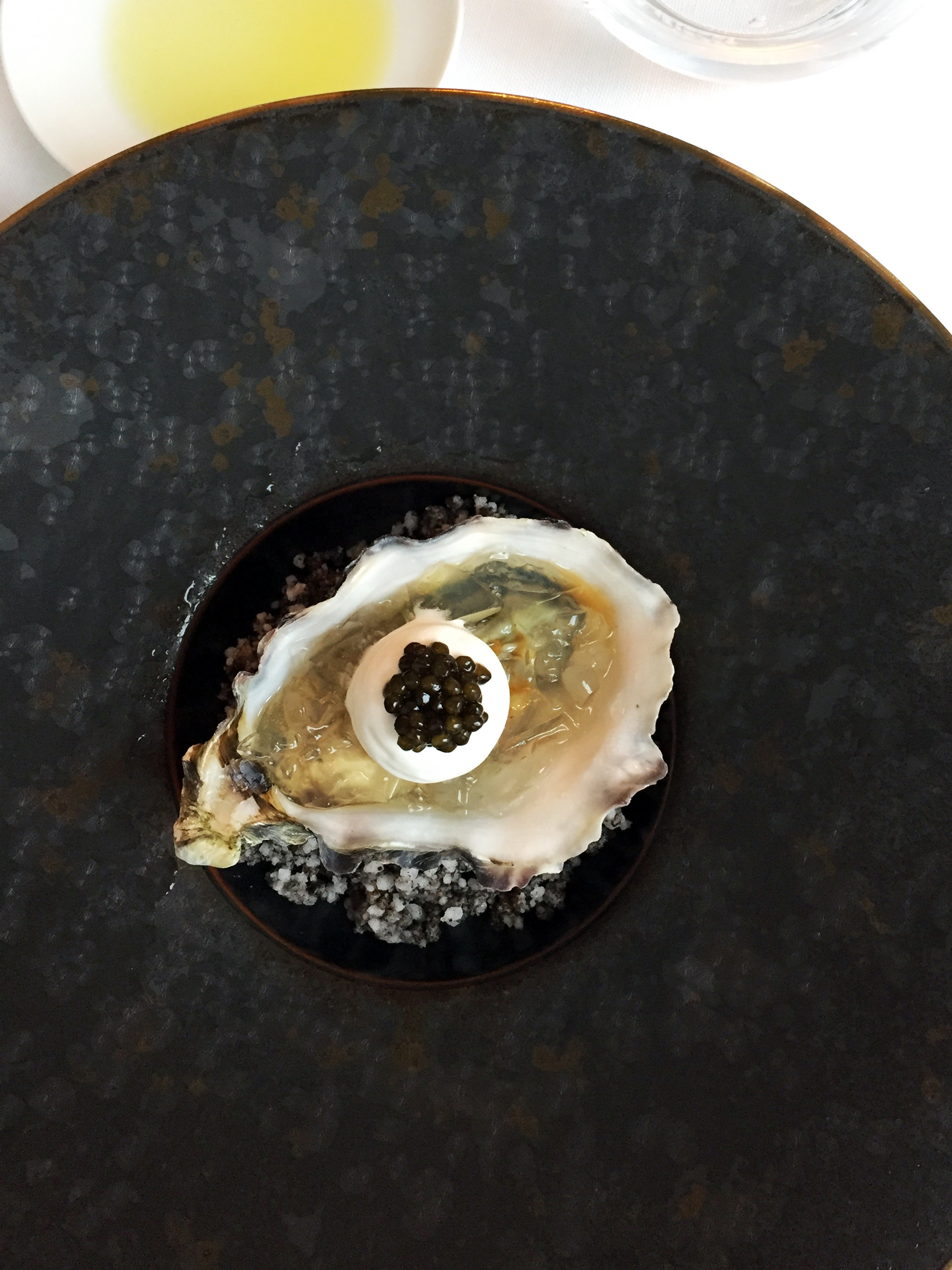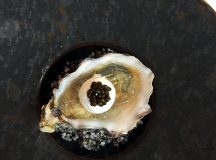 - L’huitre Ostra Régal, vinaigrette aux lentilles vertes du Puy, gelée et émulsion d’anguille fumée et caviar Schrenki