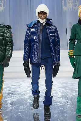 Le nylon technique, souvent avec une surface plus irrégulière et traitée chintz, se pare des couleurs classiques de l’héritage Moncler, en