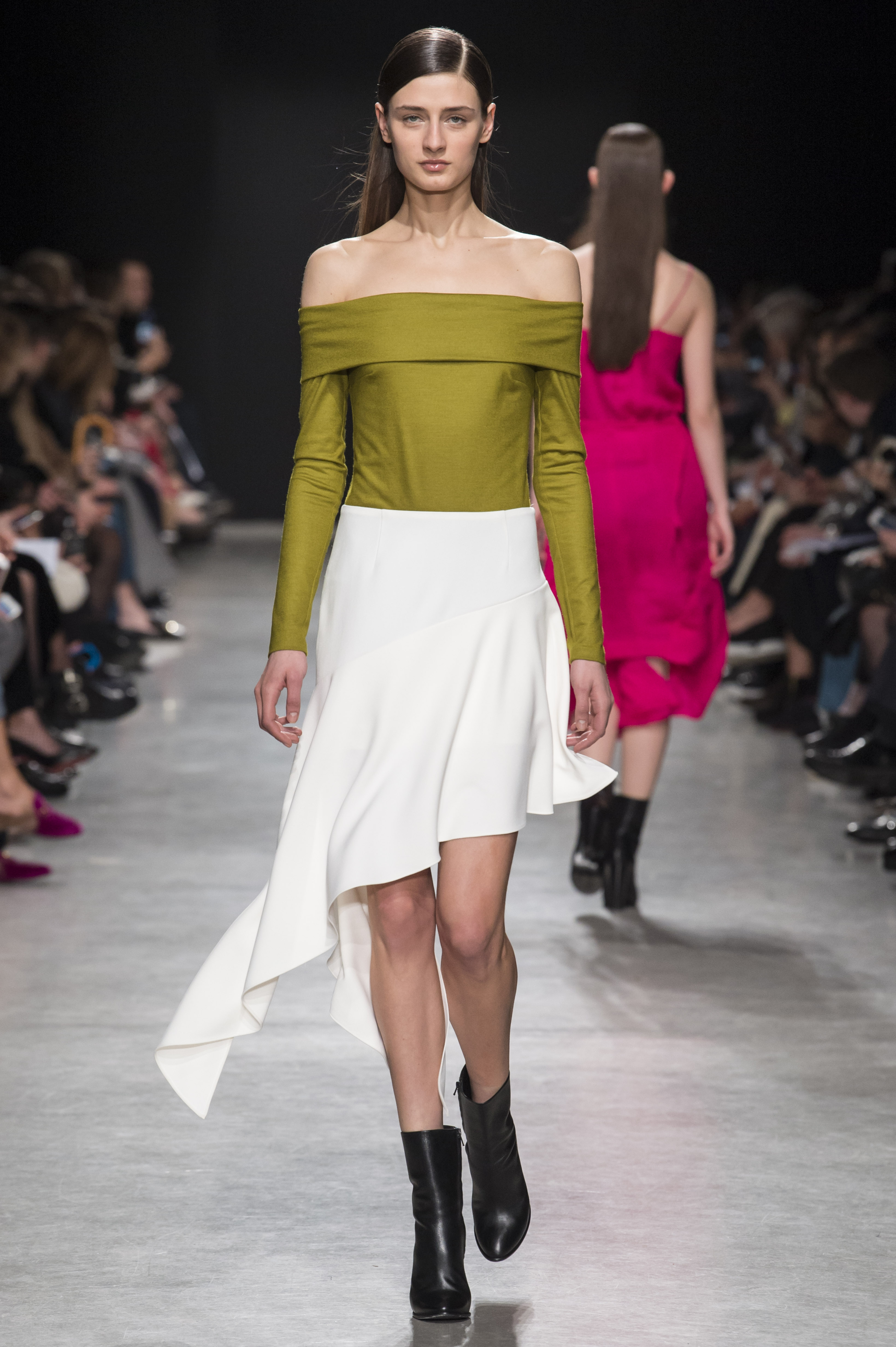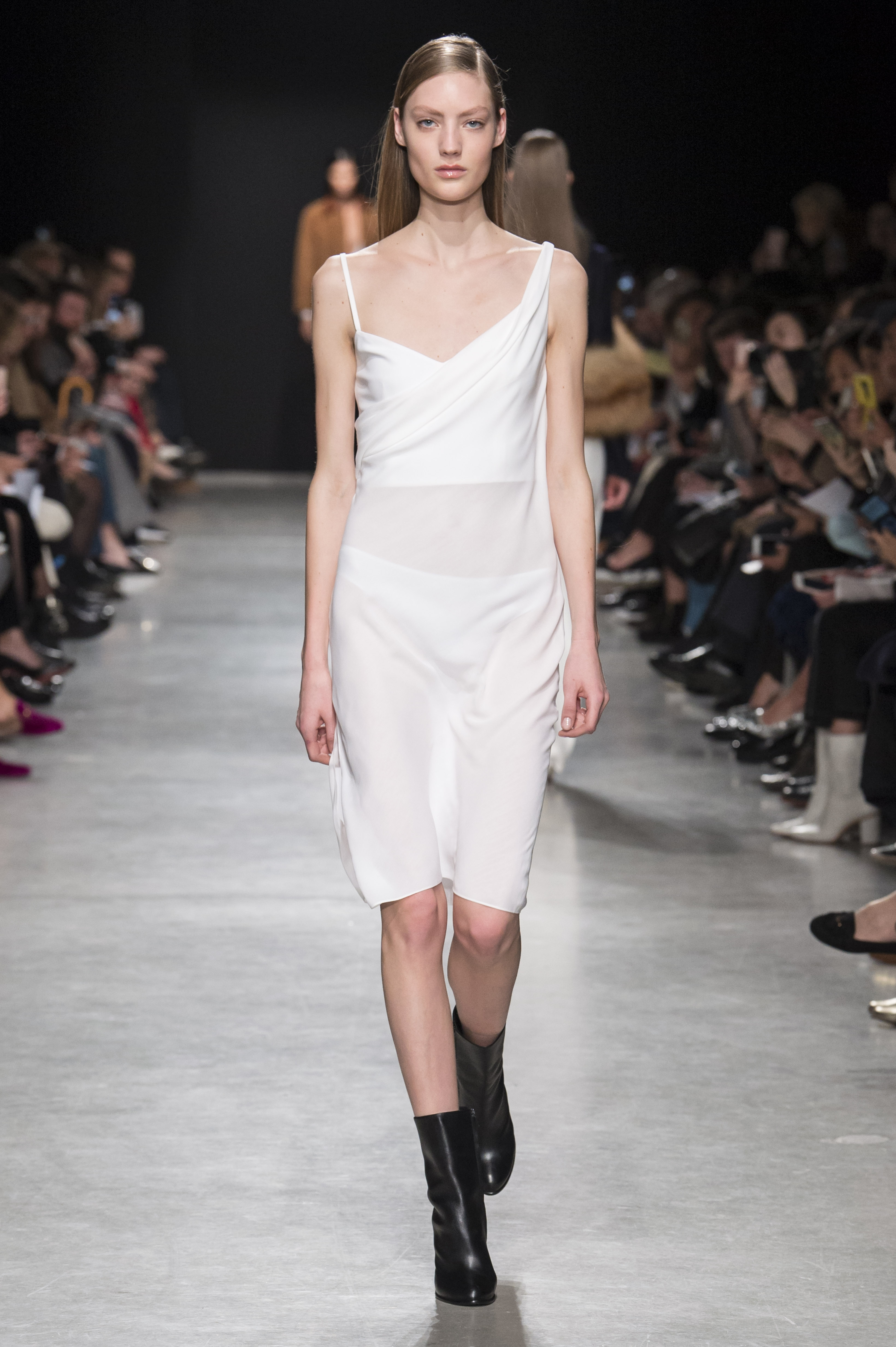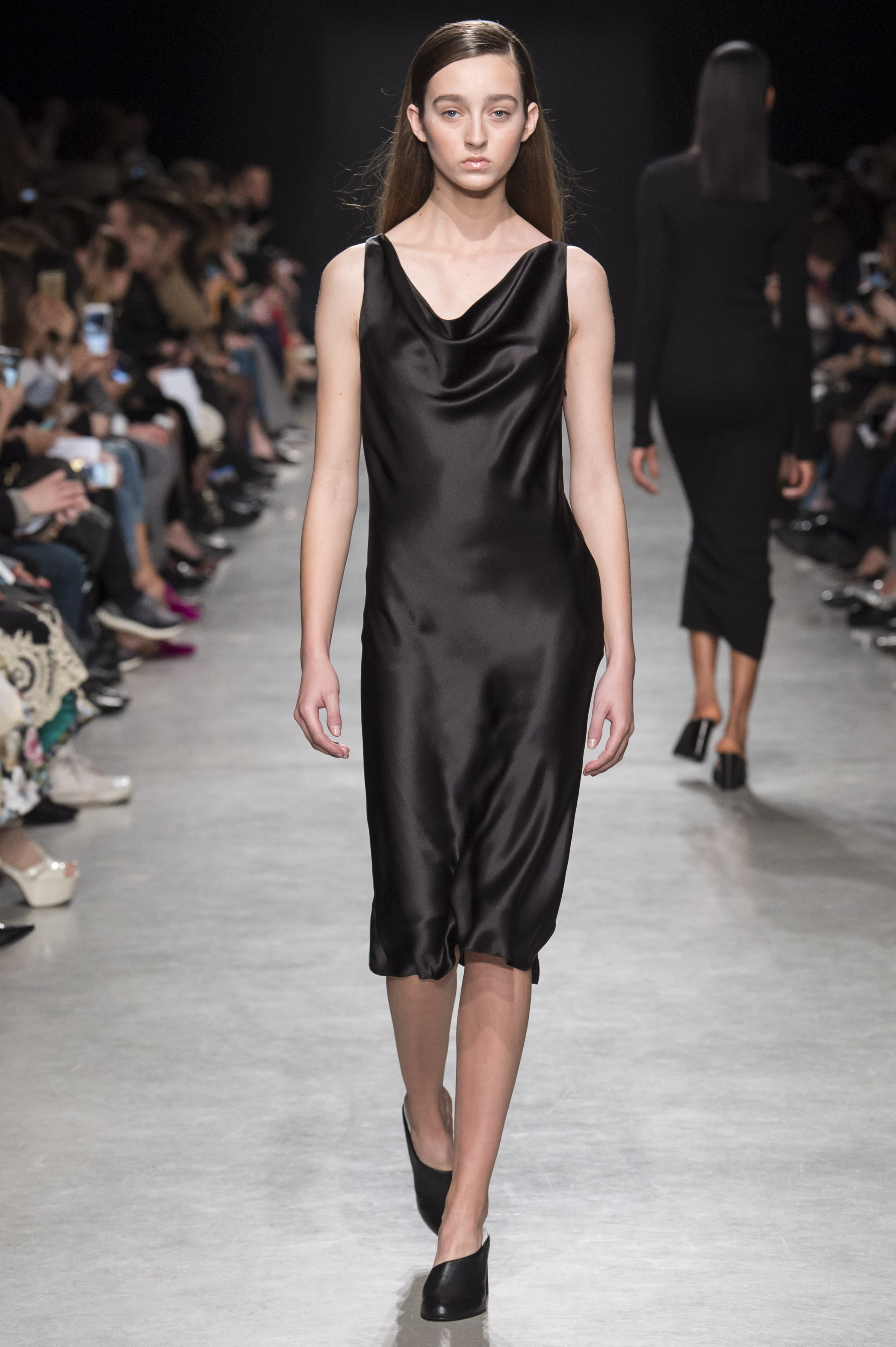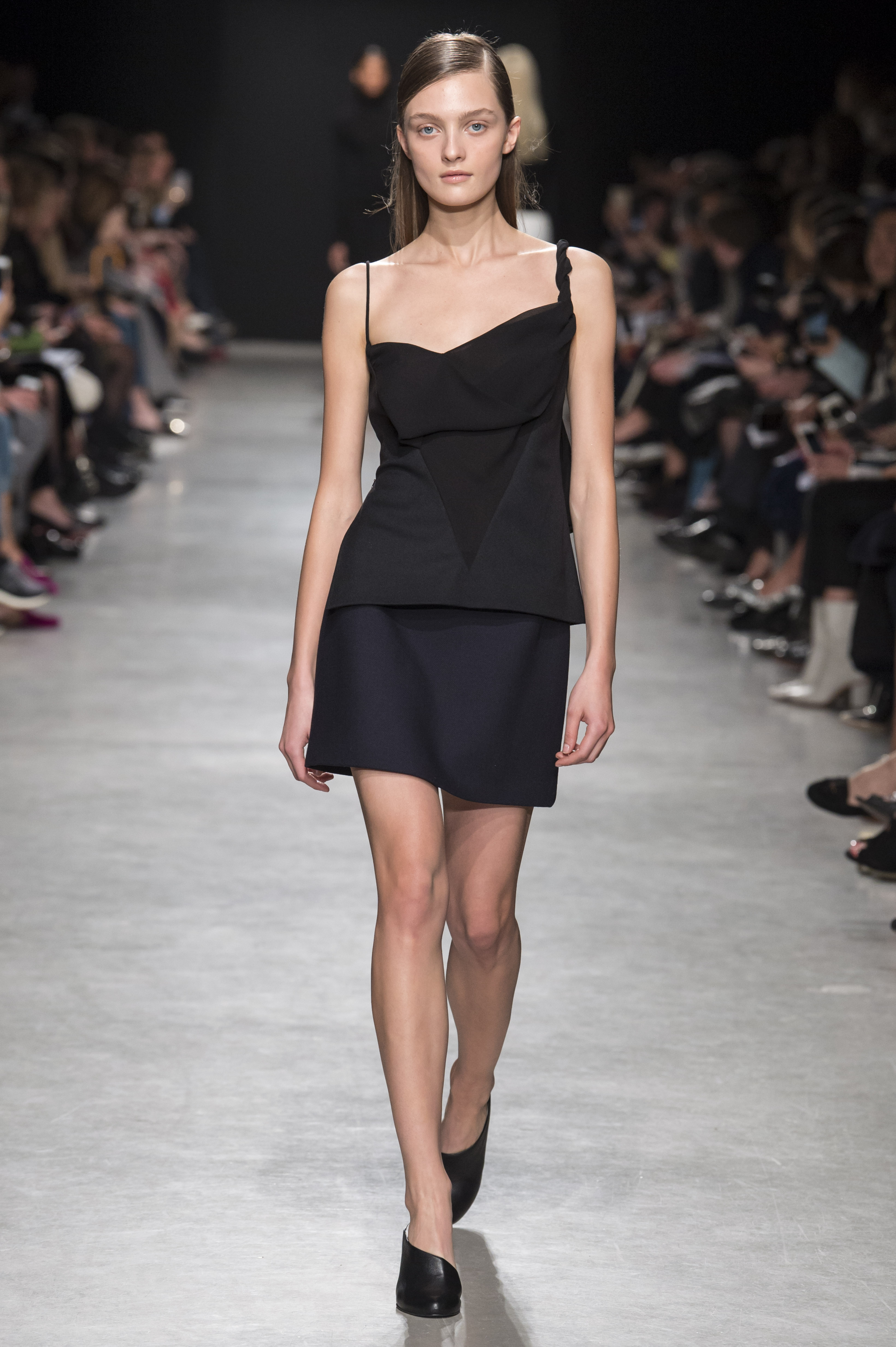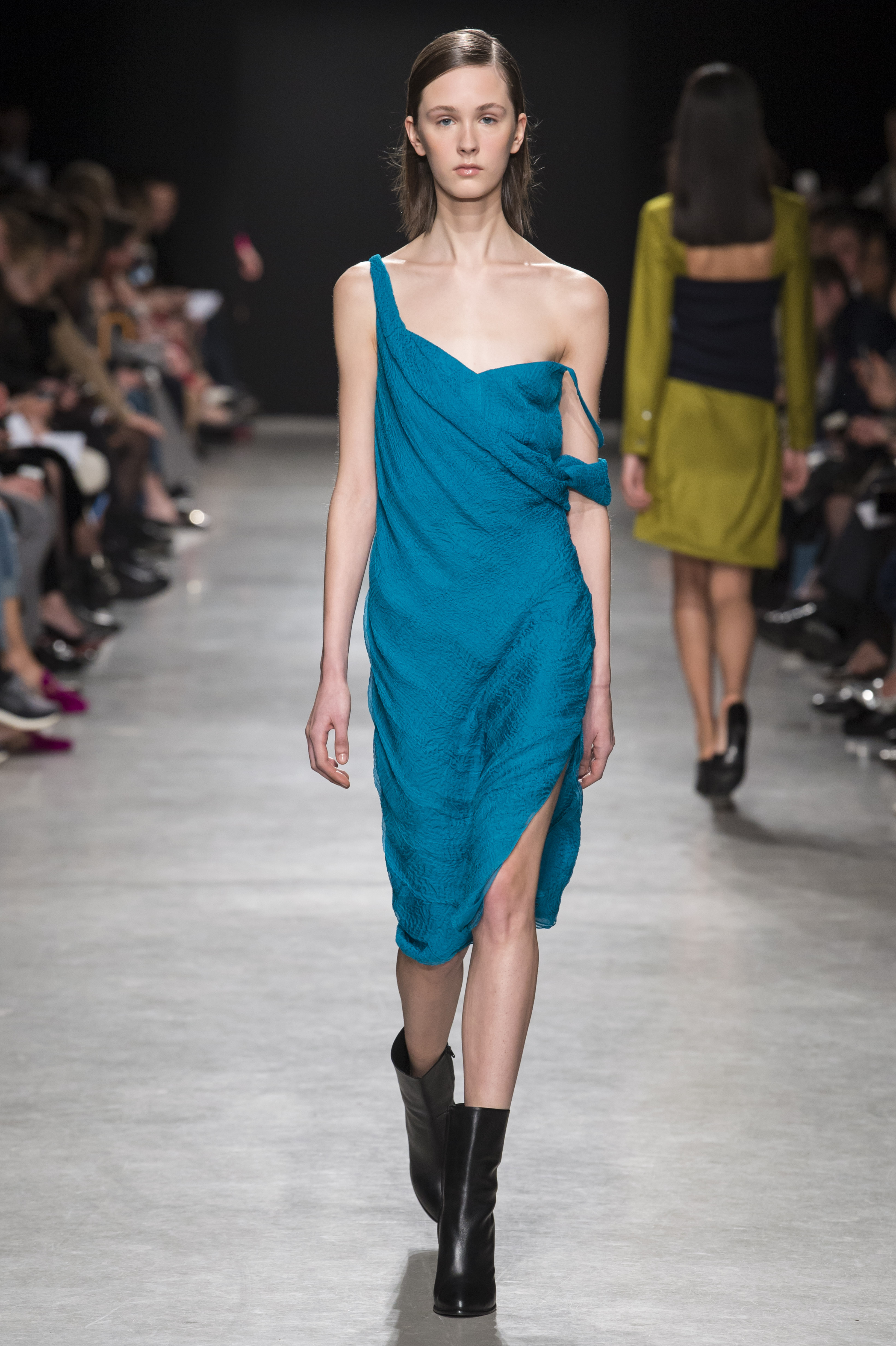 Les robes de cocktail sont à bretelles et asymétriques, ou avec un dos nu ovoïde, faisant de la peau un élément graphique qui illumine la pièce.
