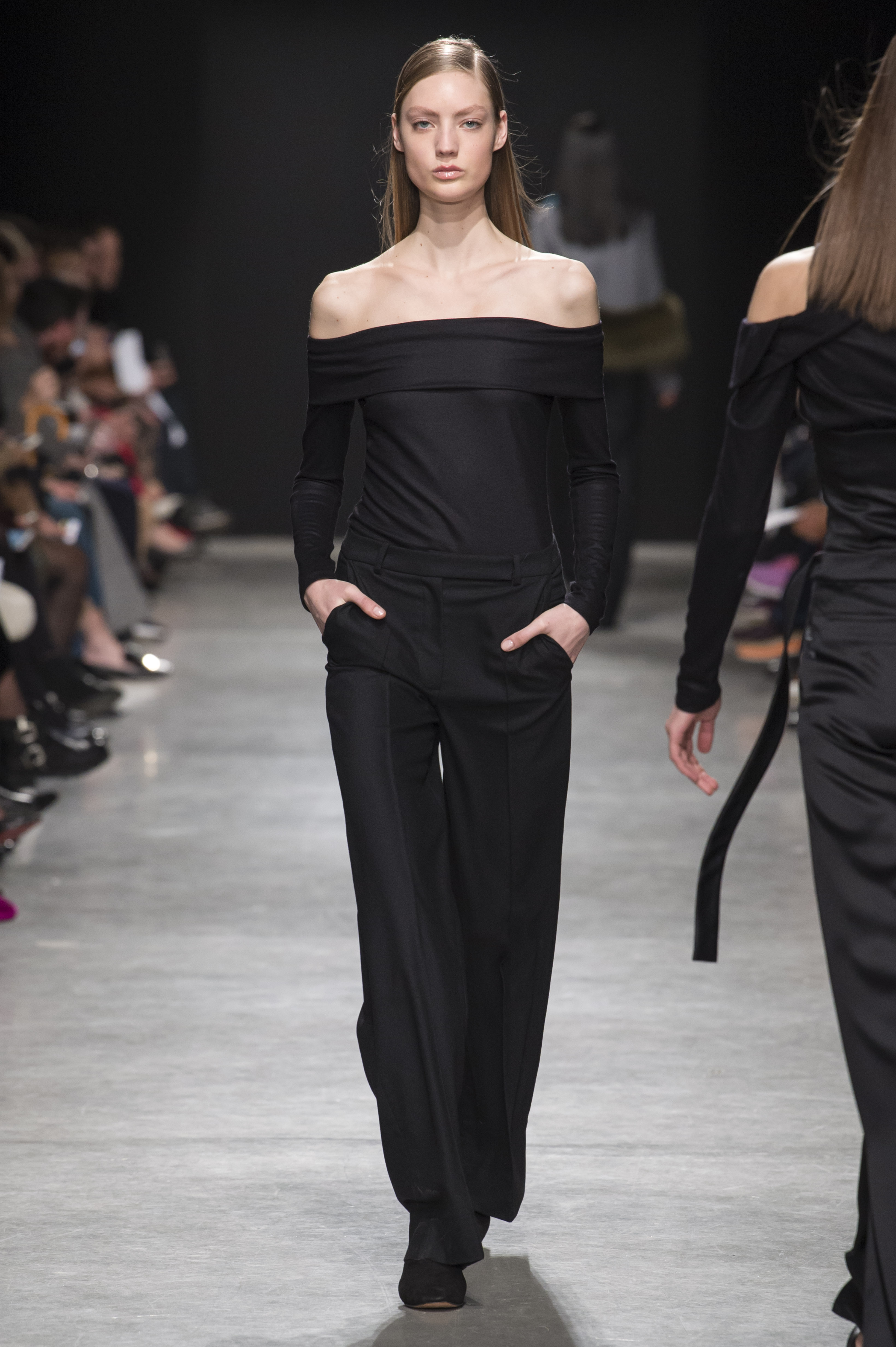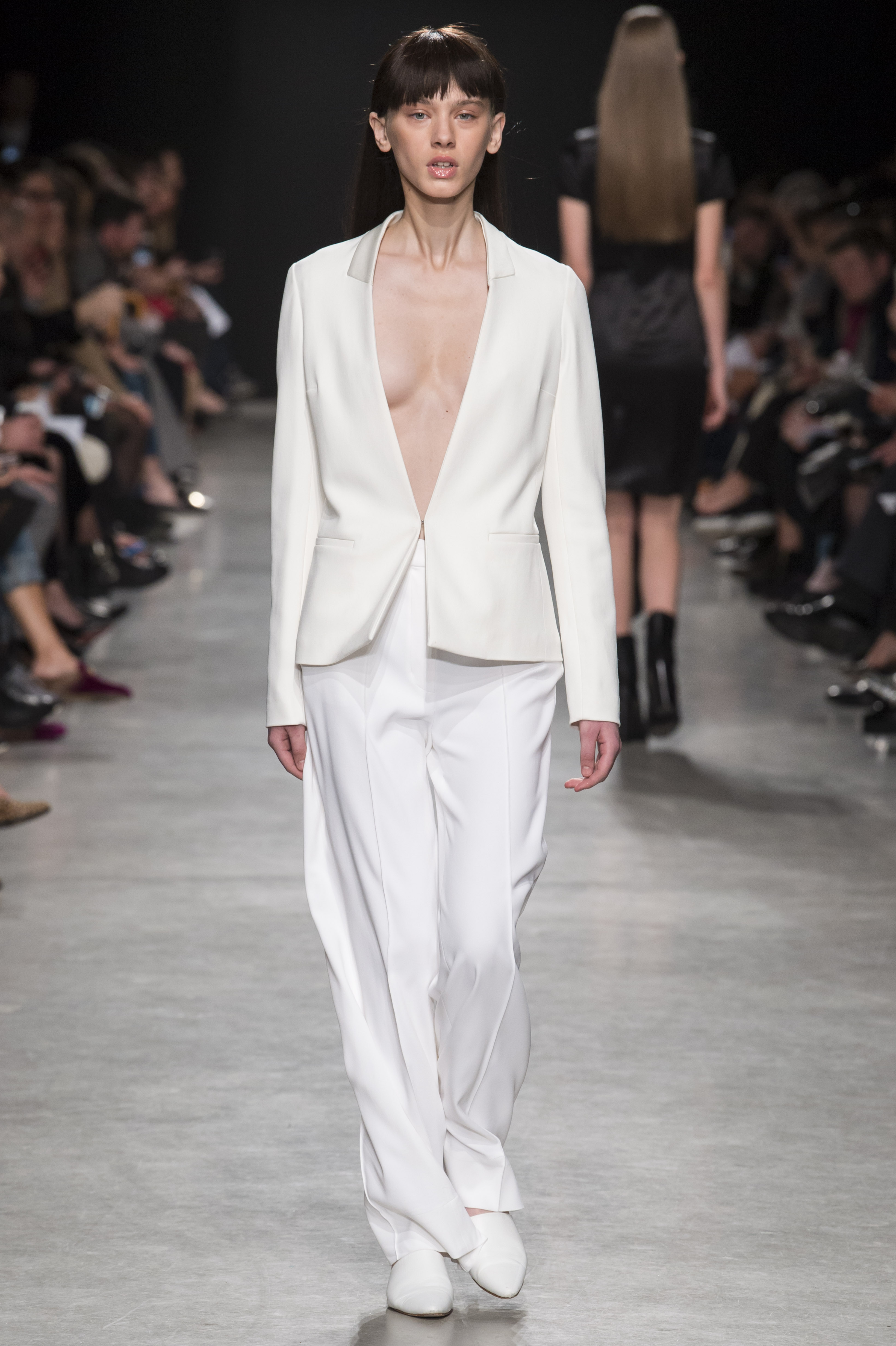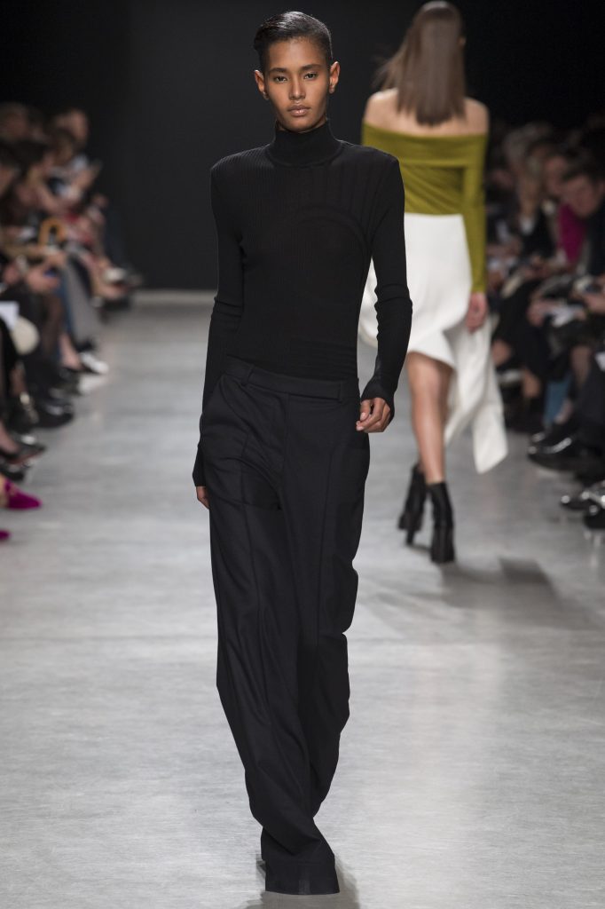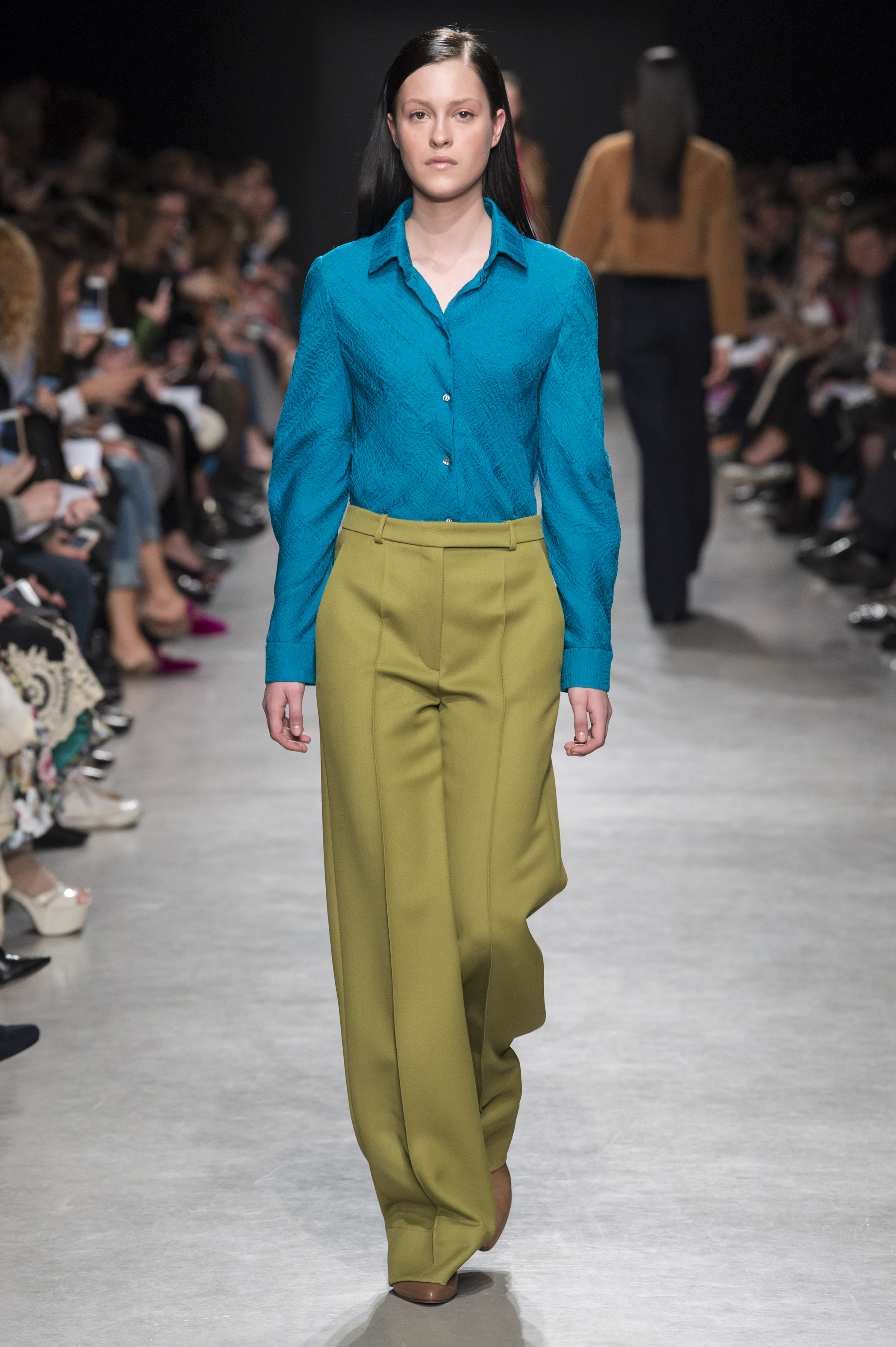 Les pantalons sont amples, plissés et avec des coutures qui se fondent dans les poches de façon quasi imperceptible, pour que le corps de celle qui les porte vienne dessiner le vêtement.