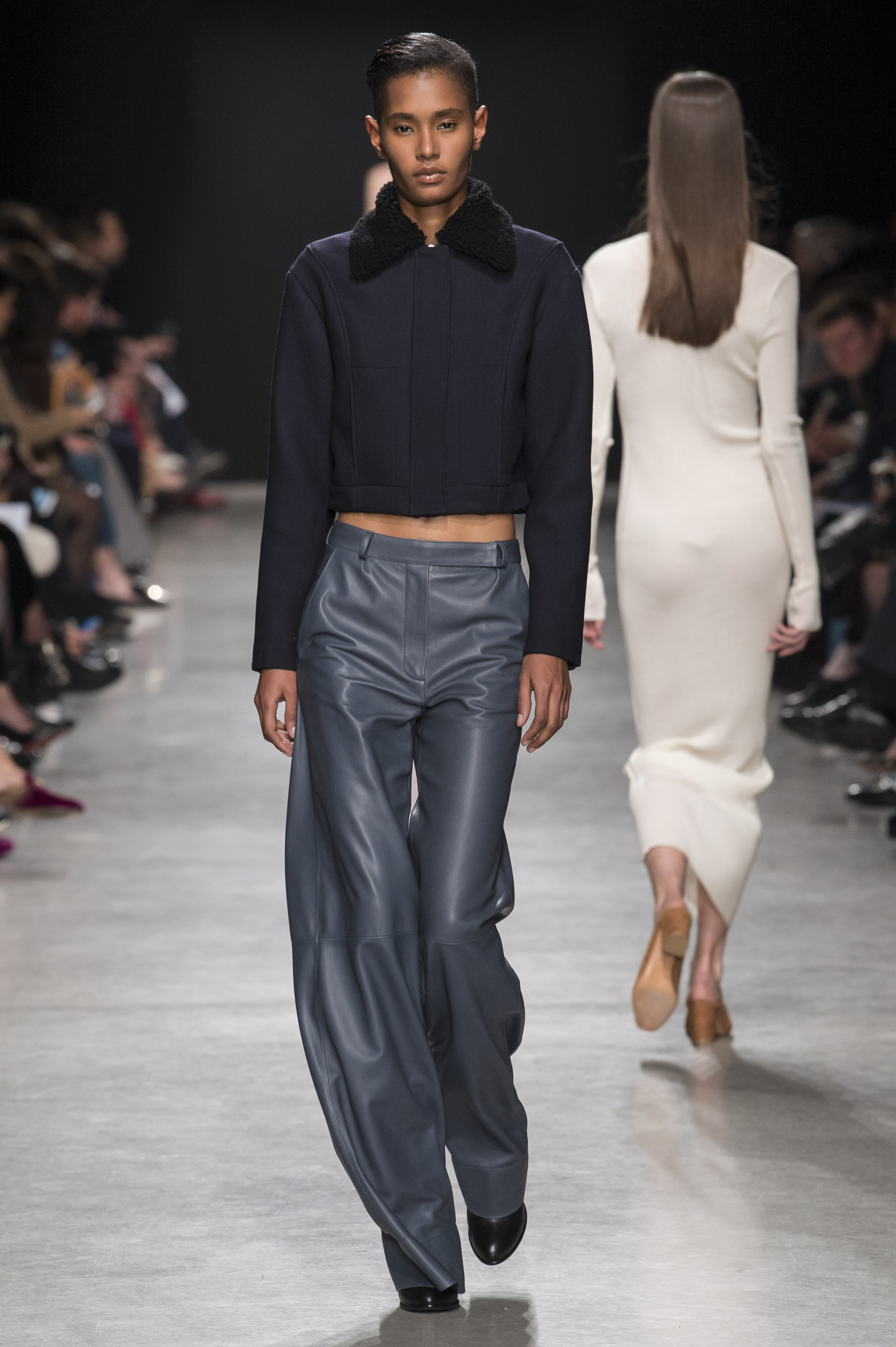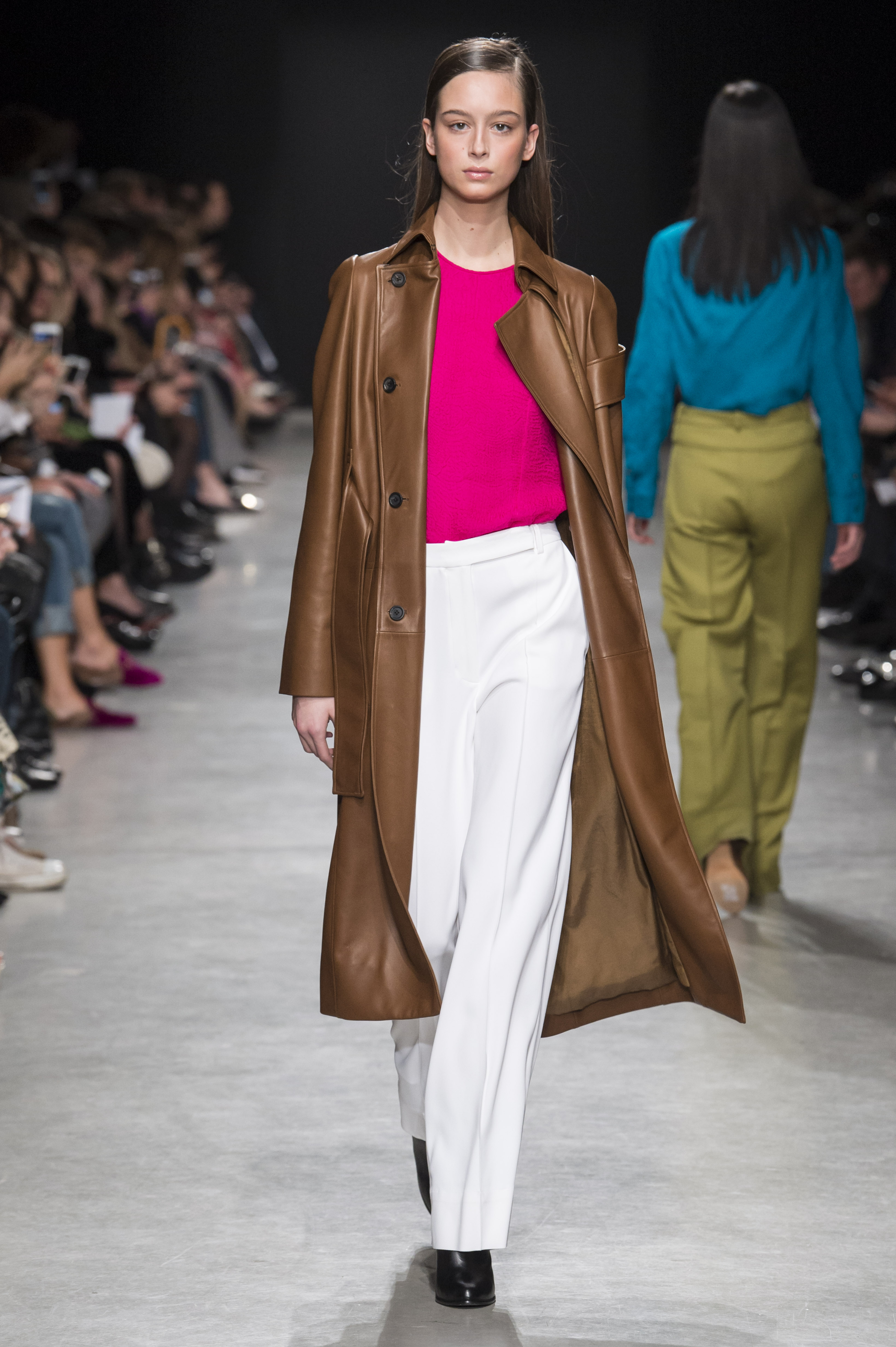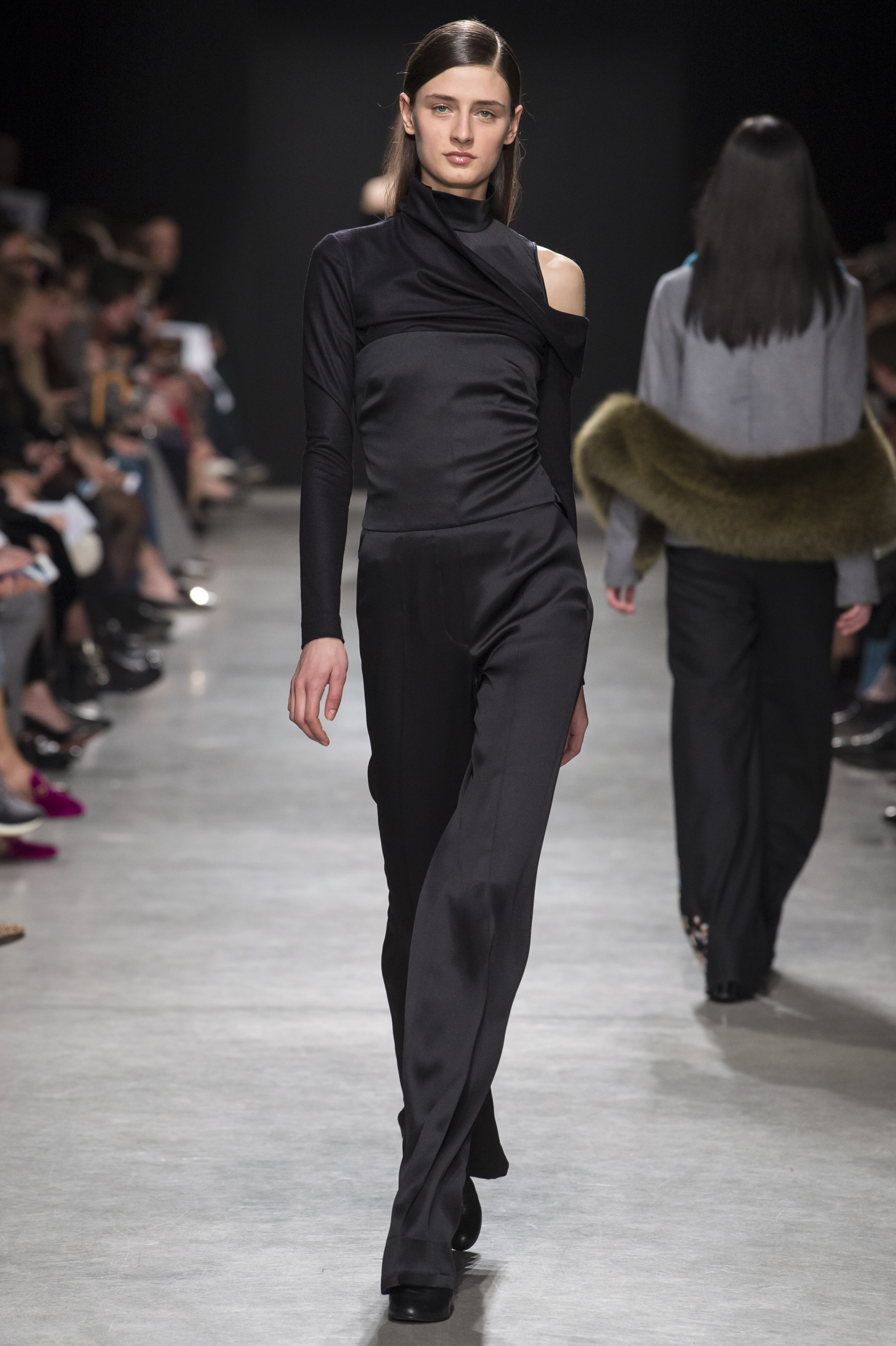 Les pantalons sont amples, plissés et avec des coutures qui se fondent dans les poches de façon quasi imperceptible, pour que le corps de celle qui les porte vienne dessiner le vêtement.