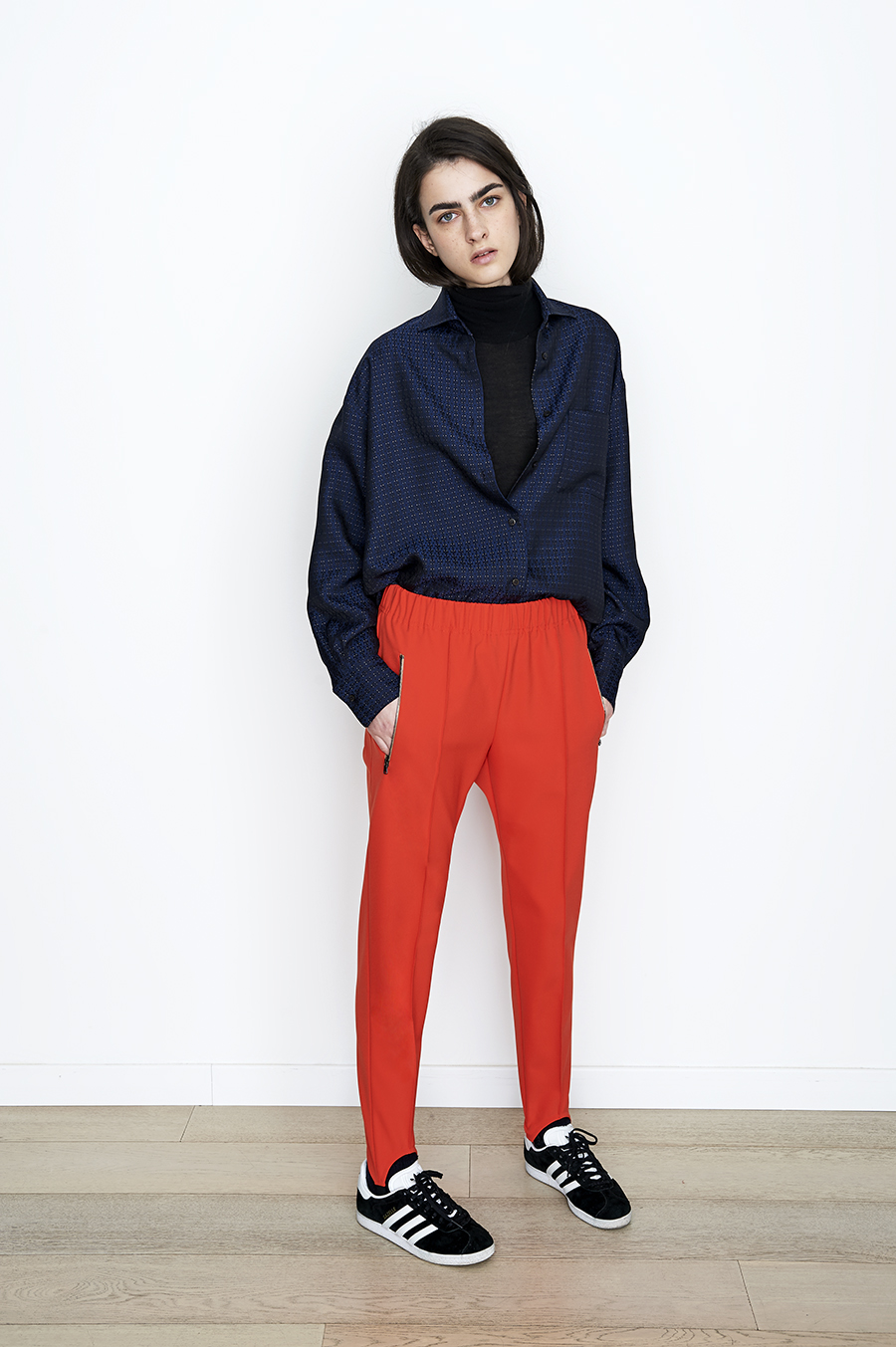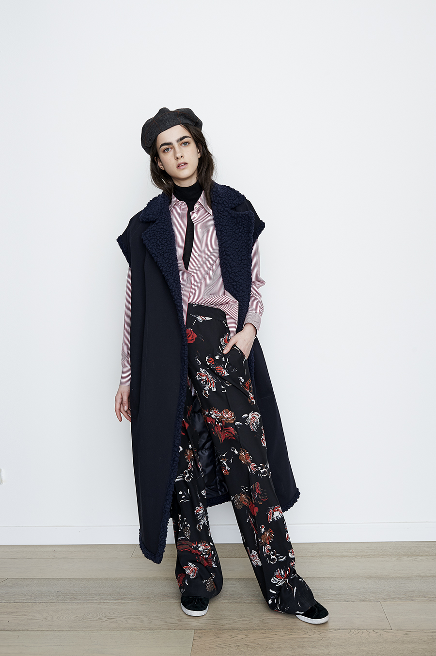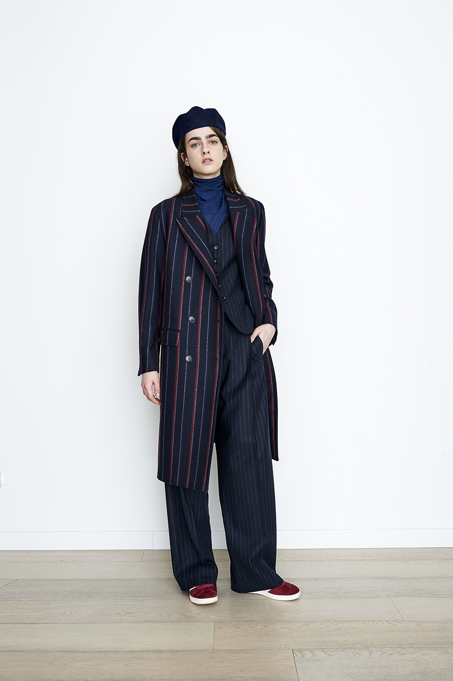 En parcourant les images de National Geographic, Alberto Biani aime s’offrir un tour du monde dès qu’il en a l’occasion. Cette fois, il a choisi un ancien numéro datant des années 1960. Le styliste puise dans ces images pour rêver et trouver l’inspiration. Pour lui, elles représentent la mode authentique, porteuse d’une histoire, d’une tradition, d’une culture. Voilà un reportage sur les tailleurs de Savile Row, les petits marchés de Paris, la vie des moines tibétains, les rues de Saint-Moritz. Chacun de ces sujets donnera naissance à des vêtements mêlant références et élégance, où les citations se superposent aux récits. Le voyage évoquant inévitablement l’idée d’une attitude décontractée, chaque pièce traduit la sensation de liberté et d’insouciance typique de ces situations où l’on a en poche son billet pour partir, quels que soient le moyen de transport et la destination. Cela se traduit par des tissus fluides et des superpositions fantaisistes. Masculin et féminin se rencontrent dans des accents de douceur inattendus. Un ensemble très « robe de chambre ». Voici le nouveau pyjama en soie à motifs cravate ou en cachemire matelassé à rayures. Et voici aussi quelques vestes à col bateau déclinées en plusieurs variantes. Et le paletot tibétain long, avec ou sans manches. Sans oublier bien sûr les doudounes en satin opaque et léger. Le tailleur trois pièces infiniment Biani : veste, gilet et pantalon à porter ensemble ou séparément. Un chapitre à part est comme toujours réservé aux pantalons : les nouveaux modèles se distinguent par une taille haute et une coupe longue et large. Ils peuvent aussi être courts, évasés, avec élastique à la taille ou en tissu fin. Le défi ultime : les pantalons de ski, à porter en tenue de tous les jours. Idem pour les manteaux. Les modèles tibétains, tout comme les modèles plus classiques, optent pour des cols châle oversize en fourrure évoquant les années 1980, mais retenus à l’arrière par de grosses pinces, pour un rendu proche du bustier. En résumé : un pardessus en patchwork qui joue avec l’imprimé léopard, les chevrons, le velours et le cachemire. Autre alternative : le blouson américain années 1970 ou les cabans en imitation astrakan. Les nouvelles vestes arborent des bordures arrondies et les chemises oversize sont souvent taillées dans un tissu assorti à celui du pantalon. Le tricot est incontournable, chaud et doux comme l’ensemble de la collection. Les couleurs sont adaptées : tons terre et brûlés, bleu et noir, mais surtout un rouge tibétain authentique.