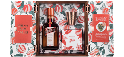 Le coffret en bois est tapissé d’oranges gorgées d’arômes représentant les huiles essentielles d’écorces d’oranges utilisées pour la liqueur Cointreau. L’agrume est dupliqué à l’infini à l’instar des traditionnels motifs floraux qui ont fait la renommée de Liberty. Outre l’iconique bouteille de Cointreau et son doseur, le coffret contient une bougie parfumée à la fleur d’oranger ainsi qu’un carnet pour y noter toutes les idées et recettes de cocktails.