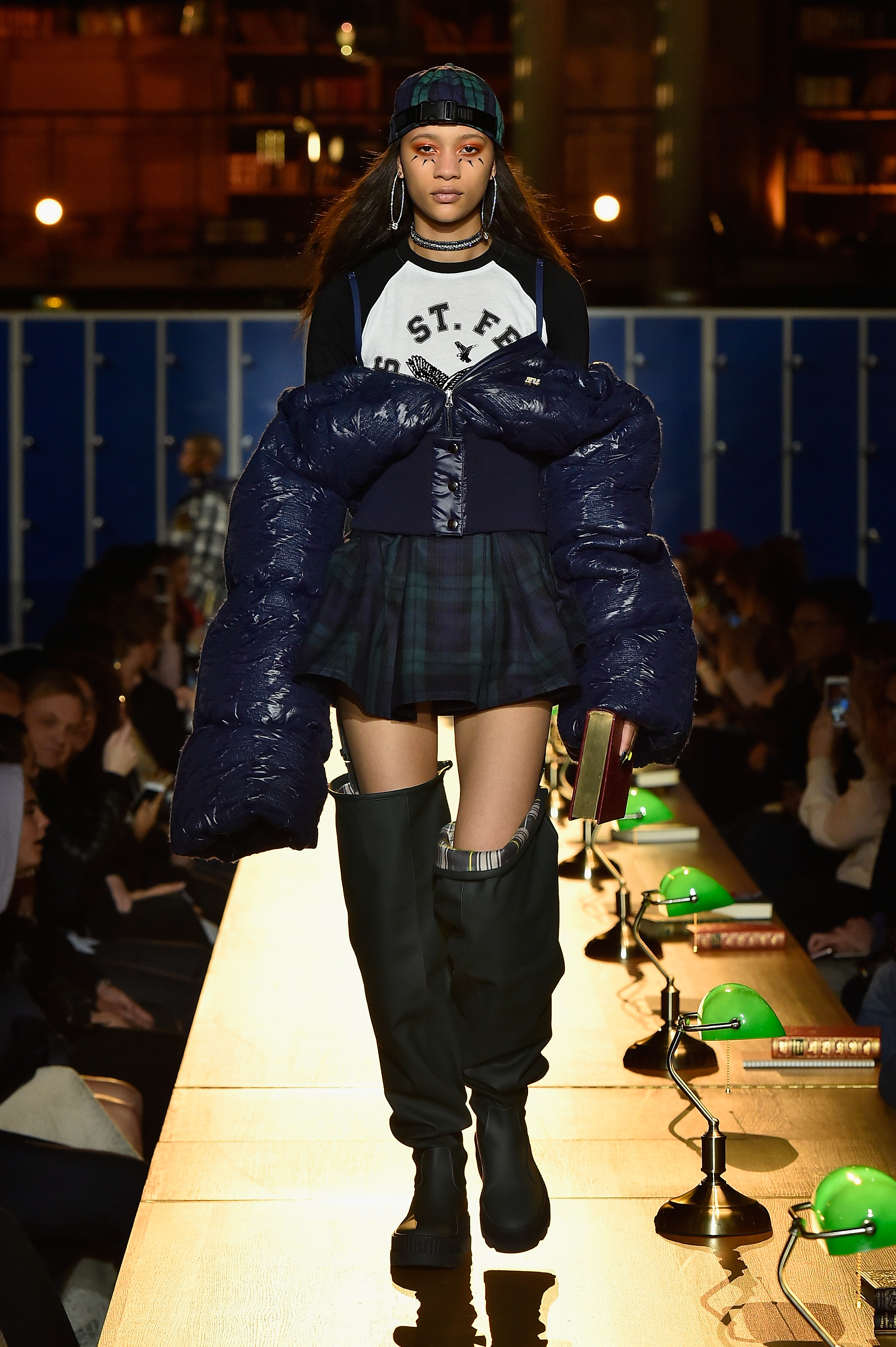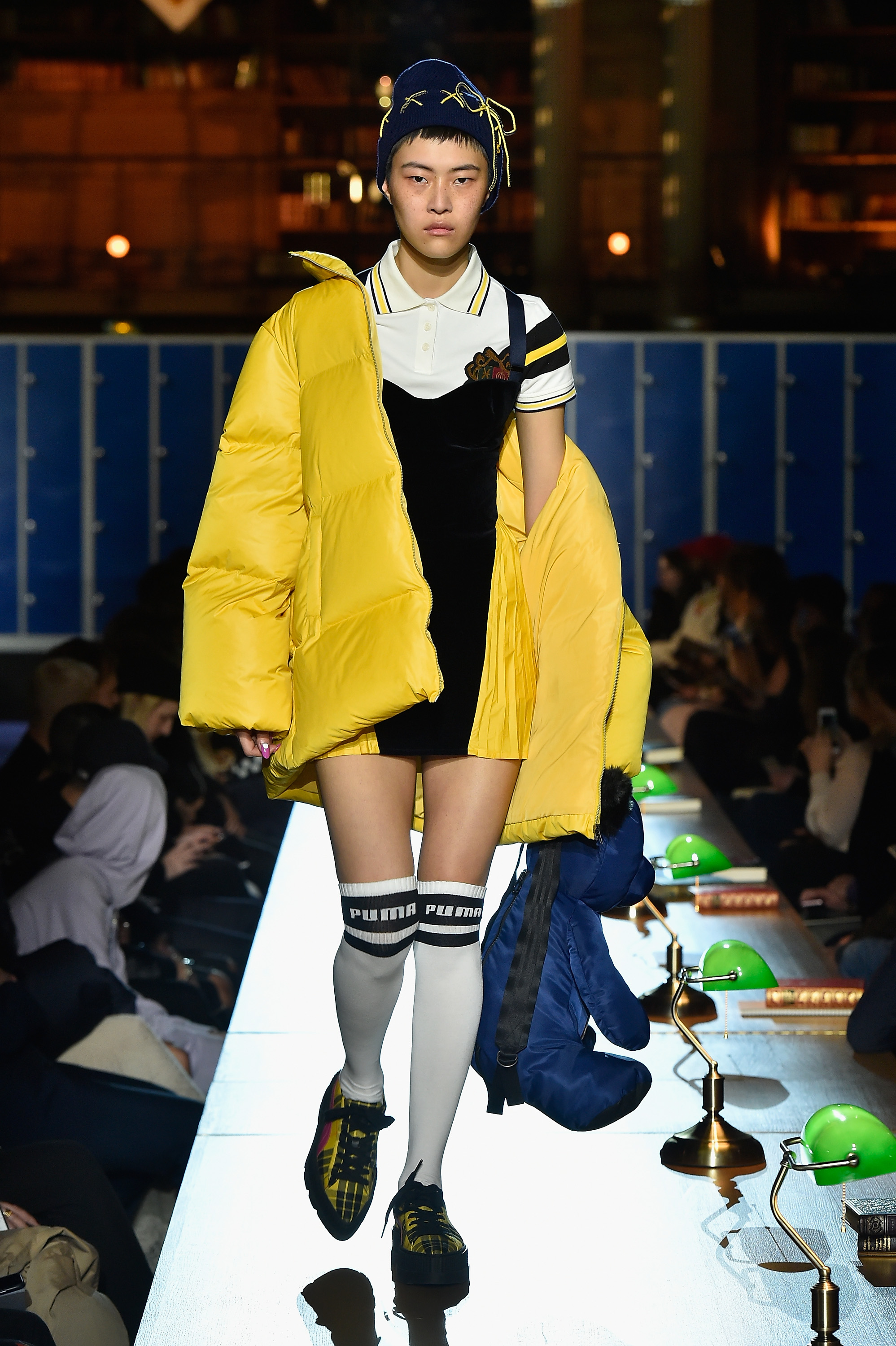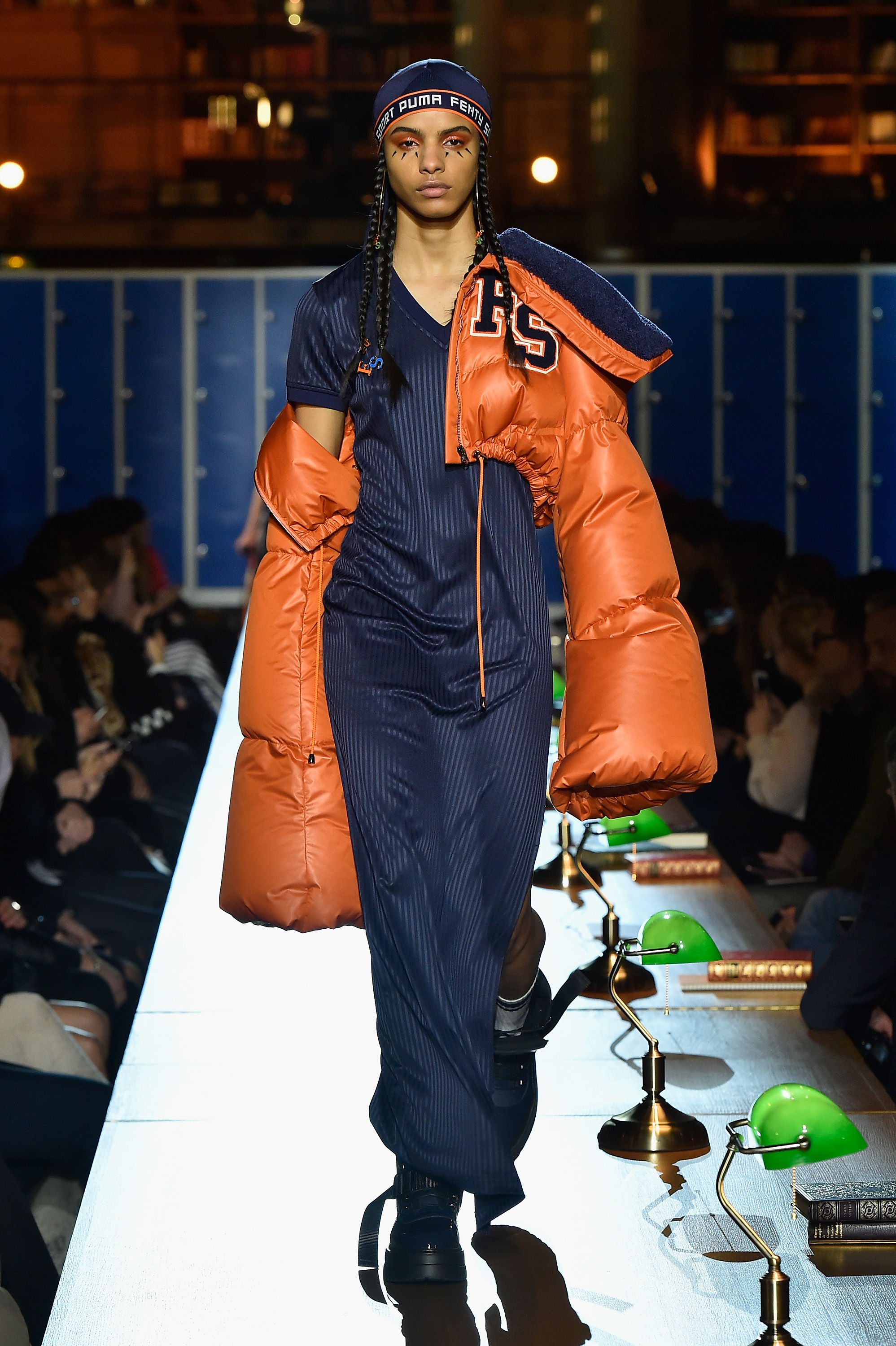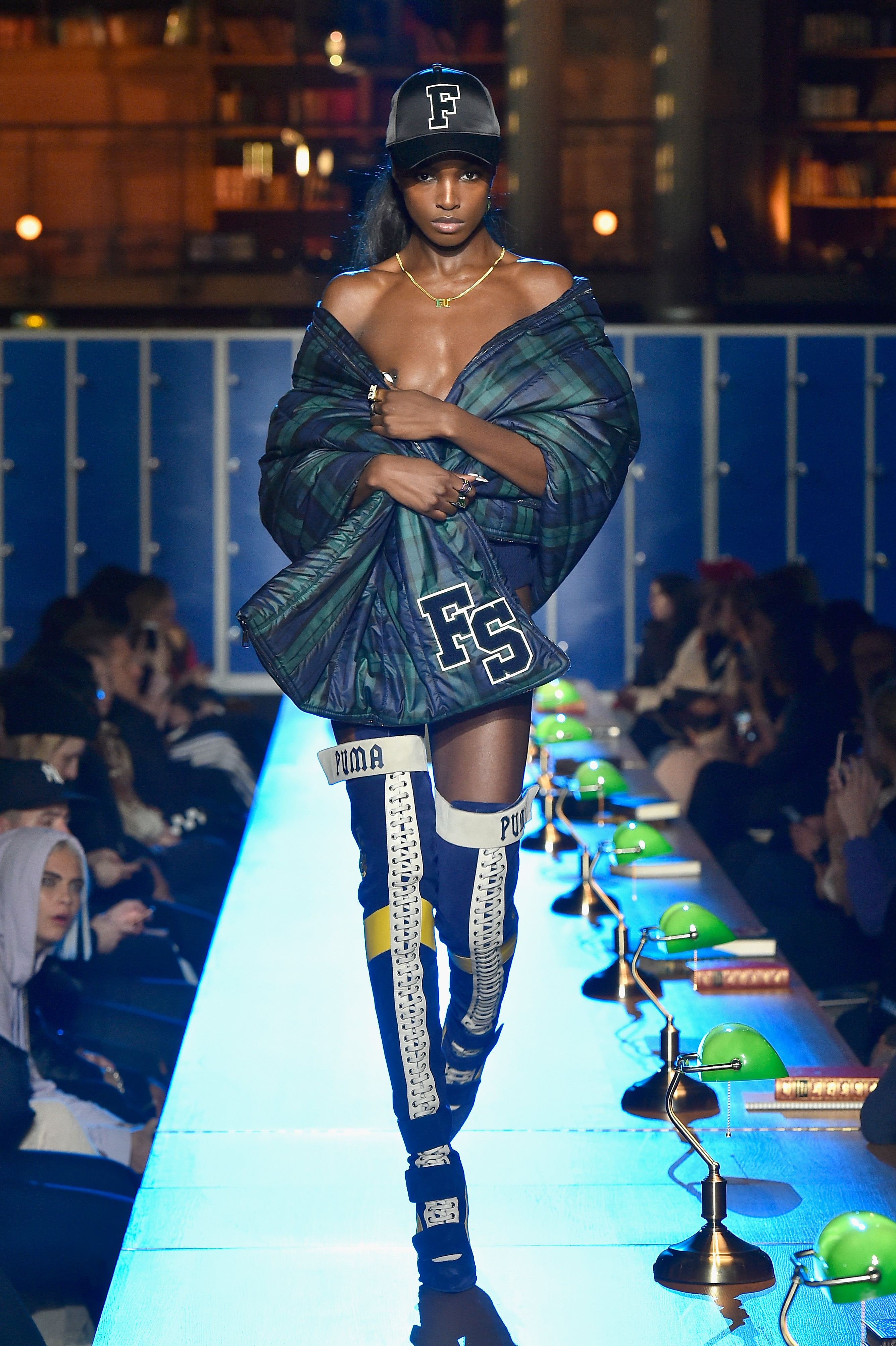 Le public a été replongé dans ses années lycée et universitaires. Pulls à larges mailles tricotés main et aux motifs écossais, pulls chenille PUMA, ribambelle de robes et de pulls ornés du F de l’université FENTY. Cette saison, place aux vêtements d’extérieur de toutes tailles et de toutes formes avec une vaste sélection de manteaux FENTYxPUMA en faux agneau, fausse fourrure, ultra-suede et nylon technique. Une fois de plus, Rihanna a révisé les lignes traditionnellement rigides du sport en insufflant une nouvelle vie aux uniformes, survêtements, hauts et bas, avec des tissus de sport techniques et un esprit dans l’air du temps. Les jupes d’écolières sexy et les corsets façon pom-pom girl ont attiré tous les regards dans le public. Se prendre une heure de colle n’a jamais été aussi tentant.