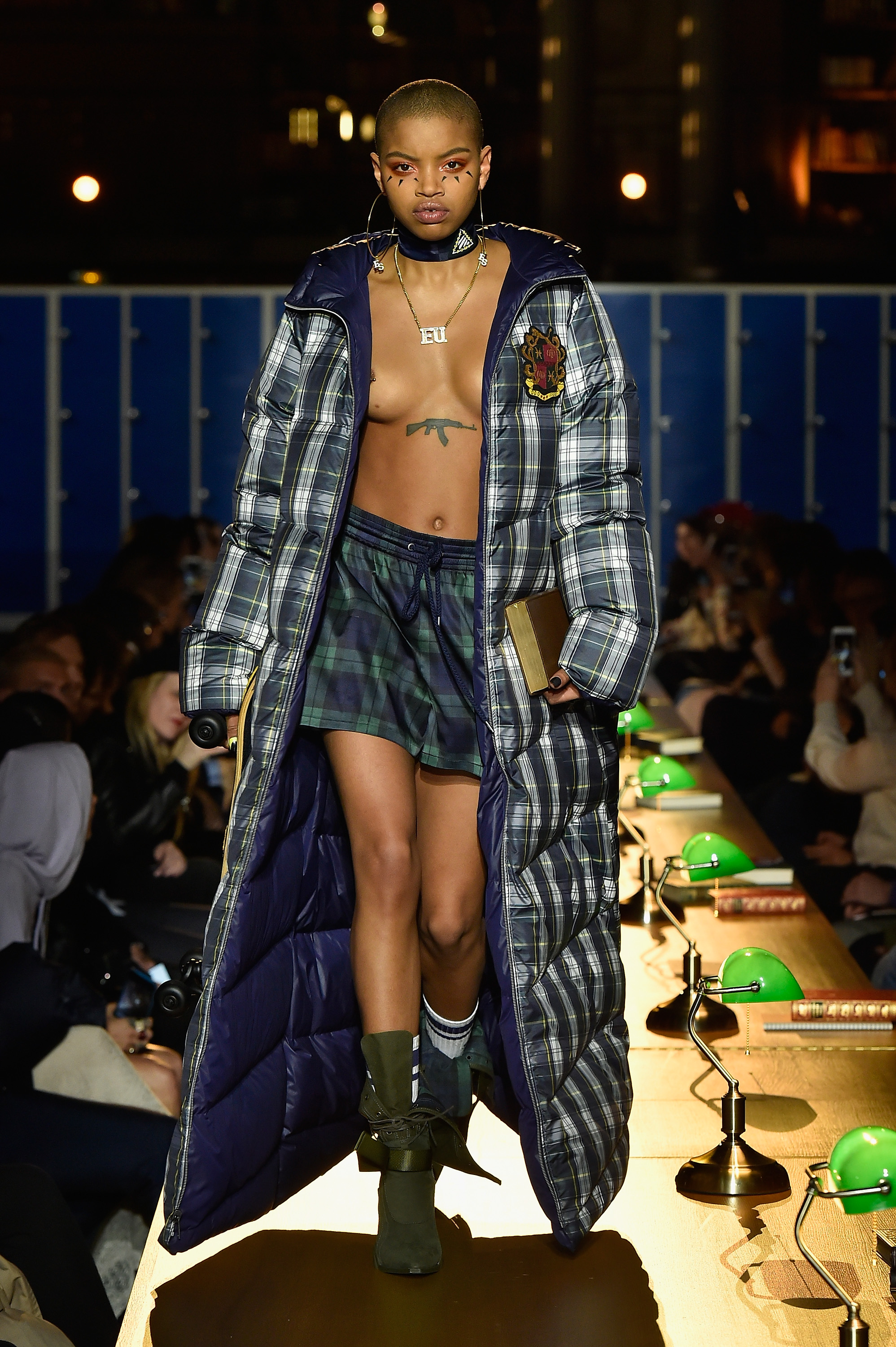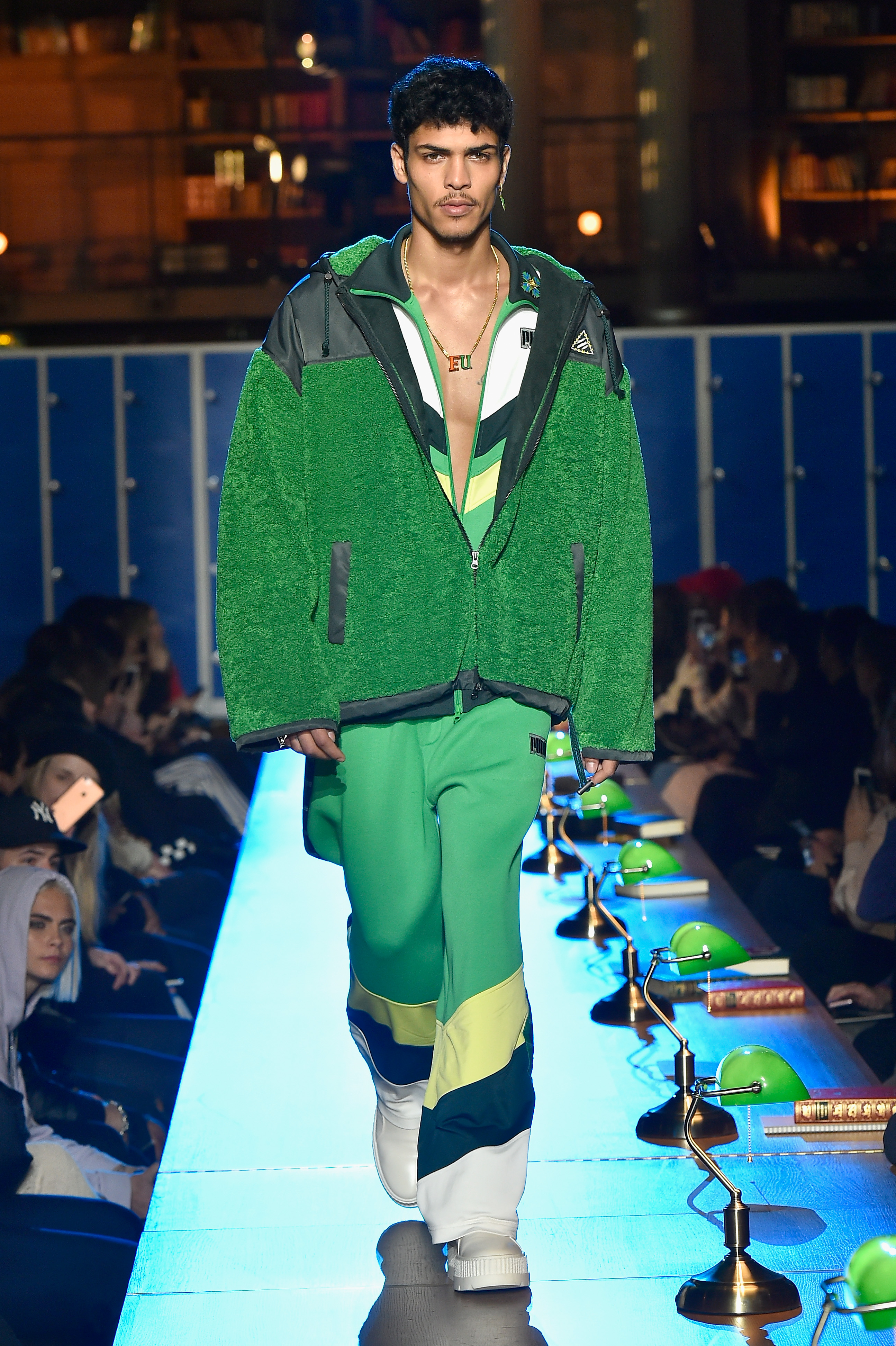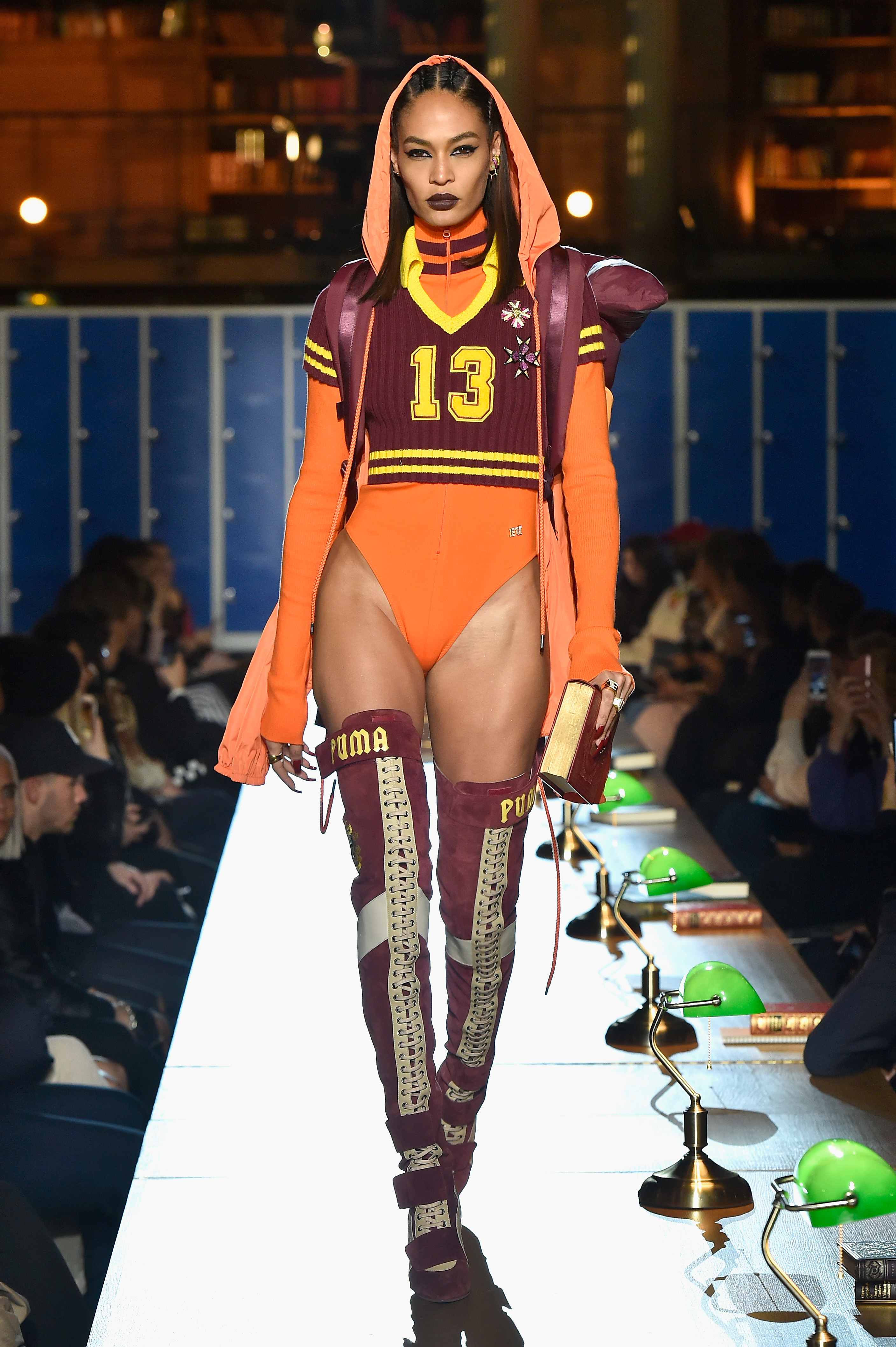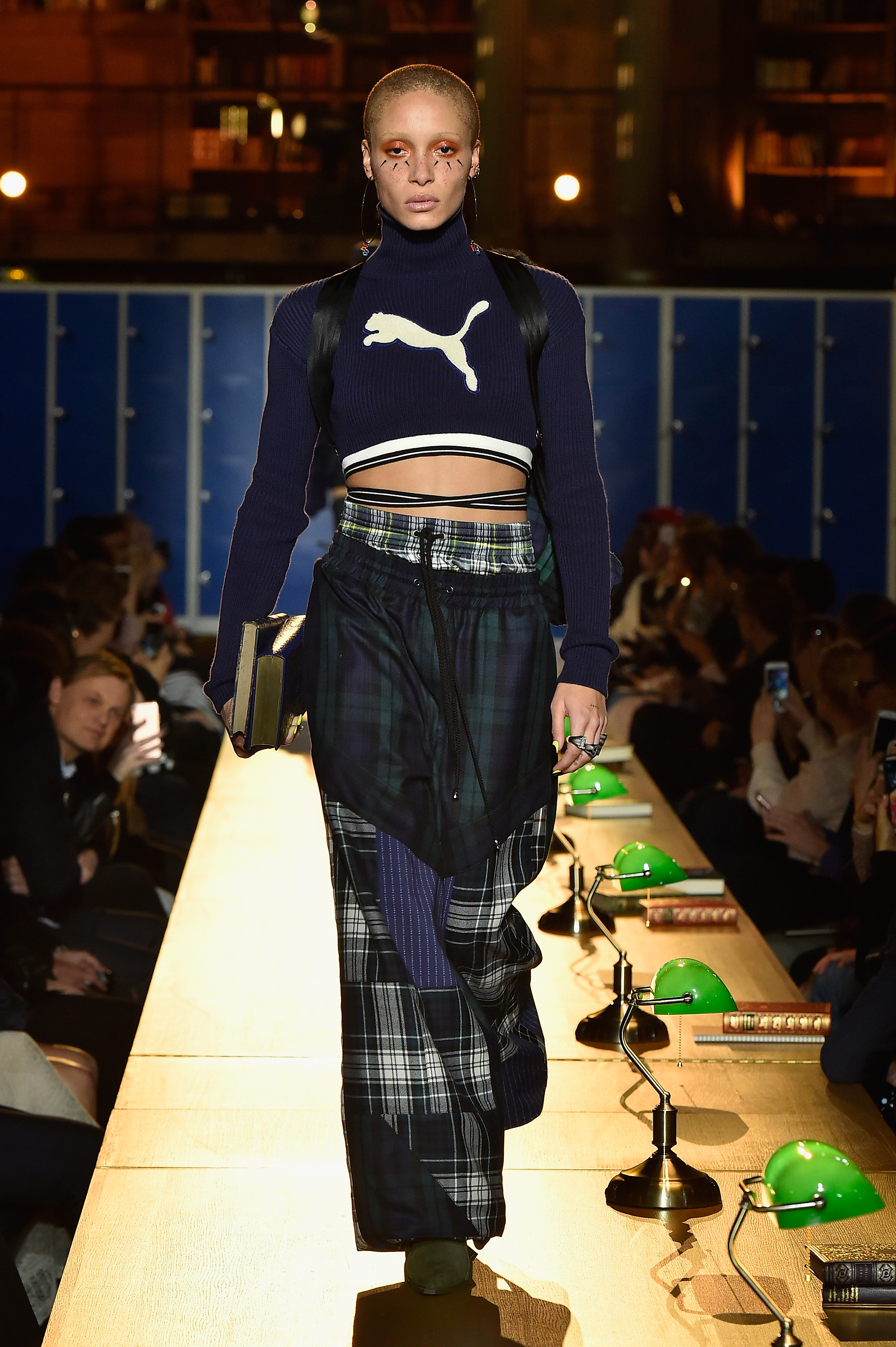Le public a été replongé dans ses années lycée et universitaires. Pulls à larges mailles tricotés main et aux motifs écossais, pulls chenille PUMA, ribambelle de robes et de pulls ornés du F de l’université FENTY. Cette saison, place aux vêtements d’extérieur de toutes tailles et de toutes formes avec une vaste sélection de manteaux FENTYxPUMA en faux agneau, fausse fourrure, ultra-suede et nylon technique. Une fois de plus, Rihanna a révisé les lignes traditionnellement rigides du sport en insufflant une nouvelle vie aux uniformes, survêtements, hauts et bas, avec des tissus de sport techniques et un esprit dans l’air du temps. Les jupes d’écolières sexy et les corsets façon pom-pom girl ont attiré tous les regards dans le public. Se prendre une heure de colle n’a jamais été aussi tentant.