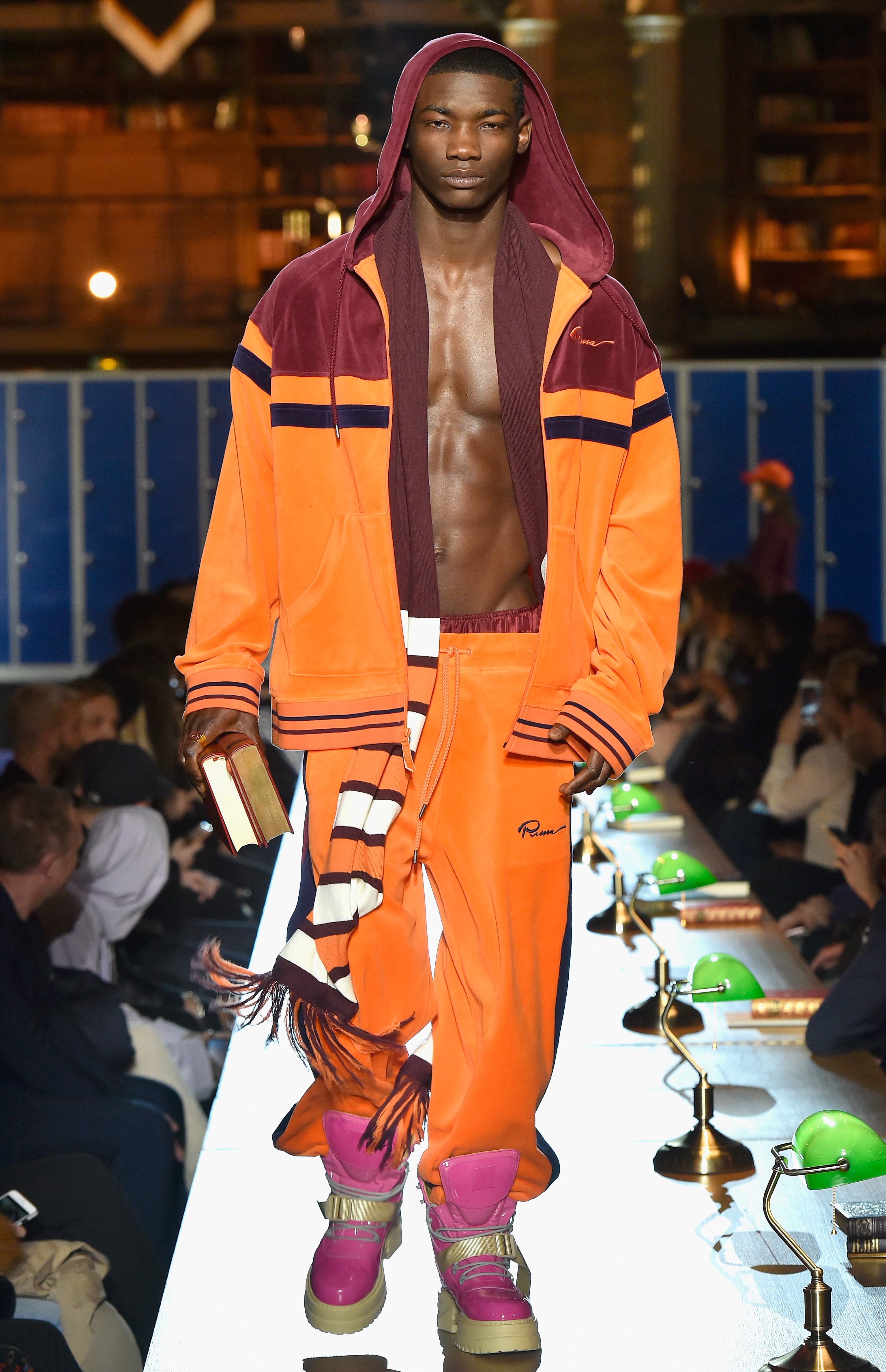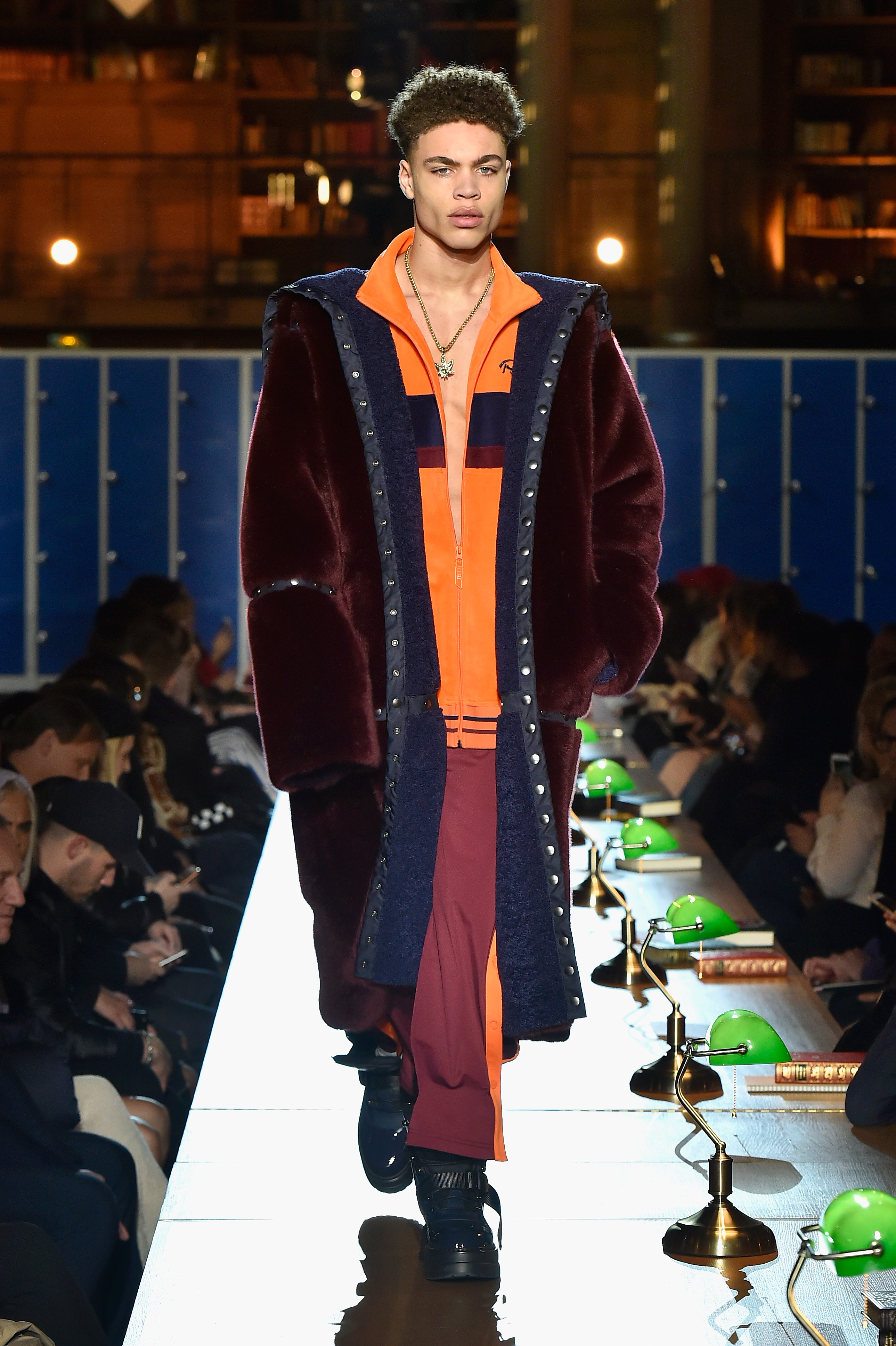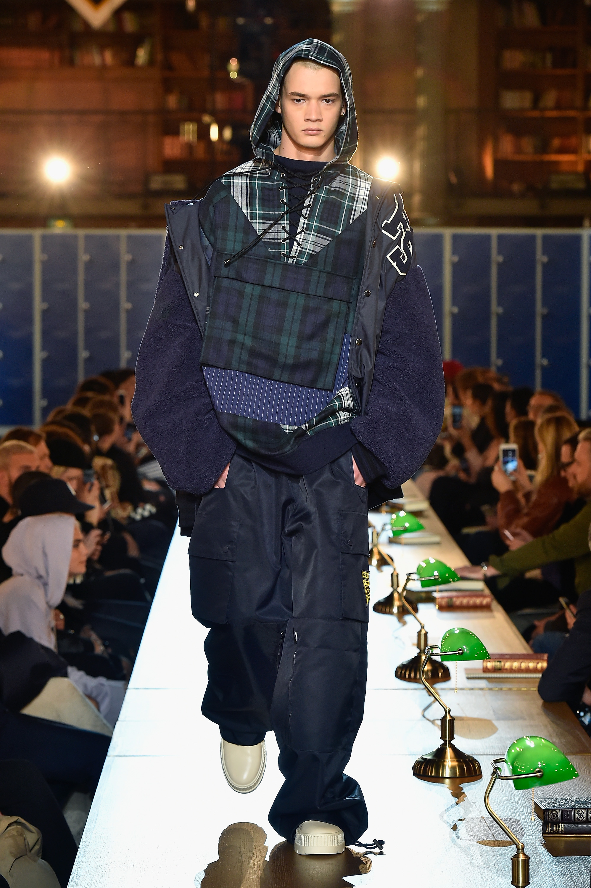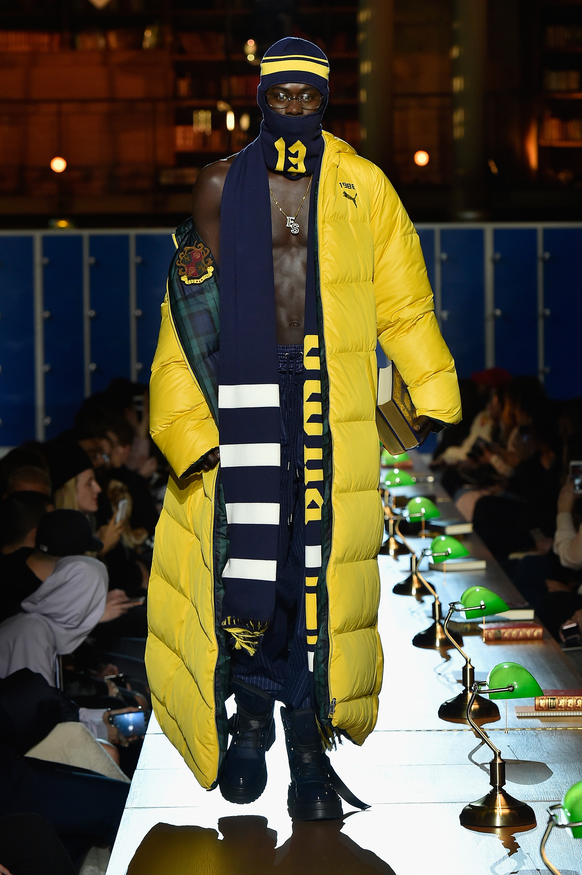 La fameuse PUMA Creeper a été revisitée avec des semelles compensées et des straps de cheville. Nouveaux talons, chaussures à semelles compensées translucides, bottes en caoutchouc, jambières et cuissardes ne manqueront pas d’impressionner le corps étudiant. Sacs peluche XXL, chapeaux et accessoires d’inspiration duvet, trousses de toilette et pochettes ont été vus au bras des mannequins, réchauffés par une sélection de chapkas chaudes et stylées, casquettes, cagoules, capuches, bonnets, bandanas et écharpes pour recrues de prestige. Pas question de ne pas être libre de ses mouvements, mais oui aux cravates en soie et ras du cou qui semblent taillés dans une veste de sport.