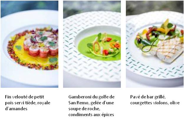 A la carte du chef Mathieu Emeraud cette année ? « Le fin velouté de petits pois servi tiède, royale d’amandes » ou les « Gamberoni du golfe de San Remo, gelée d’une soupe de roche, condiments aux épices » ou bien encore «le Pavé de bar grillé, courgettes violons, olive »
