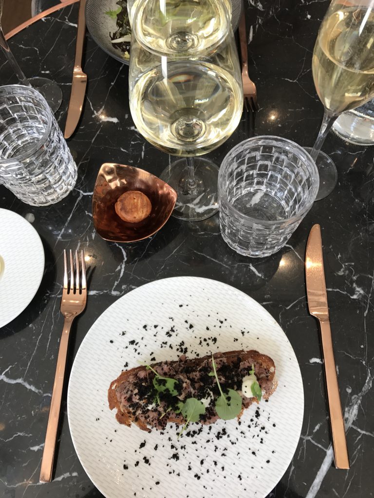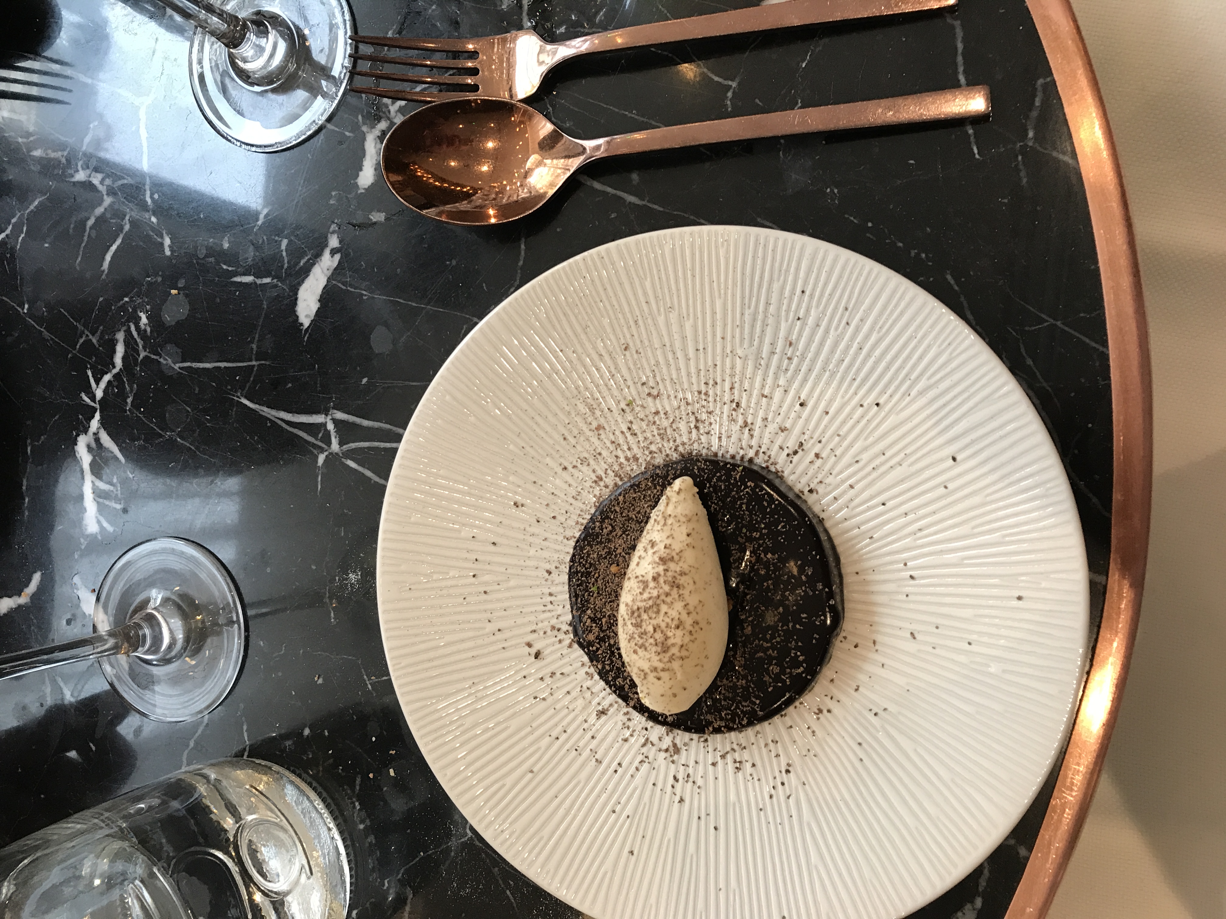 Au déjeuner, les formules sont malignes : une petite entrée imposée, un plat au choix entre viande et poisson du jour et un café / madeleine au miel. À la carte, les carottes rôties à la bergamote, cumin et noisettes jouent le croquant tandis que le velouté de châtaignes enrobe les tendres ravioles de potiron et comté. Le saumon mariné servi avec son quinoa joue l’acidulé grâce à la canneberge. En association terre/mer, la pluma ibérique accompagnée de topinambours s’acoquine avec les bulots en vinaigrette Pedro Rimenez. Pour les carnivores, l’épaule d’agneau de lait ou la côte de veau française, se découvrent avec leur chair moelleuse et délicatement assaisonnée – à partager de 2 à 4 personnes.
