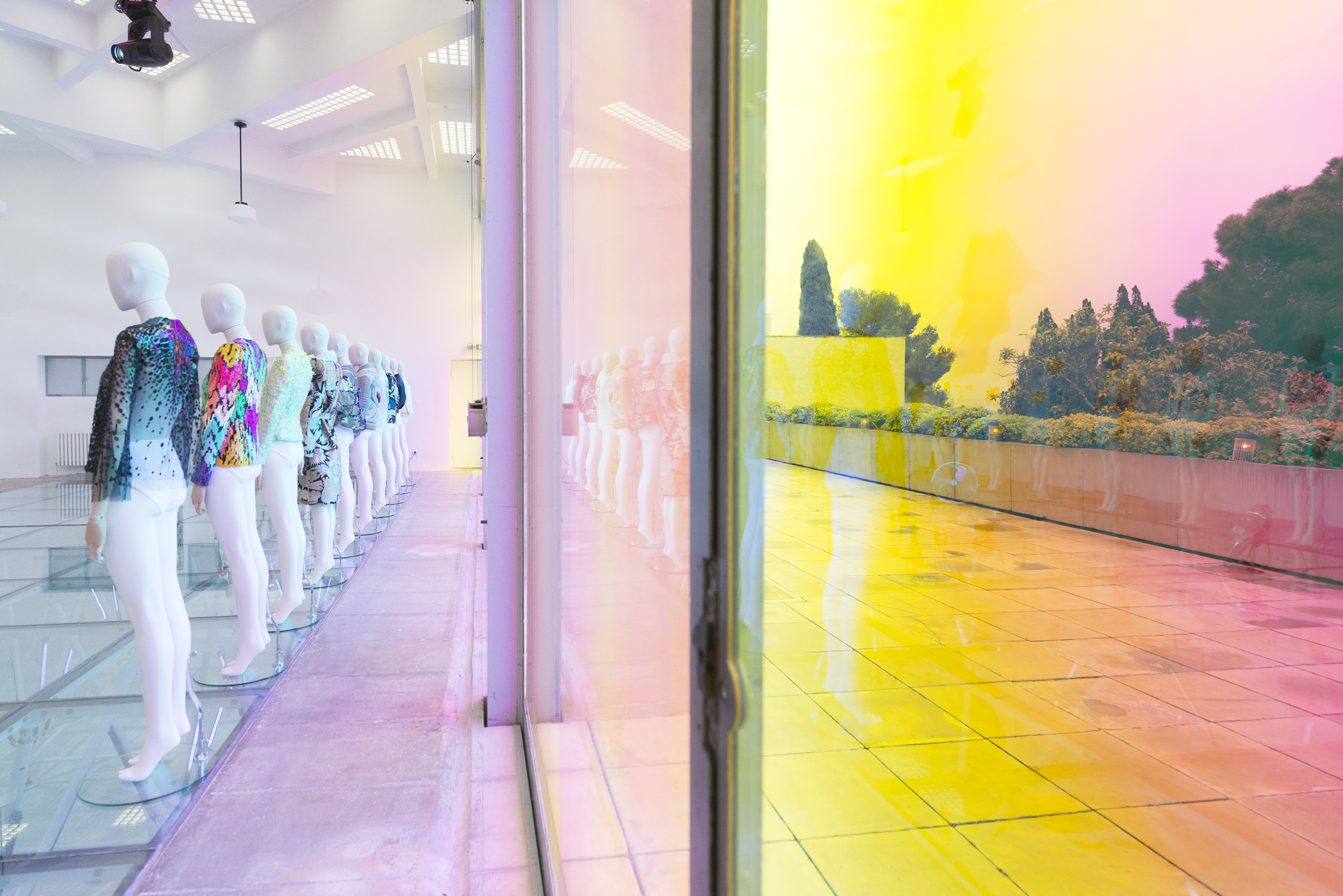 Unité de lieu et d’espace, mais pas de temps – Mises en scène, les vestes Schiaparelli sont des personnages contemporains dont les rôles créent un parallèle avec les films tournés par Man Ray ou Dali en noir et blanc dans la piscine il y a presque 90 ans. Aujourd’hui, ce sont des saynètes dont les thèmes sont aussi variés qu’éclectiques. Les toiles arachnéennes inspirées de Louise Bourgeois, les profils en tête-à-tête inspirés de Jean Cocteau et la sensualité pop de Guy Bourdin côtoient zodiac, soleils, palmiers d’or, iris et autres cœurs transpercés.