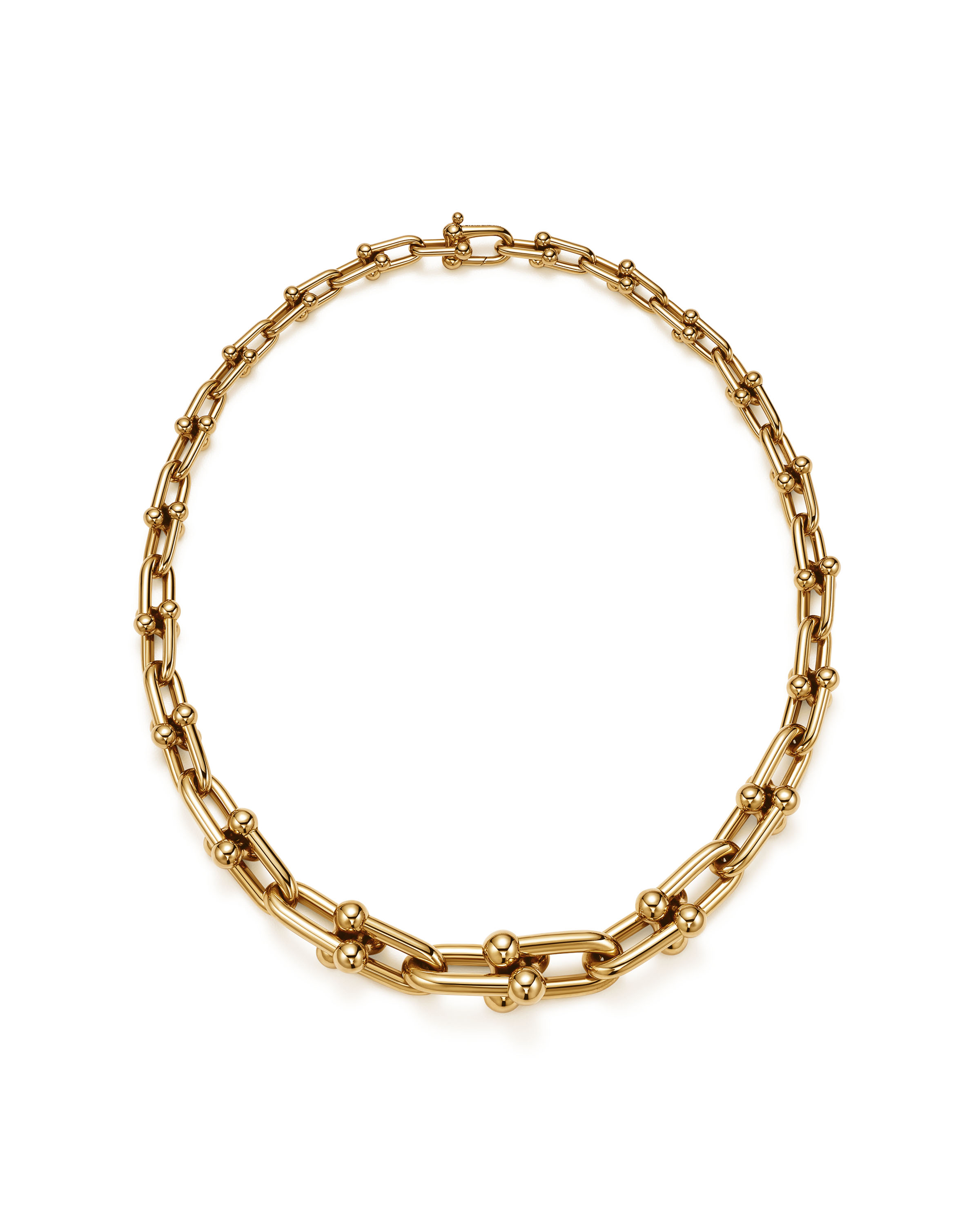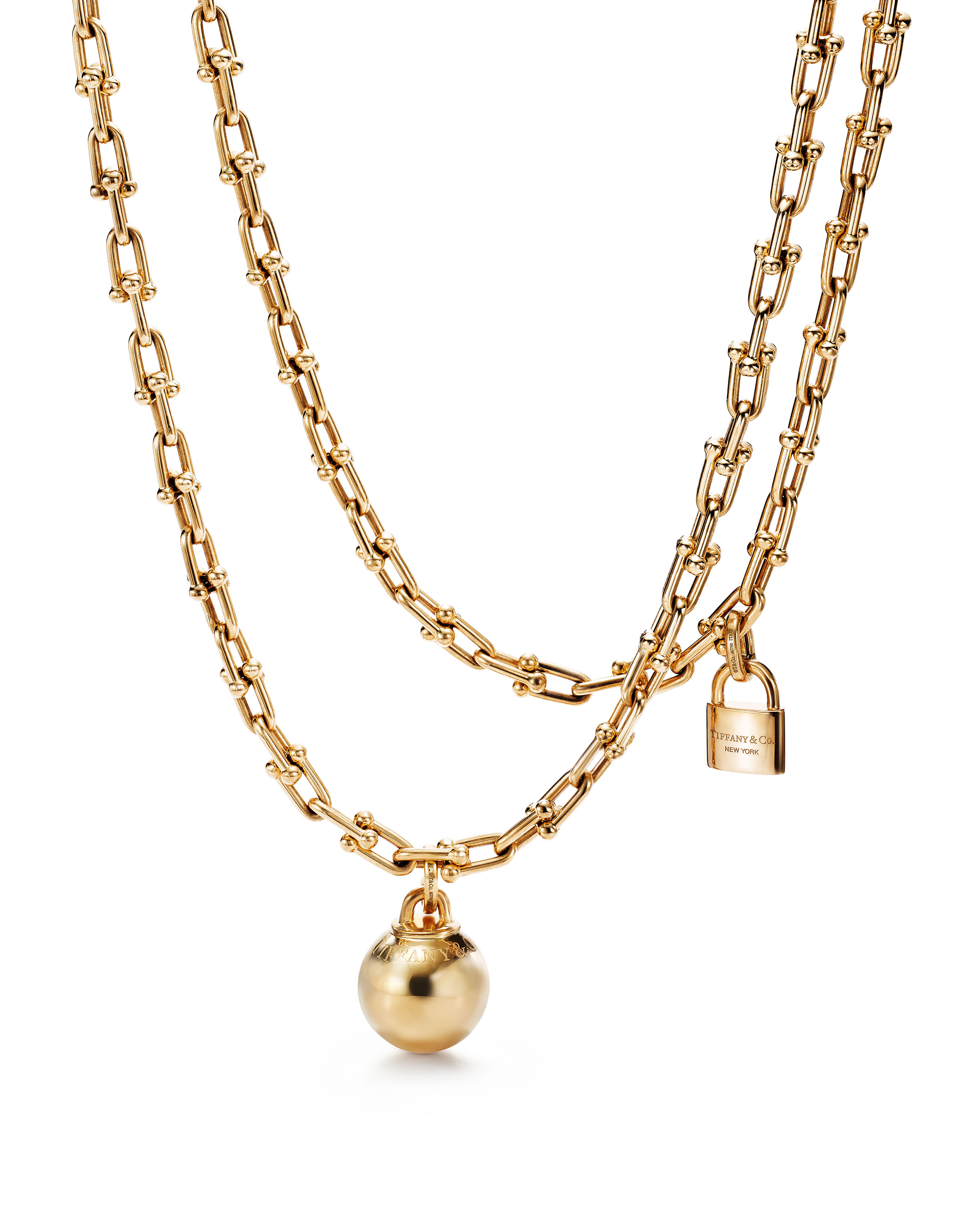 Les pièces métalliques reflètent le style industriel de la ville. Les maillons de chaînes au cœur de cette collection graphique mettent en scène la pureté et la simplicité des formes des maillons industriels. La collection se compose notamment d’un collier en or jaune 18 carats composé de maillons en mouvement constant. Une réinterprétation du design original a été magnifiée par un cadenas détachable et une sphère amovible afin qu’il puisse se porter de différentes manières. Le fermoir unique des triples pendants d’oreilles donne un design parfaitement symétrique.