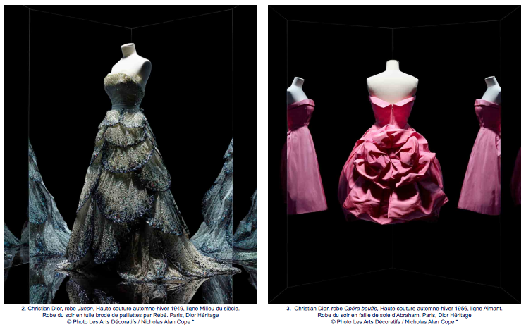 Les savoir-faire et la technique, sans lesquels la haute couture ne saurait exister, sont mis en scène dan s un atelier où des ouvrière s sont à l’ouvrage, entourées de mannequins de couturières, de croquis et de toiles. Une galerie propose un résumé de l’évolution de la ligne et de l’allure Dior depuis 1947, illustrée de robes et d’extraits de films ou de vidéos de défilés. Le parcours s’achève dans le cadre somptueux de la nef, décorée telle une salle de bal pour une présentation des robes du soir les plus fastueuses, parmi lesquelles brillent de nombreuses créations réunies pour la première fois à Paris. Certaines ont été portées par des clientes célèbres qui ont contribué au rayonnement de la maison Christian Dior, de la princesse Grace de Monaco à Lady Diana , de Charlize Theron à Jennifer Lawrence. Révélation inédite, résulta t de recherches menées pour ce projet, parmi ces toilettes de grand bal figure une robe baptisée Soirée brillante qui a défilé du temps de Christian Dior au musée des Arts décoratifs en novembre 1955. à l’occasion d’une exposition présentant les grands ébénistes français du XVIIIe siècle , Christian Dior comptait au nombre des prêteurs, et l’inauguration prit la tournure d ’ un événement culturel, mondain et élégant grâce à la présence de ses propres créations. Ce jour-là, des mannequins de la maison Dior déambulaient en robe du soir, prenant la pose parmi les meubles et objets d’art. Une façon d’affirmer, en ce mercredi 30 novembre 1955, la place naturelle qu’occupent les ornements de la féminité au cœur des arts appliqués et le rôle prépondérant joué par Christian Dior dans l’histoire des arts décoratifs. Pour cet ambitieux projet, la plupart des œuvres présentées sont issues du fonds Dior Héritage, le plus souvent jamais vues à Paris, auxquelles s’ajoutent les prêts exceptionnels provenant des collections du musée des Arts décoratifs et de l’Union française des Arts du costume, du Palais Galliera, du Costume Institute au Metropolitan Museum of Art de New York, du Victoria and Albert Museum de Londres, du De Young Museum de San Francisco, de la Fondation Pierre Bergé-Yves Saint Laurent, du Museum of London, du musée Christian Dior de Granville, ainsi que des œuvres d’art prestigieuses, de tout temps et de toute époque, provenant des collections du musée du Louvre, du musée d’Orsay et du musée de l’Orangerie, du Château de Versailles , du Centre Pompidou , du musée des Arts décoratifs et de nombreuses collections particulières.