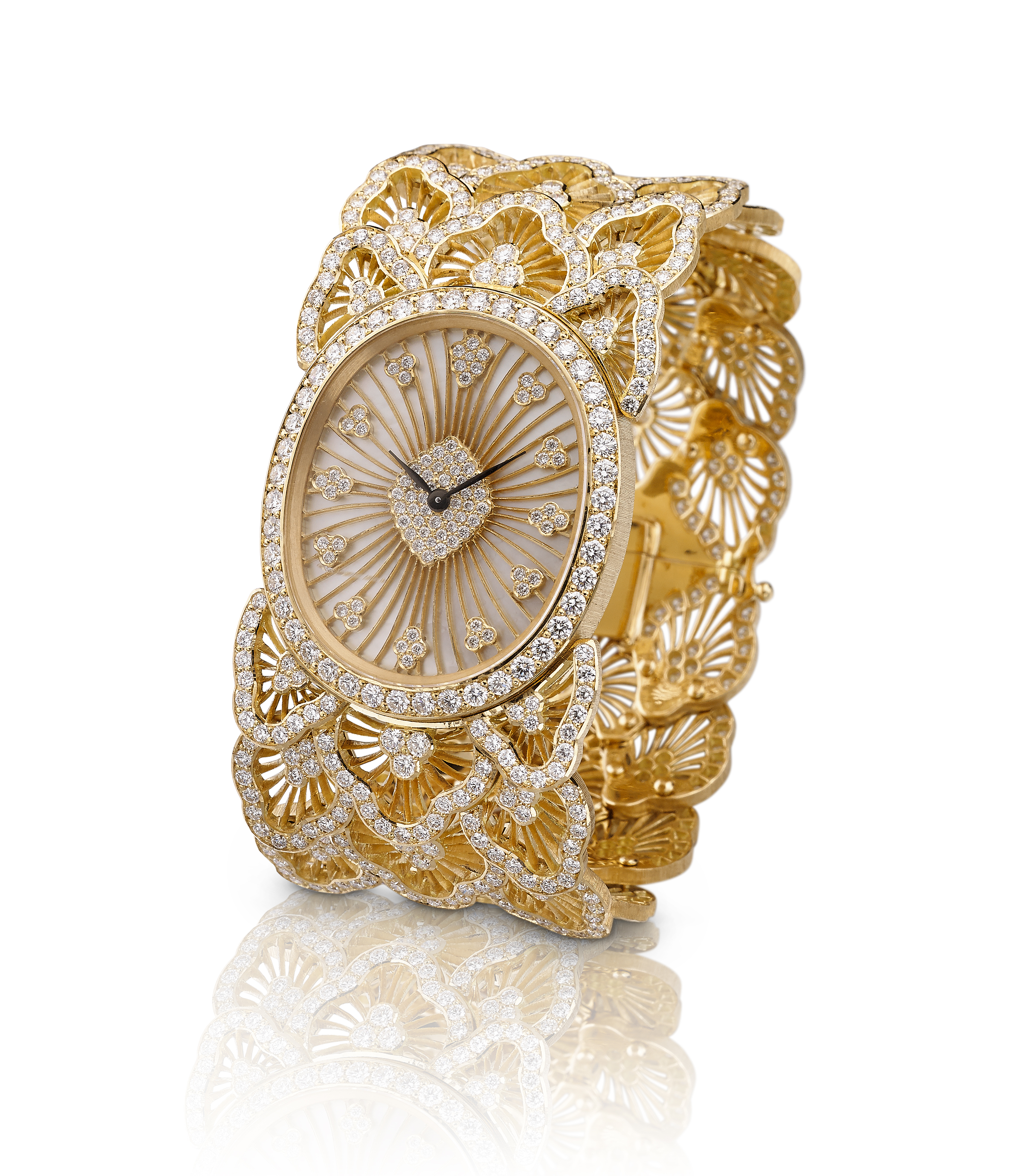 Grand adepte de la technique « tulle », Buccellati la représente une fois encore dans cette pièce sensationnelle. Inspiré du logo de la maison, ce bracelet-montre est une combinaison parfaite de génie créatif joaillère et de technique horlogère.