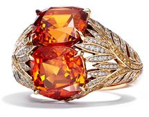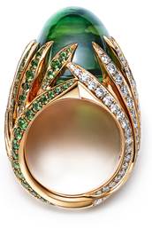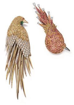 Les couleurs et les formes saisissantes des oiseaux exotiques sont évoquées à travers les pièces appelées Oiseaux Merveilleux. Les pierres précieuses qui recouvrent les plumes reproduisent le mouvement des battements d’ailes – chaque partie se courbe et tombe en cascade pour souligner la complexité de ces oiseaux. Une manchette à charnière capture l’instant où un oiseau se repose sous son aile de pierres précieuses en saphirs jaunes et bleus et en spessartites sur une structure en or rose 18 carats qui met en avant l’irisation colorée des plumes. Une rare et magnifique tourmaline elbaïte ovale de 13 carats est la pierre centrale d’une bague qui est d’une clarté exceptionnelle compte tenu de sa taille. Une broche représentant un oiseau exotique est composée de tourmalines et saphirs sur une structure en platine est également sertie d’une tourmaline elbaïte au sommet et d’une queue flexible aux allures de ruban serti de saphirs taille poire.
