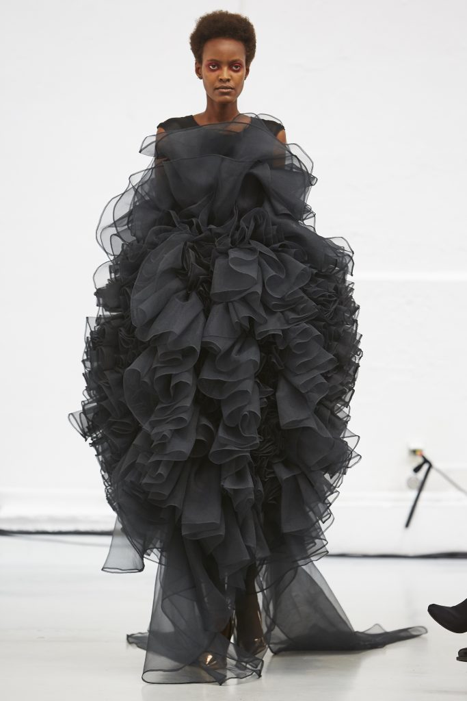 Si la douceur et la légèreté ont dit non à l’opulence, elles éclatent comme des pivoines au soleil laissant derrière elle des couches de tulle. À chaque saison ses fleurs: chez XUAN elles sont faites de cuir où s’accrochent sur les épaules. Des robes dans des couleurs plus sombres qui ramène quelque peu en Amérique. Cette fois celle de la nouvelle Orléans ou l’habillement est de rigueur en toutes circonstances et fait partie de rites. Noir profond mais plein d’espoir, coiffé de grands chapeaux qui viennent dire le respect du raffinement, pour des collections faite dans la majeure partie en France.