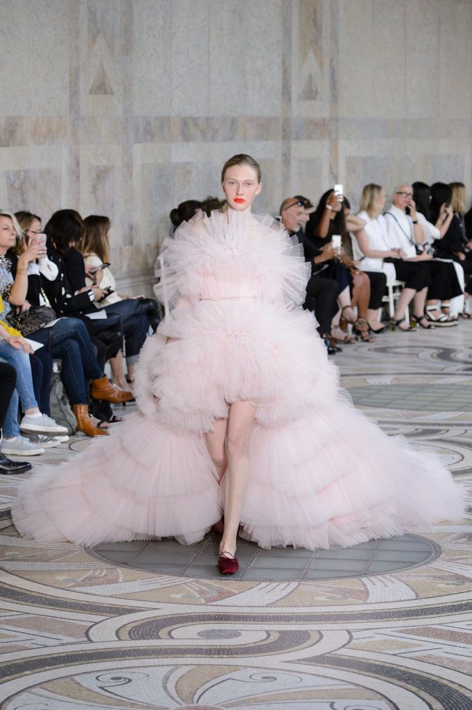 Chez Giambatitista Valli les couleurs poudrées, transcendées par des jaunes solaires drapent les mannequins. Une collection fleurie, telle l’annonce de l’éclosion d’un nouveau partenariat: Giambatitista Valli a signé un accord avec Artémis, la société d’investissement du groupe de luxe Kering. ( François Pinault)