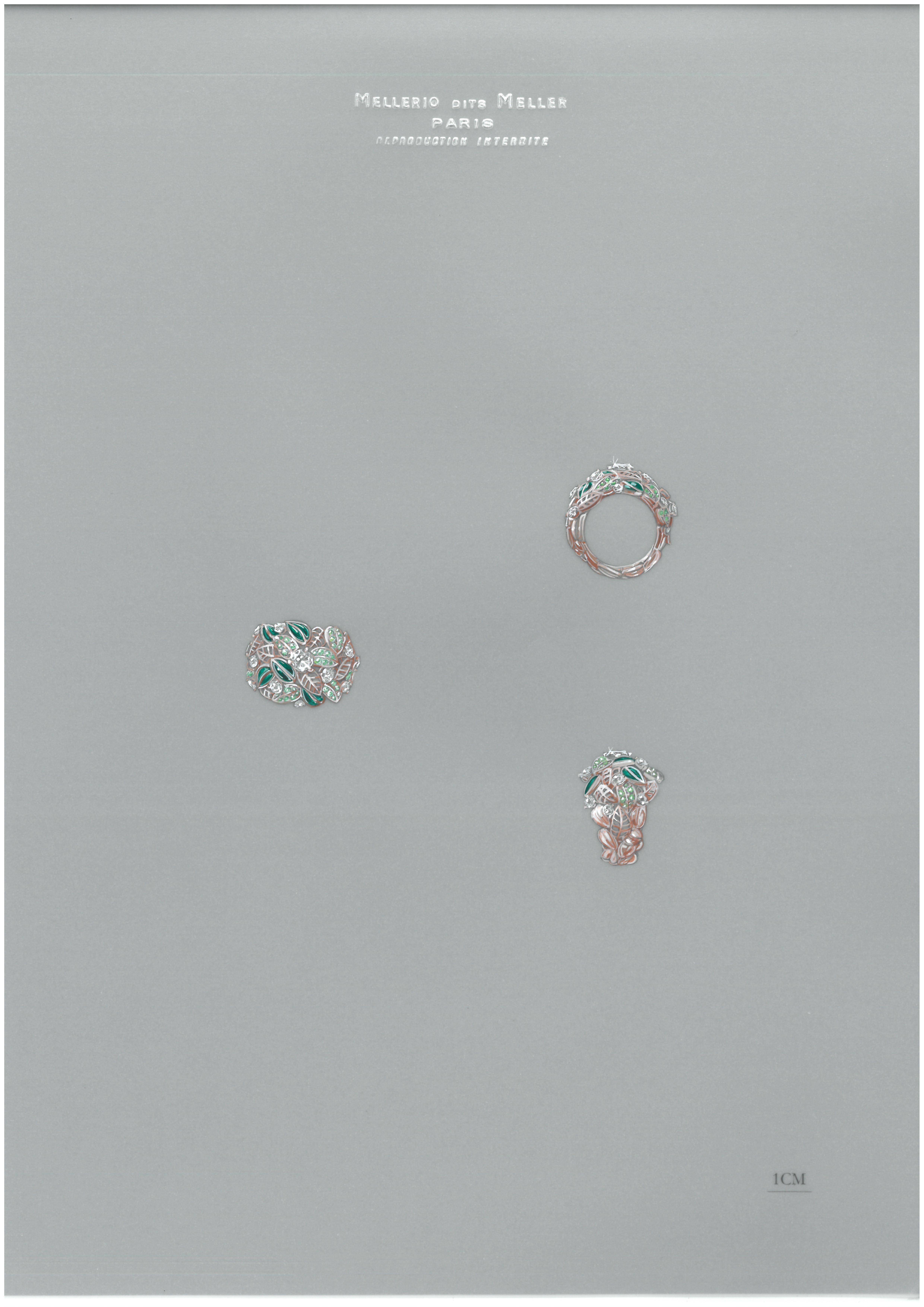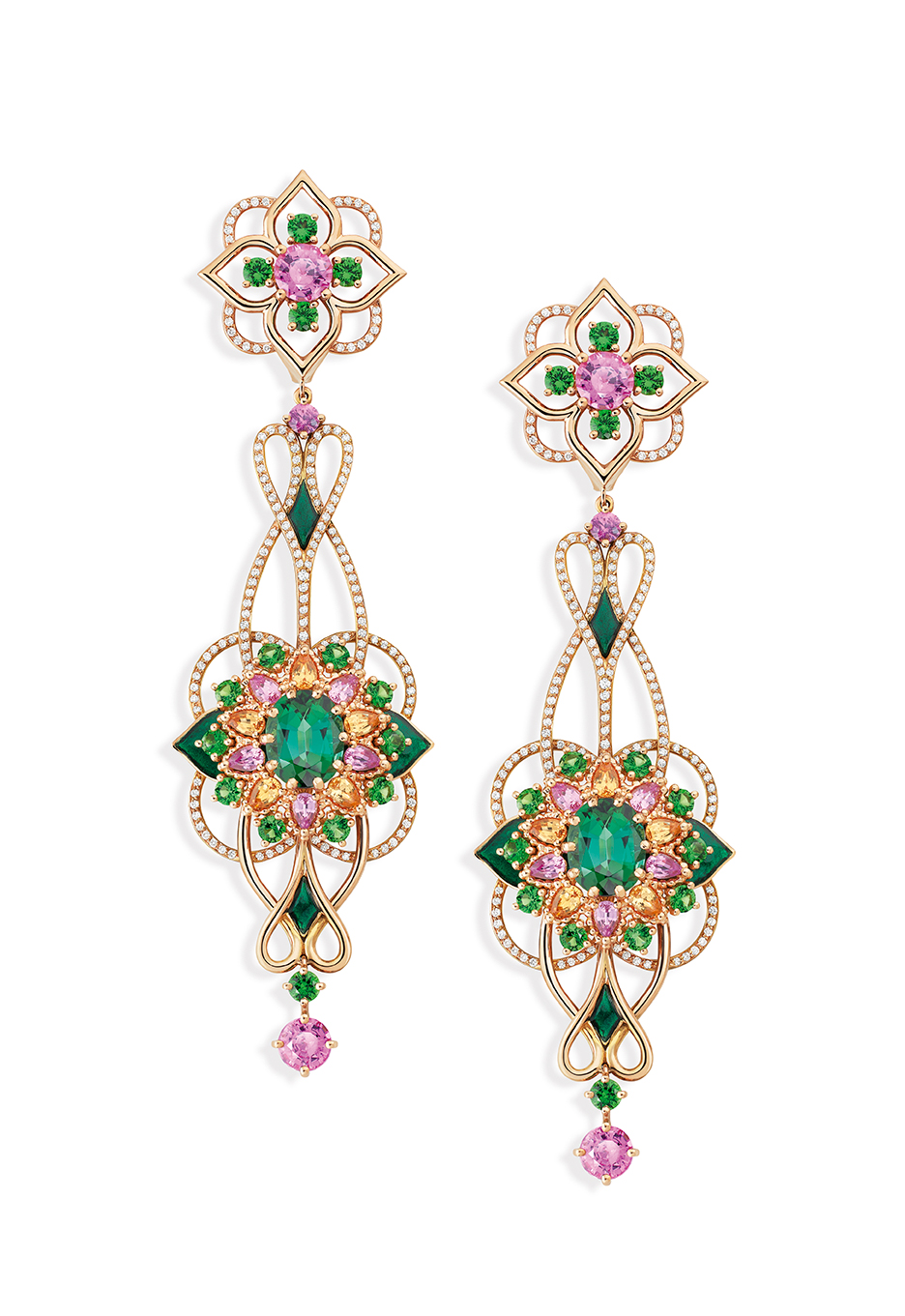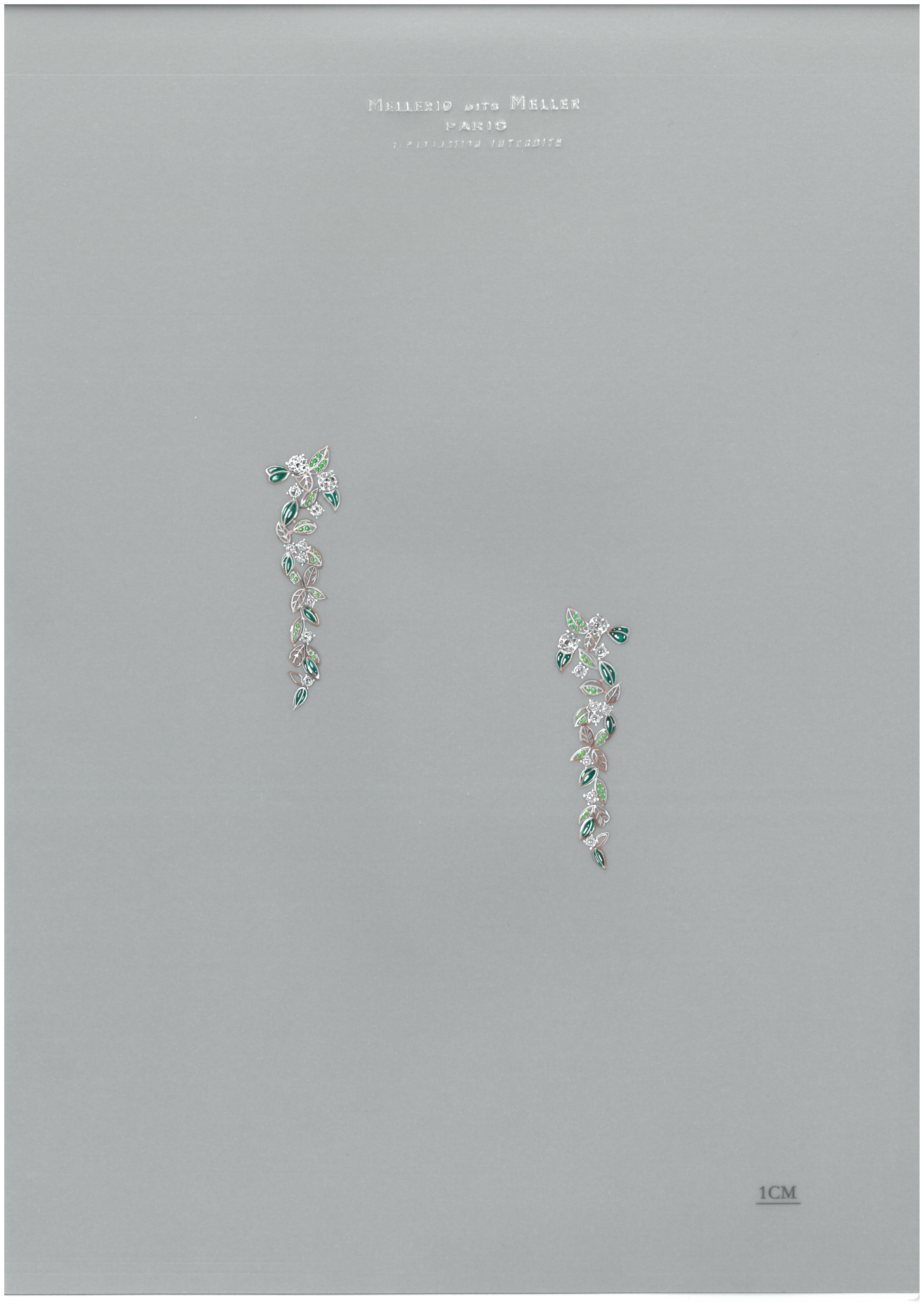 Cette ligne fut imaginée en référence aux nombreux buissons de feuilles qui jalonnent les jardins d’Isola Madre. La structure des pièces est complètement ajourée afin de symboliser la lumière qui se reflète sur leurs feuilles, et permet ainsi d’entrevoir la peau tout en délicatesse. Le volume de la bague, en « boule », a été choisi pour représenter celui des buissons foisonnants de l’île. Les trois matières et techniques utilisées, ainsi que les différents axes selon lesquels sont placées les feuilles, restituent leurs différentes teintes de vert: les facettes des tsavorites contrastent avec le vert opaque de l’émail et la transparence des feuilles en or repercé. Le tout est éclairé par les diamants brillants.Les boucles d’oreilles, dont les pendants sont détachables afin de pouvoir porter seulement la partie haute sur le lobe de l’oreille, évoquent les nombreux bijoux « en pluie » que Mellerio a créés au XIXème siècle. Elles rendent également hommage au célèbre cyprès du cachemire du jardin d’Isola Madre, dont les ramures semblent vouloir rejoindre la terre.