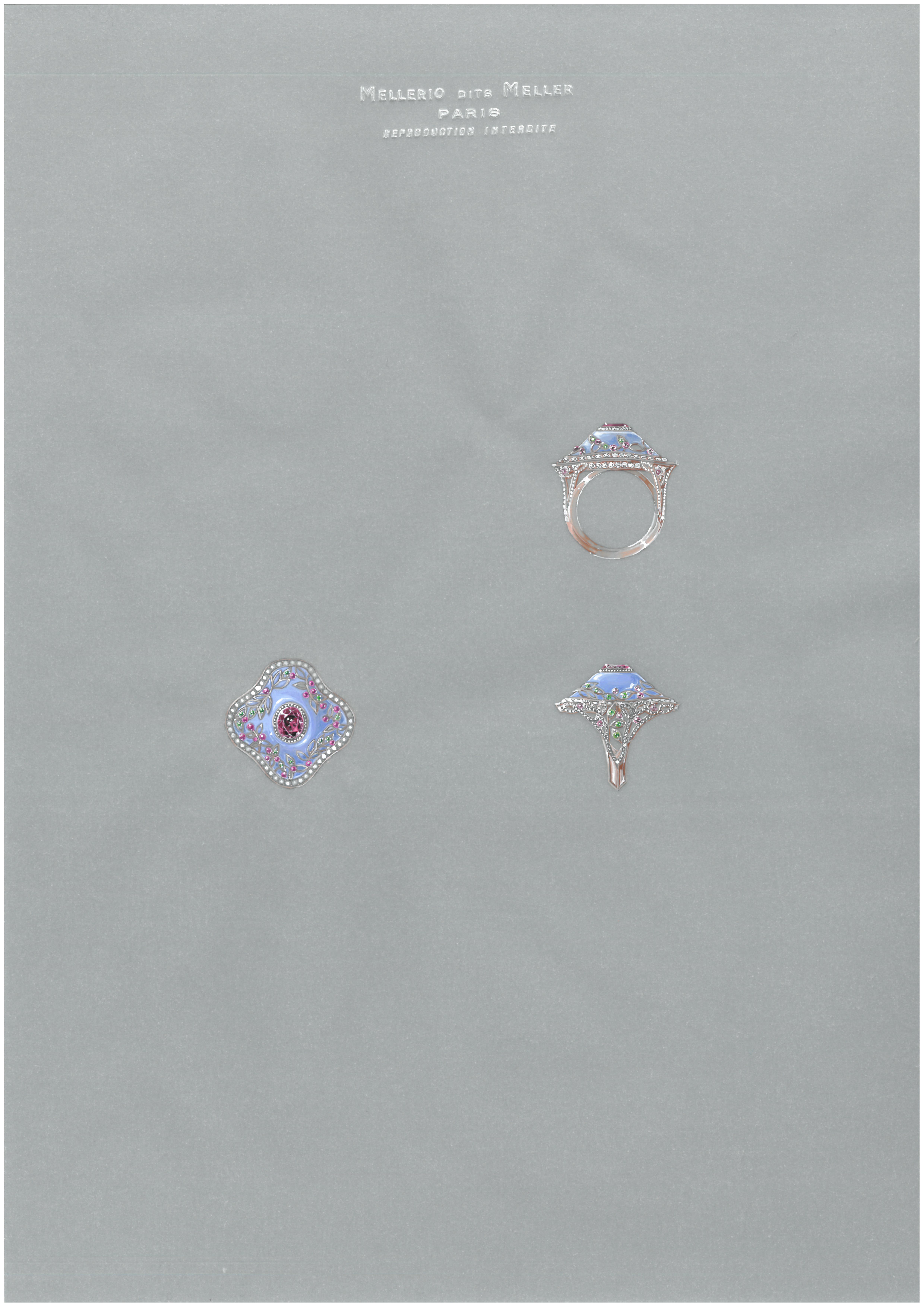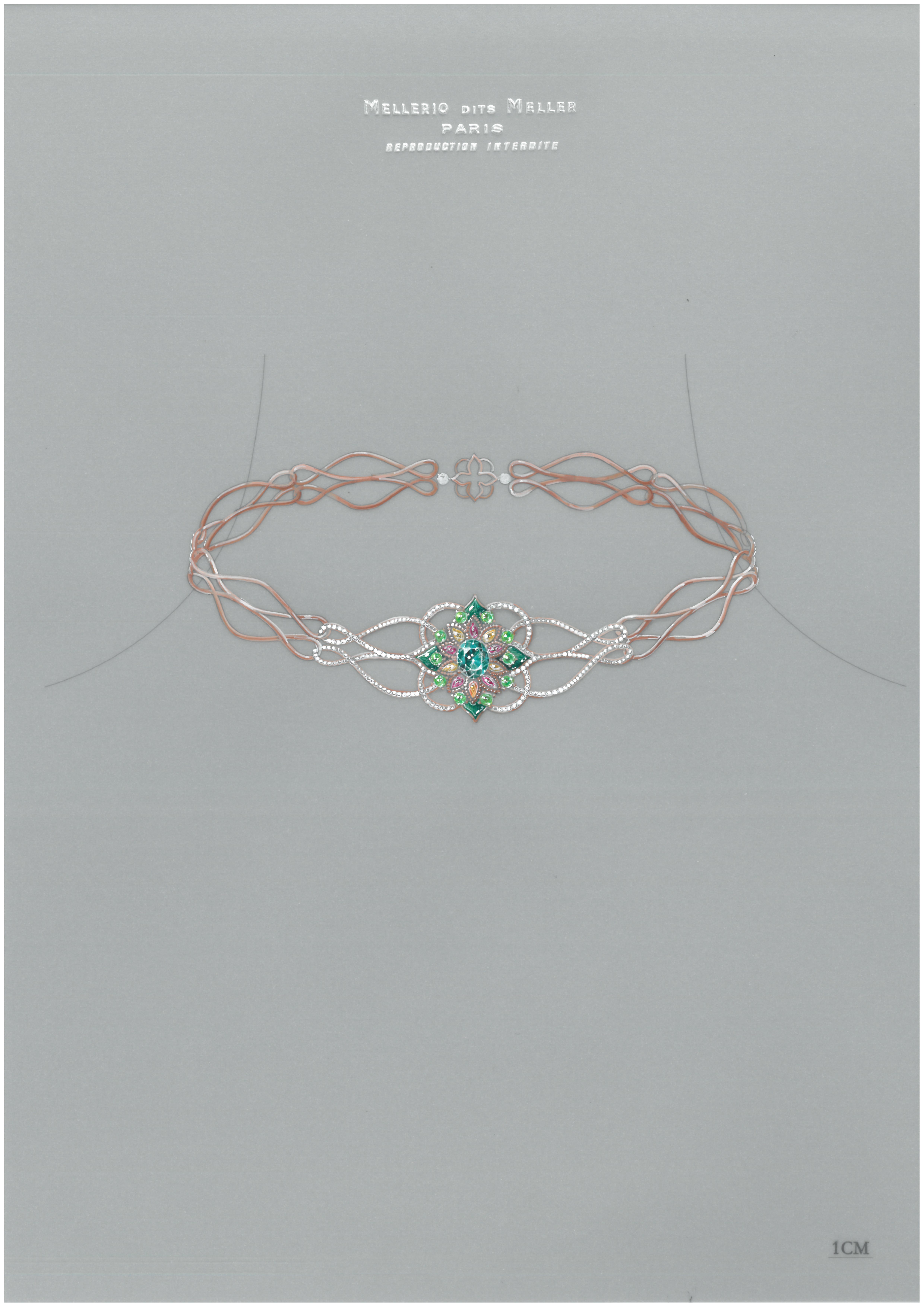 Cette parure fut au départ inspirée par une bague ancienne, aujourd’hui disparue, qui appartenait à la famille maternelle de Laure-Isabelle Mellerio. Celle-ci était en émail, avec une émeraude au centre.Le vert étant sa couleur préférée, et celle de Mellerio, cette parure en propose de multiples nuances : les reflets turquoise, vert clair, parfois presque jaunes des tourmalines, la couleur vert gazon des tsavorites et le vert profond de l’émail.Comme la lumière dorée d’un soir d’été dans les jardins d’Isola Madre, le grènetis d’or illumine chacune des trois pièces et nous guide tel un chemin de galets entre les massifs de buissons fleuris et les arbres exotiques. L’ensemble, délicatement serti sur un fond d’émail dont les motifs du guillochage (sur la bague) évoquent l’ondulation de l’eau, rappelle également les célèbres marqueteries de pierres italiennes.Le délicat entrelacs des boucles d’oreilles, qui ne manque pas d’évoquer le style en vogue au début du XIXème siècle, est inspiré d’un dessin des années 1830 issu des archives de Mellerio. Là encore, le contraste des couleurs profondes et vives leur confèrent une élégance toute italienne.Le collier, qui se porte au ras du cou, constitué de fils d’or rose tirés à la main et alternativement pavés de diamants, épouse le cou avec délicatesse et légèreté, grâce à un emmaillement spécifiquement étudié. Il peut se porter seul ou avec son motif central, qui peut lui aussi se transformer et se porter en broche ou en pendentif.