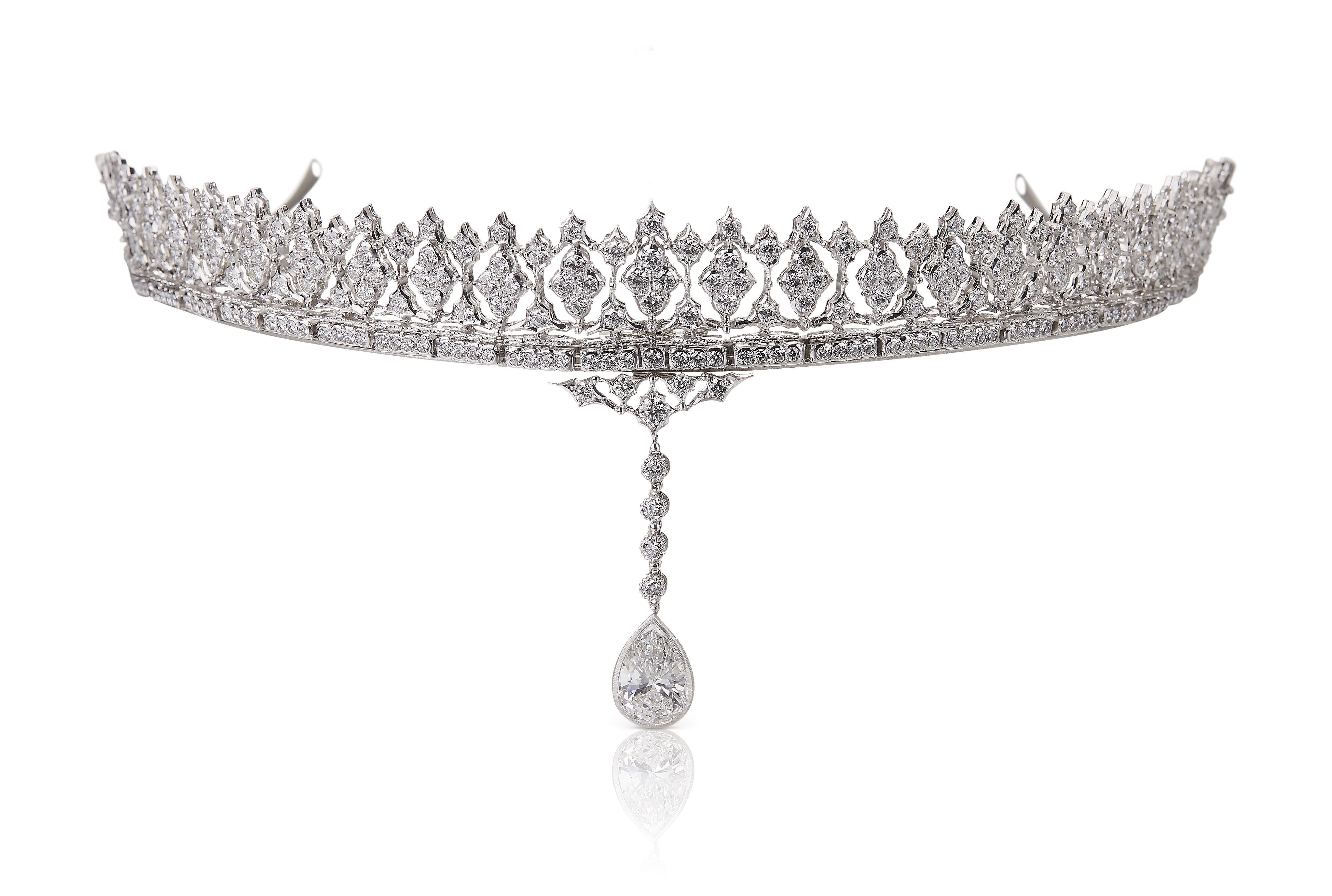 Tiare Carlotta Buccellati collection Romanza en or blanc gravé, 357 diamants taille brillant 15, 93 cts et un diamant poire de 4, 22 cts, pièce unique